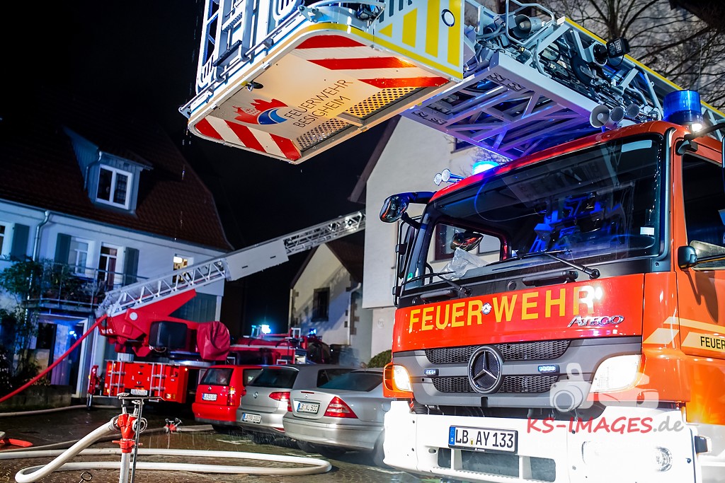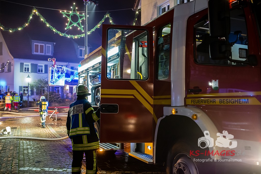 BESIGHEIM: Am Silvesterabend brach gegen 18 Uhr aus bislang unbekannter Ursache in der Altstadt von Besigheim ein Brand im Gebäude des ehemaligen Polizeipostens aus. Zur Brandbekämpfung waren die Feuerwehren von Besigheim, Bietigheim sowie Walheim mit insgesamt zehn Fahrzeugen sowie 60 Einsatzkräften im Einsatz. Zum Zeitpunkt des Brandausbruches war eine Bewohnerin mit ihrem 12-jährigen Kind zu Hause. Beide konnten das Mehrfamilienhaus mit Schuppen rechtzeitig unverletzt verlassen, so dass der alarmierte Notarzt mit Rettungsfahrzeug nicht eingreifen musste. Für Absperrmaßnahmen hatte das Polizeipräsidium Ludwigsburg bis zu sieben Streifenwagenbesatzungen entsandt. Der Brand ist inzwischen weitgehend gelöscht, jedoch werden die Nachlöscharbeiten voraussichtlich noch mehrere Stunden andauern. Sowohl zur Brandursache als auch zur Schadenshöhe können noch keine Angaben gemacht werden. Die Ermittlungen dauern an. Kreisbrandmeister Andreas Dorroch und erster Bürgermeister Steffen Bühler waren vor Ort, um sich ein Bild von der Lage zu machen. Die Wohnungen des Gebäudes sind aktuell nicht mehr bewohnbar, weshalb die Bewohner anderweitig untergebracht wurden.