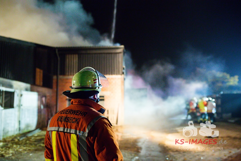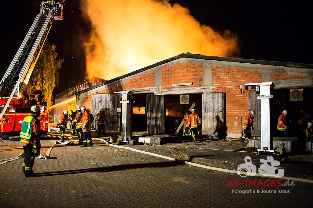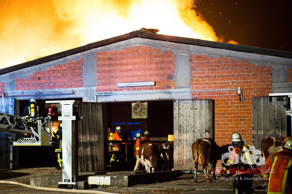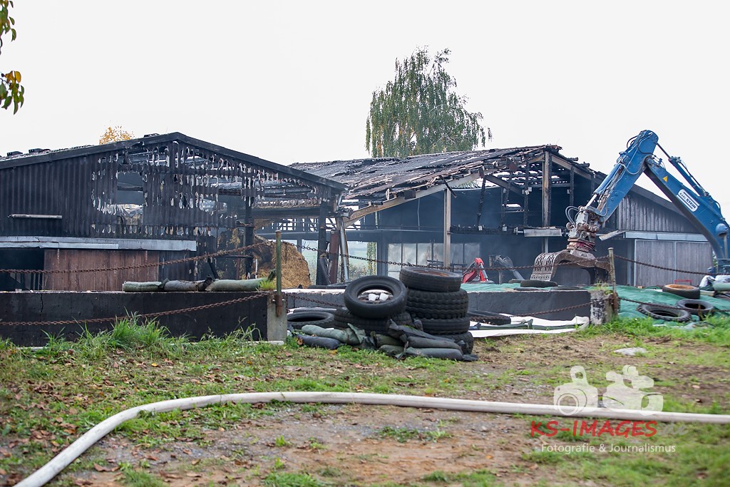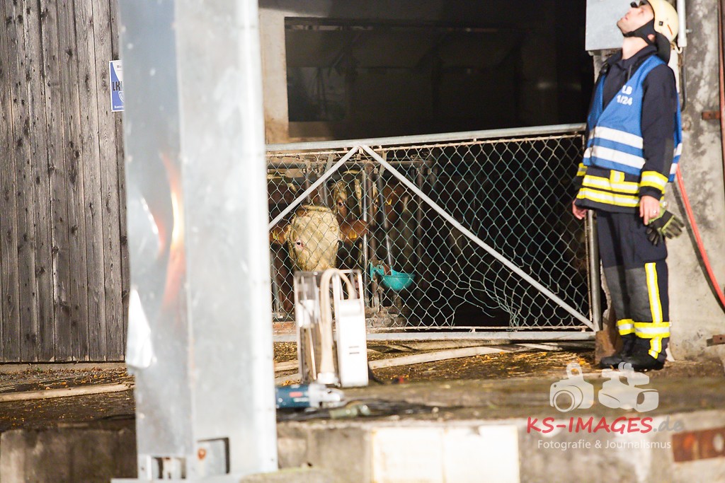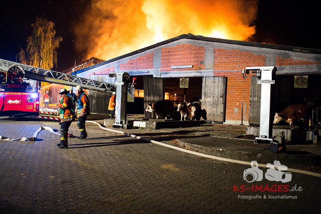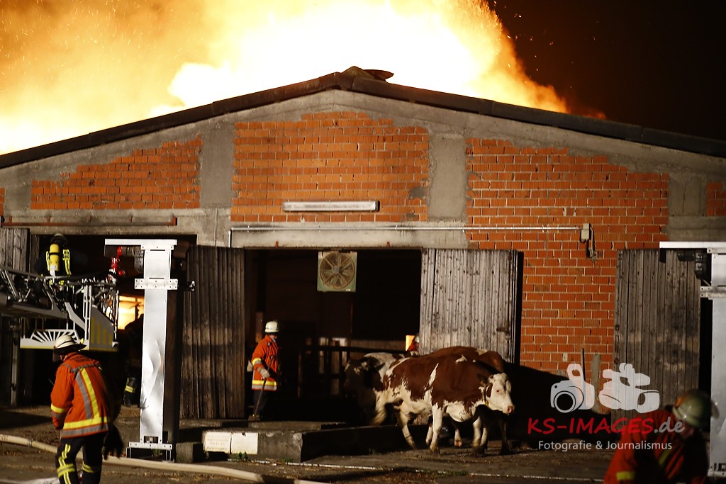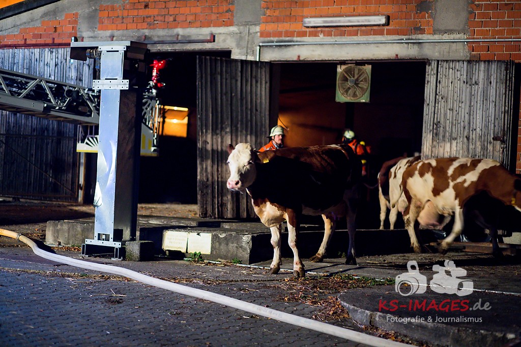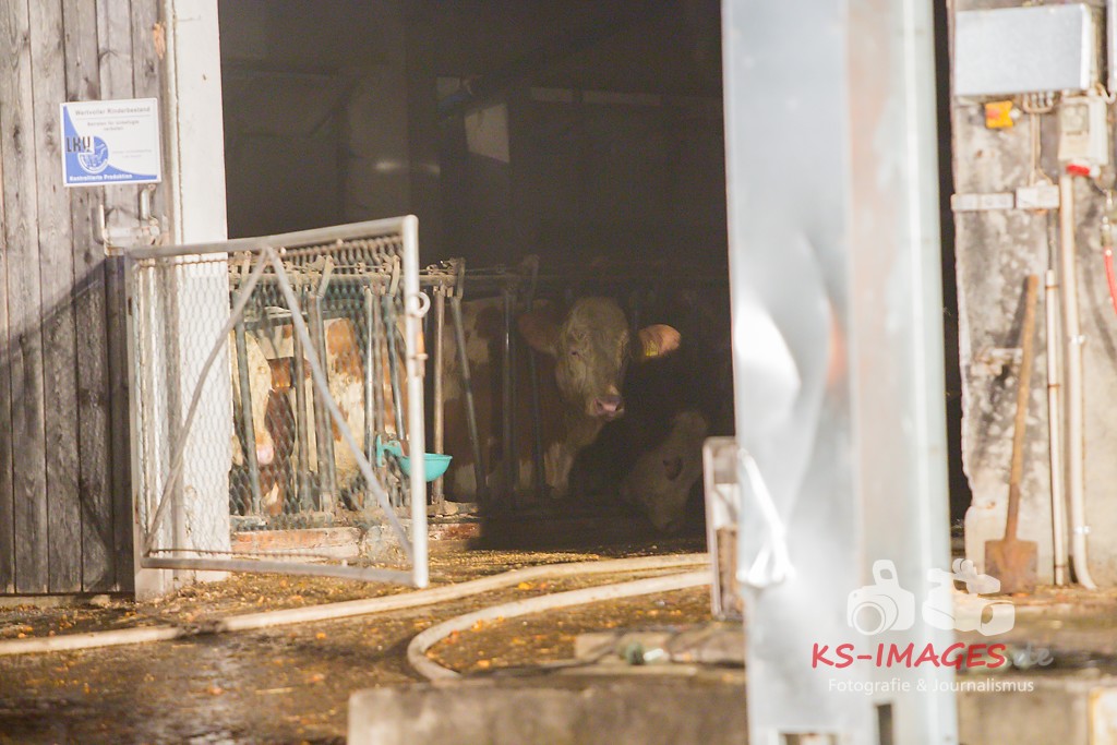 0								REMSECK: – Am Samstag wurde gegen 22.00 Uhr der Brand einer Maschinenhalle auf einem Aussiedlerhof in der Lembergstraße festgestellt. Beim Eintreffen der Einsatzkräfte hatte das Feuer zwischenzeitlich auf die unmittelbar daneben befindliche Stallung übergegriffen. Zu diesem Zeitpunkt befanden sich dort ca. 100 Rinder. Durch das rasche Eingreifen der Einsatzkräfte und den Verantwortlichen wurden die Tiere in ein Bodensilo getrieben und nahmen dort keinen weiteren Schaden. Ein Rind setzte sich jedoch von der Herde ab und beschädigte auf der Flucht auf ein angrenzendes Freigelände ein Einsatzfahrzeug der Feuerwehr. Das Tier konnte trotz aller Bemühungen nicht wieder eingefangen werden und musste vom Jagdpächter erlegt werden. Der Kreisbrandmeister und die Feuerwehren Ludwigsburg, Remseck, Marbach, Kornwestheim und Affalterbach waren mit 27 Fahrzeugen und etwa 120 Wehrleuten vor Ort. Zur Räumung des Brandortes musste ein Bagger hinzugezogen werden. Bei der Anfahrt blieb dieser in der Hochdorfer Straße an einem Freilandstromkabel hängen. Das abgerissene Stromkabel führte zu einem teilweisen Stromausfall in der nahen Umgebung. Der Bagger war dadurch nicht mehr einsatzfähig. Der Ersatzbagger musste mit einem Tieflader aus Freiberg angeliefert werden. Der Rettungsdienst war mit etwa dreißig Einsatzkräften vor Ort. Im Zusammenhang mit dem gesamten Einsatzgeschehen waren glücklicherweise keine Verletzten zu beklagen. Zur Absperrung der Bandörtlichkeit vor Schaulustigen sowie den erforderlichen Ermittlungen waren mehrere Einsatzfahrzeuge des Polizeireviers Kornwestheim und der Polizeipräsidien Aalen und Stuttgart eingesetzt. Der Sachschaden wird auf mindestens 600.000 Euro geschätzt. Nach bisherigem Ermittlungsstand wird von einer technischen Ursache als Brandursache ausgegangen.