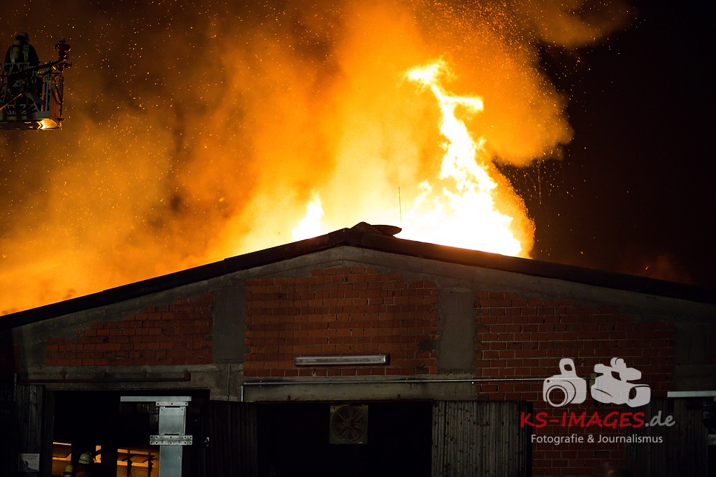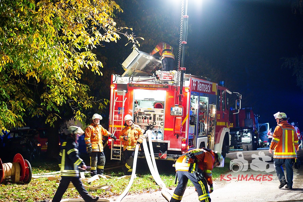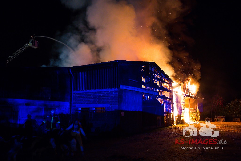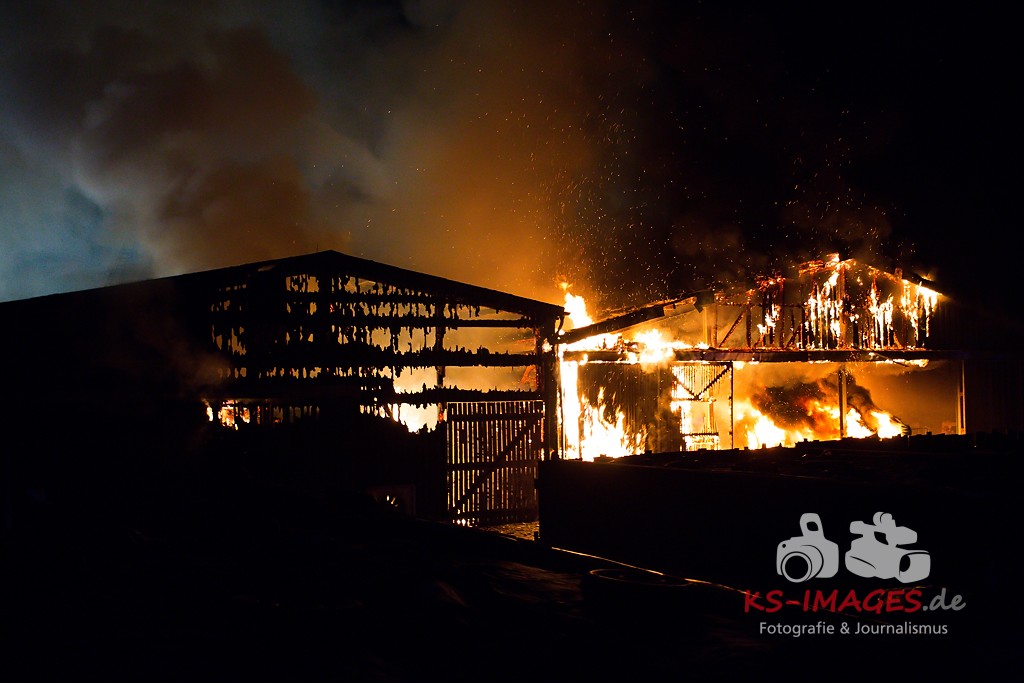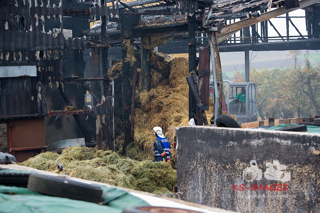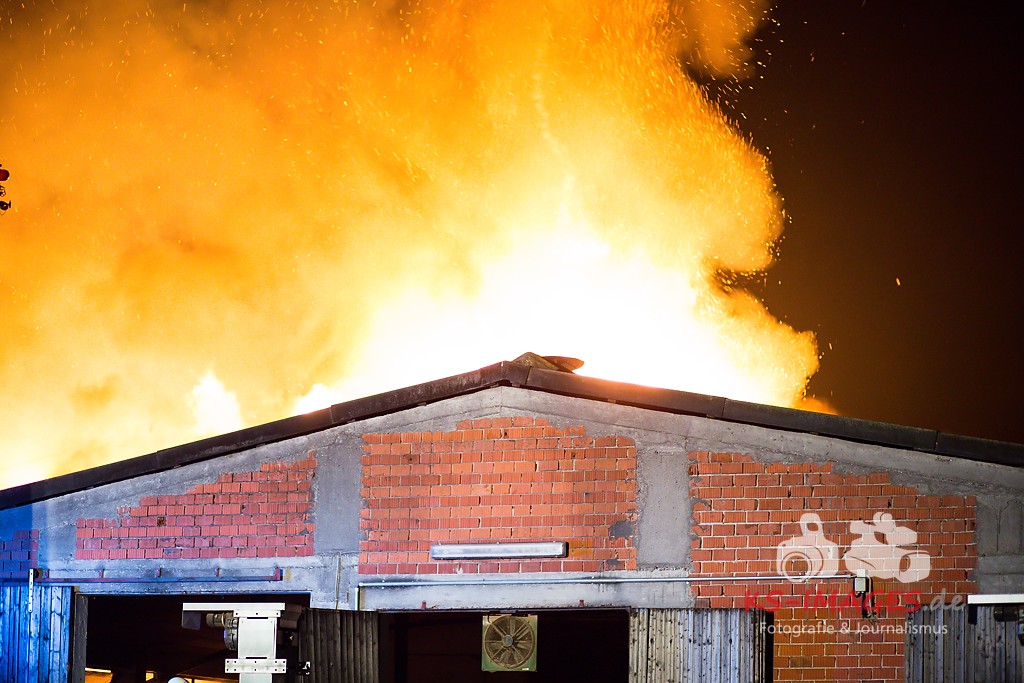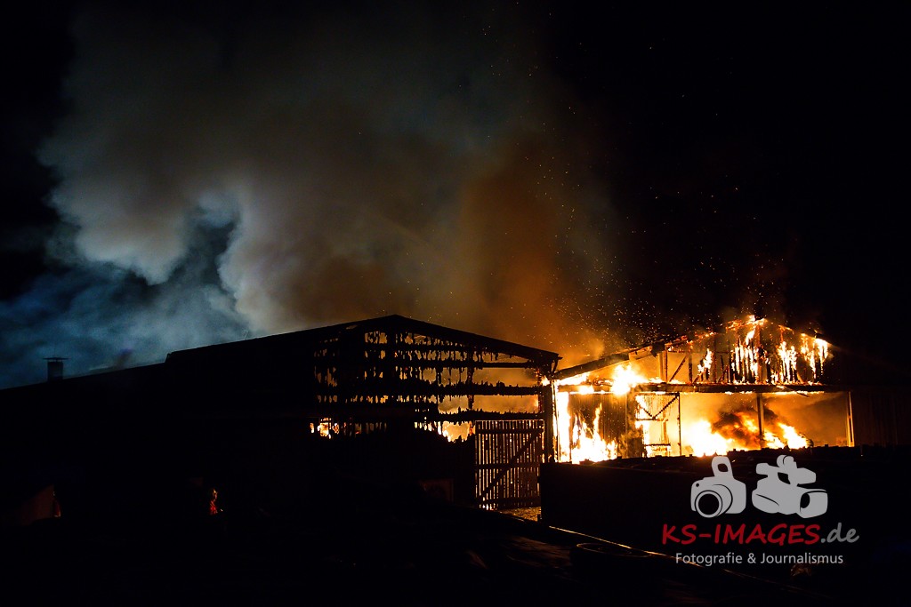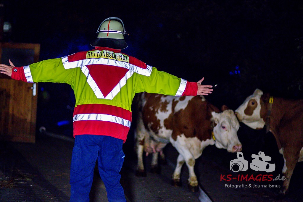 0								REMSECK: – Am Samstag wurde gegen 22.00 Uhr der Brand einer Maschinenhalle auf einem Aussiedlerhof in der Lembergstraße festgestellt. Beim Eintreffen der Einsatzkräfte hatte das Feuer zwischenzeitlich auf die unmittelbar daneben befindliche Stallung übergegriffen. Zu diesem Zeitpunkt befanden sich dort ca. 100 Rinder. Durch das rasche Eingreifen der Einsatzkräfte und den Verantwortlichen wurden die Tiere in ein Bodensilo getrieben und nahmen dort keinen weiteren Schaden. Ein Rind setzte sich jedoch von der Herde ab und beschädigte auf der Flucht auf ein angrenzendes Freigelände ein Einsatzfahrzeug der Feuerwehr. Das Tier konnte trotz aller Bemühungen nicht wieder eingefangen werden und musste vom Jagdpächter erlegt werden. Der Kreisbrandmeister und die Feuerwehren Ludwigsburg, Remseck, Marbach, Kornwestheim und Affalterbach waren mit 27 Fahrzeugen und etwa 120 Wehrleuten vor Ort. Zur Räumung des Brandortes musste ein Bagger hinzugezogen werden. Bei der Anfahrt blieb dieser in der Hochdorfer Straße an einem Freilandstromkabel hängen. Das abgerissene Stromkabel führte zu einem teilweisen Stromausfall in der nahen Umgebung. Der Bagger war dadurch nicht mehr einsatzfähig. Der Ersatzbagger musste mit einem Tieflader aus Freiberg angeliefert werden. Der Rettungsdienst war mit etwa dreißig Einsatzkräften vor Ort. Im Zusammenhang mit dem gesamten Einsatzgeschehen waren glücklicherweise keine Verletzten zu beklagen. Zur Absperrung der Bandörtlichkeit vor Schaulustigen sowie den erforderlichen Ermittlungen waren mehrere Einsatzfahrzeuge des Polizeireviers Kornwestheim und der Polizeipräsidien Aalen und Stuttgart eingesetzt. Der Sachschaden wird auf mindestens 600.000 Euro geschätzt. Nach bisherigem Ermittlungsstand wird von einer technischen Ursache als Brandursache ausgegangen.