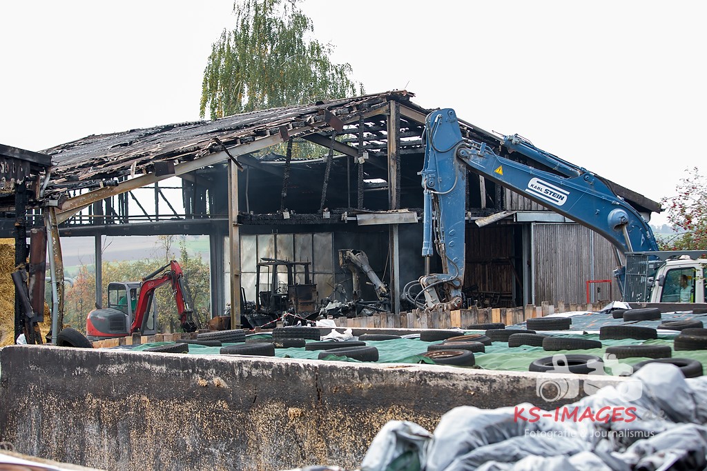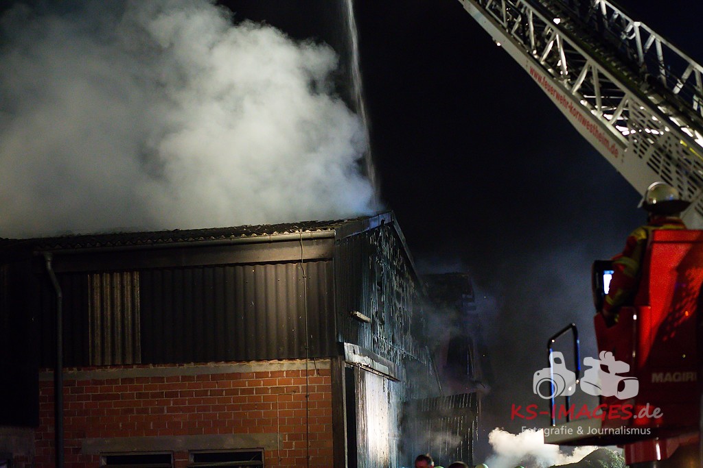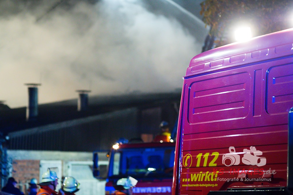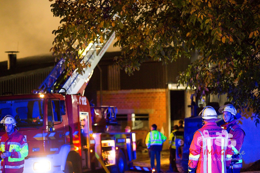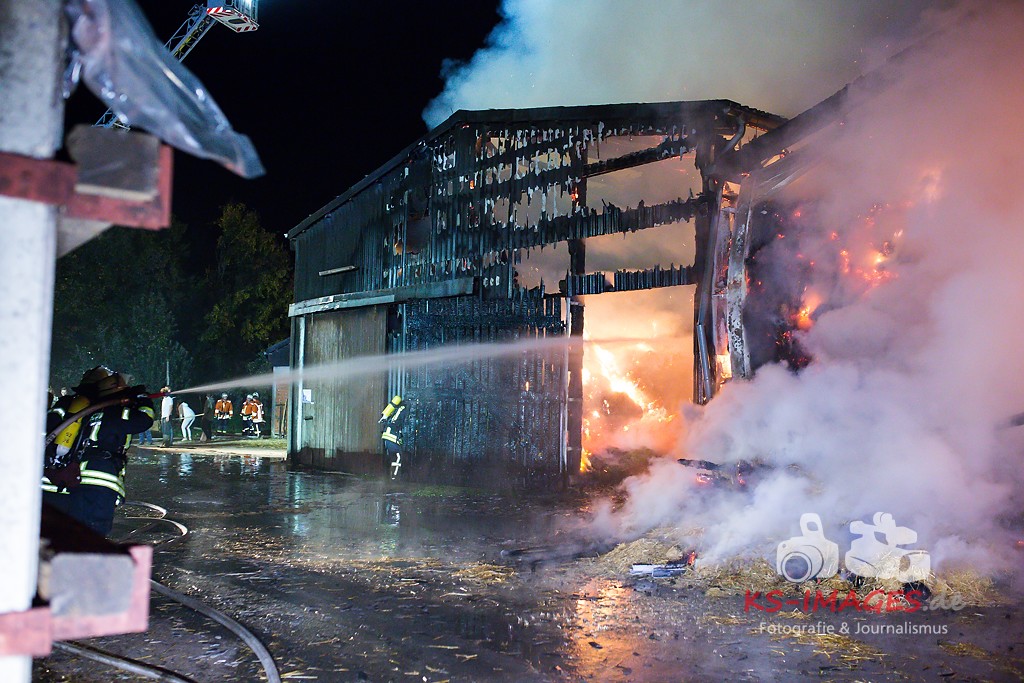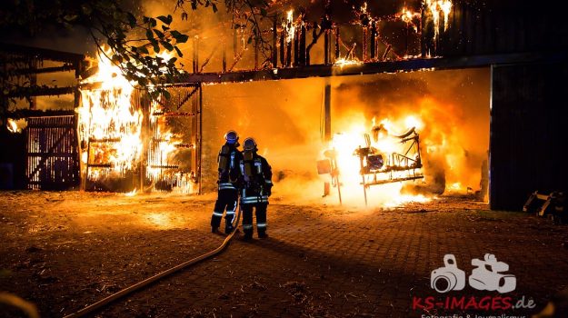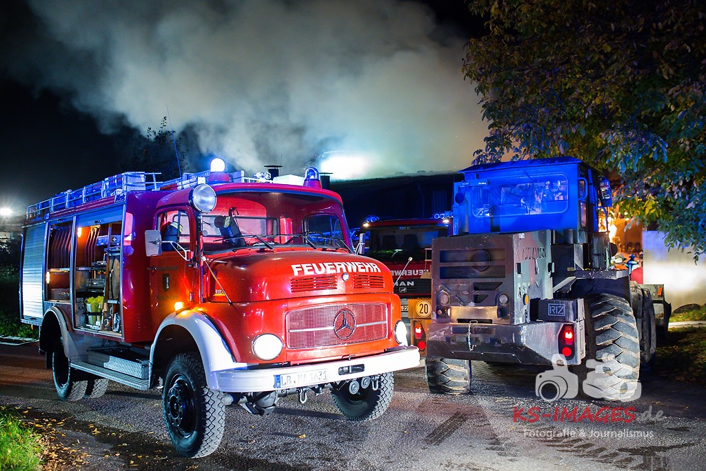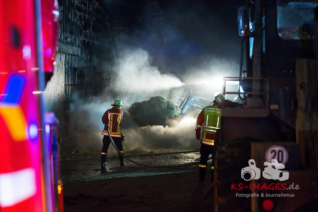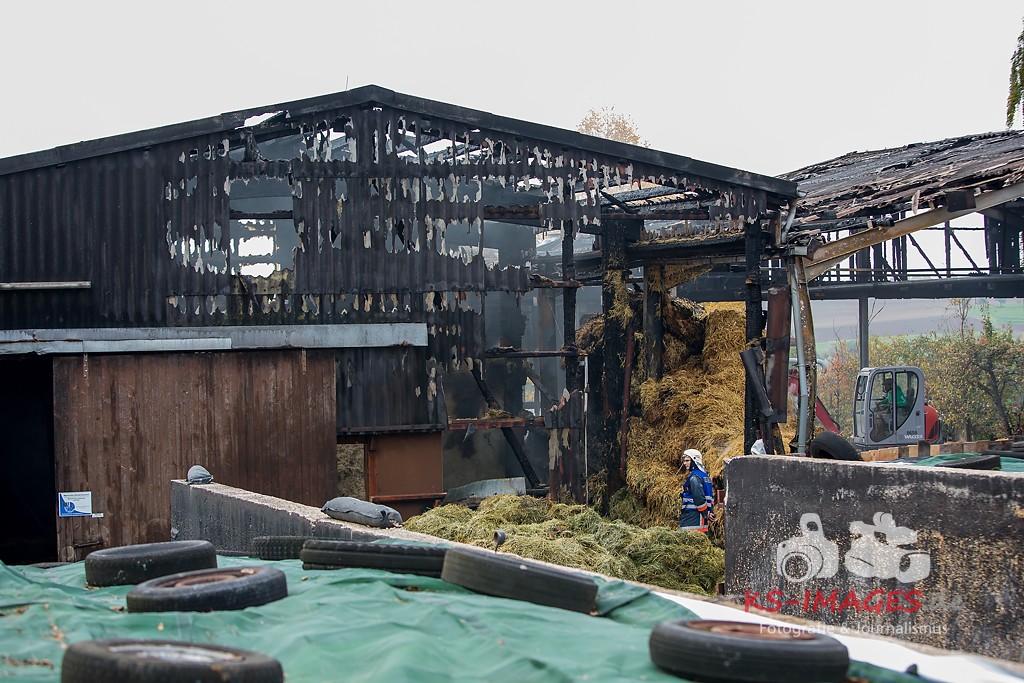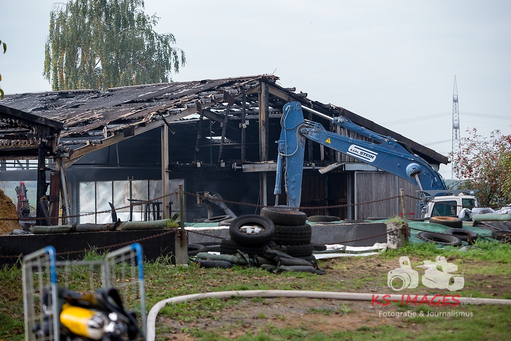 0								REMSECK: – Am Samstag wurde gegen 22.00 Uhr der Brand einer Maschinenhalle auf einem Aussiedlerhof in der Lembergstraße festgestellt. Beim Eintreffen der Einsatzkräfte hatte das Feuer zwischenzeitlich auf die unmittelbar daneben befindliche Stallung übergegriffen. Zu diesem Zeitpunkt befanden sich dort ca. 100 Rinder. Durch das rasche Eingreifen der Einsatzkräfte und den Verantwortlichen wurden die Tiere in ein Bodensilo getrieben und nahmen dort keinen weiteren Schaden. Ein Rind setzte sich jedoch von der Herde ab und beschädigte auf der Flucht auf ein angrenzendes Freigelände ein Einsatzfahrzeug der Feuerwehr. Das Tier konnte trotz aller Bemühungen nicht wieder eingefangen werden und musste vom Jagdpächter erlegt werden. Der Kreisbrandmeister und die Feuerwehren Ludwigsburg, Remseck, Marbach, Kornwestheim und Affalterbach waren mit 27 Fahrzeugen und etwa 120 Wehrleuten vor Ort. Zur Räumung des Brandortes musste ein Bagger hinzugezogen werden. Bei der Anfahrt blieb dieser in der Hochdorfer Straße an einem Freilandstromkabel hängen. Das abgerissene Stromkabel führte zu einem teilweisen Stromausfall in der nahen Umgebung. Der Bagger war dadurch nicht mehr einsatzfähig. Der Ersatzbagger musste mit einem Tieflader aus Freiberg angeliefert werden. Der Rettungsdienst war mit etwa dreißig Einsatzkräften vor Ort. Im Zusammenhang mit dem gesamten Einsatzgeschehen waren glücklicherweise keine Verletzten zu beklagen. Zur Absperrung der Bandörtlichkeit vor Schaulustigen sowie den erforderlichen Ermittlungen waren mehrere Einsatzfahrzeuge des Polizeireviers Kornwestheim und der Polizeipräsidien Aalen und Stuttgart eingesetzt. Der Sachschaden wird auf mindestens 600.000 Euro geschätzt. Nach bisherigem Ermittlungsstand wird von einer technischen Ursache als Brandursache ausgegangen.