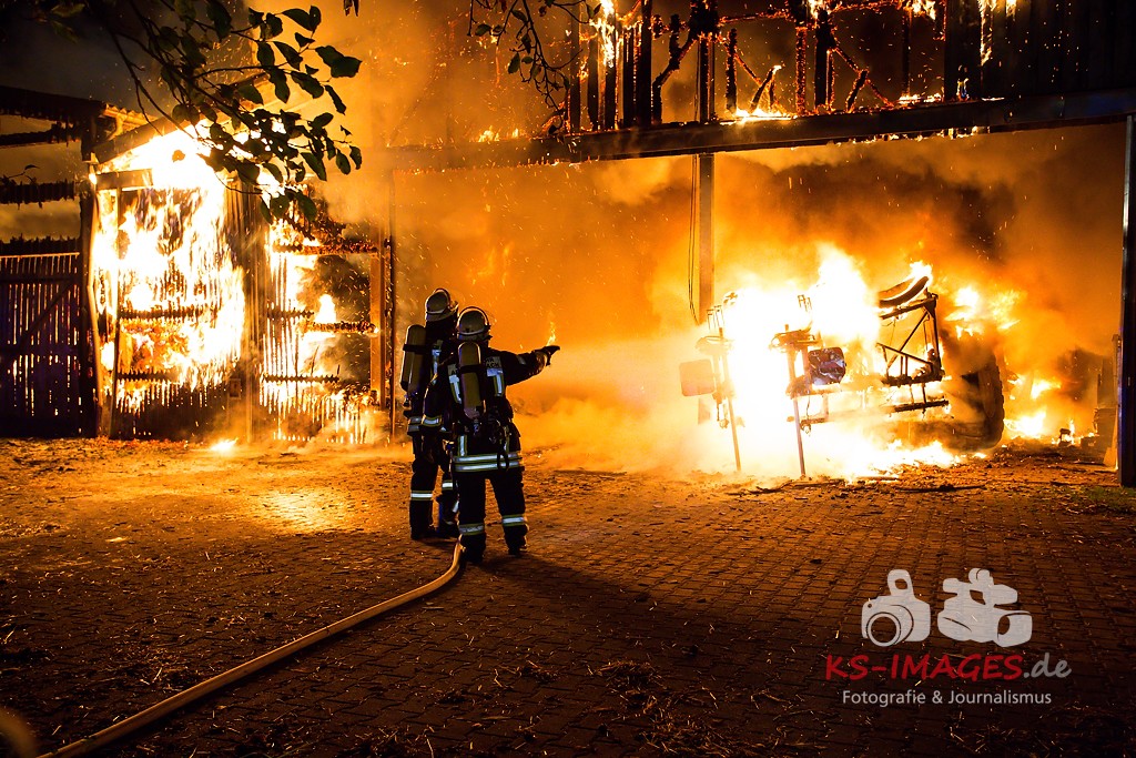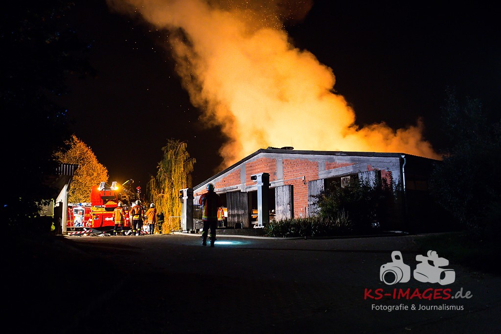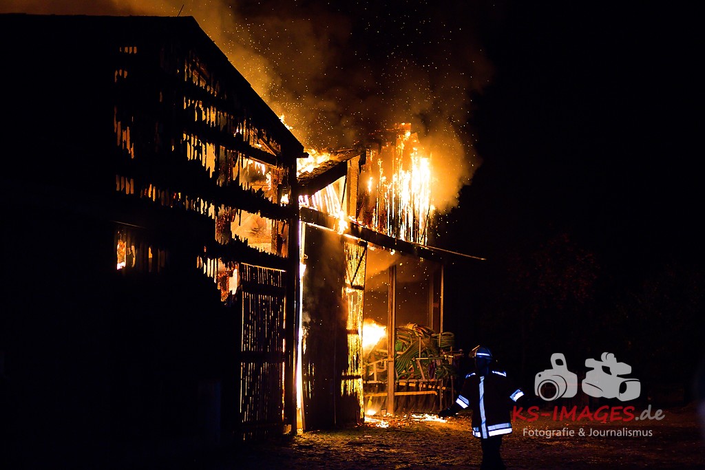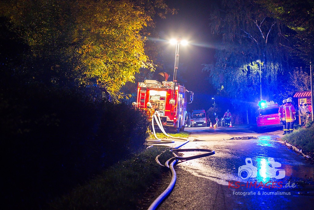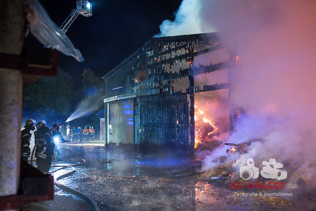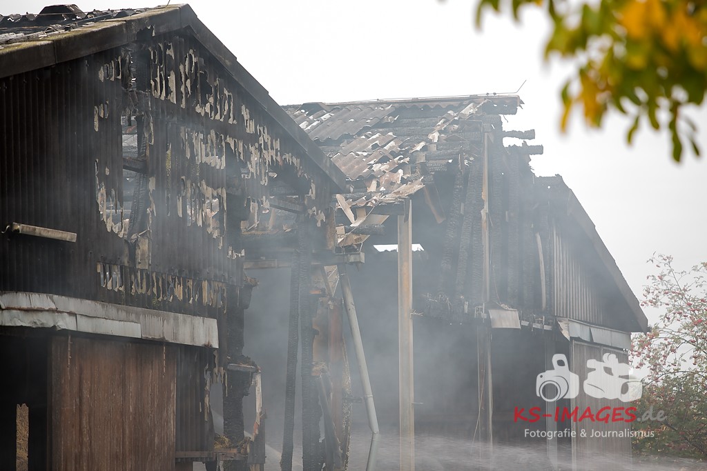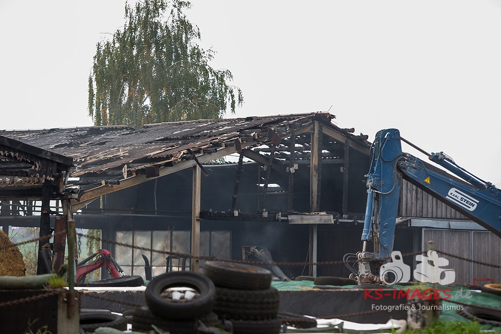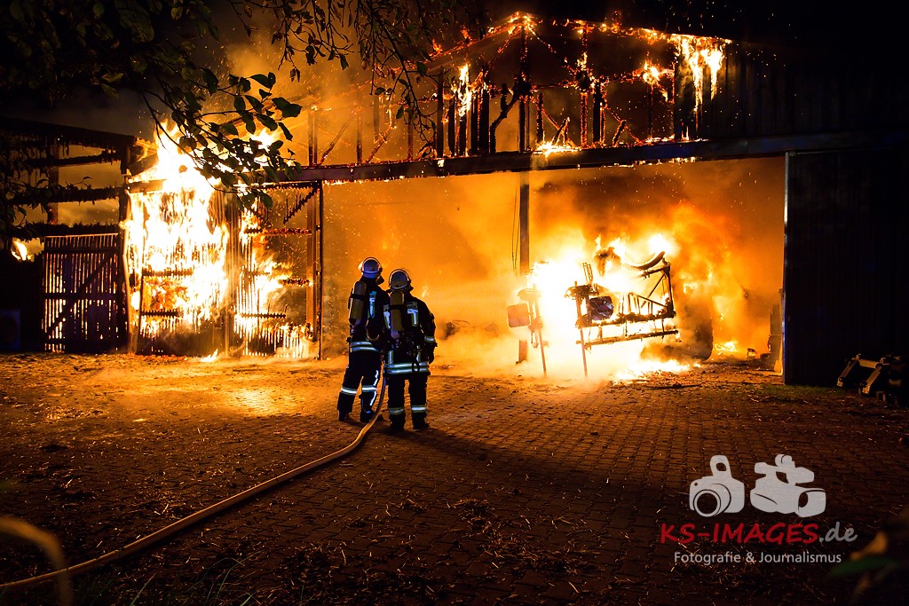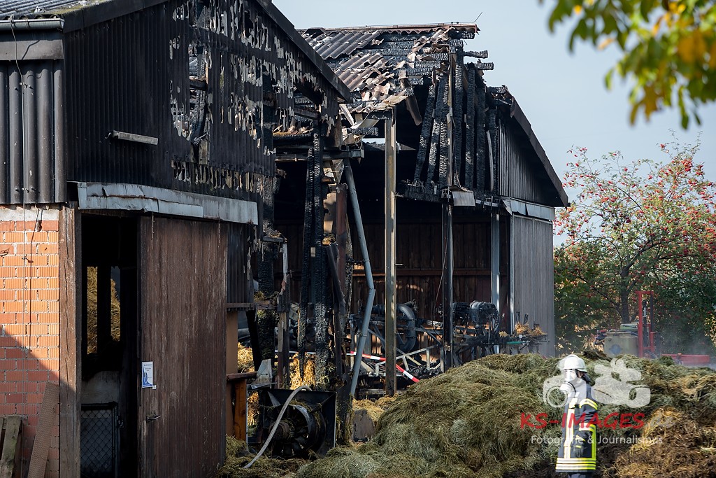 0								REMSECK: – Am Samstag wurde gegen 22.00 Uhr der Brand einer Maschinenhalle auf einem Aussiedlerhof in der Lembergstraße festgestellt. Beim Eintreffen der Einsatzkräfte hatte das Feuer zwischenzeitlich auf die unmittelbar daneben befindliche Stallung übergegriffen. Zu diesem Zeitpunkt befanden sich dort ca. 100 Rinder. Durch das rasche Eingreifen der Einsatzkräfte und den Verantwortlichen wurden die Tiere in ein Bodensilo getrieben und nahmen dort keinen weiteren Schaden. Ein Rind setzte sich jedoch von der Herde ab und beschädigte auf der Flucht auf ein angrenzendes Freigelände ein Einsatzfahrzeug der Feuerwehr. Das Tier konnte trotz aller Bemühungen nicht wieder eingefangen werden und musste vom Jagdpächter erlegt werden. Der Kreisbrandmeister und die Feuerwehren Ludwigsburg, Remseck, Marbach, Kornwestheim und Affalterbach waren mit 27 Fahrzeugen und etwa 120 Wehrleuten vor Ort. Zur Räumung des Brandortes musste ein Bagger hinzugezogen werden. Bei der Anfahrt blieb dieser in der Hochdorfer Straße an einem Freilandstromkabel hängen. Das abgerissene Stromkabel führte zu einem teilweisen Stromausfall in der nahen Umgebung. Der Bagger war dadurch nicht mehr einsatzfähig. Der Ersatzbagger musste mit einem Tieflader aus Freiberg angeliefert werden. Der Rettungsdienst war mit etwa dreißig Einsatzkräften vor Ort. Im Zusammenhang mit dem gesamten Einsatzgeschehen waren glücklicherweise keine Verletzten zu beklagen. Zur Absperrung der Bandörtlichkeit vor Schaulustigen sowie den erforderlichen Ermittlungen waren mehrere Einsatzfahrzeuge des Polizeireviers Kornwestheim und der Polizeipräsidien Aalen und Stuttgart eingesetzt. Der Sachschaden wird auf mindestens 600.000 Euro geschätzt. Nach bisherigem Ermittlungsstand wird von einer technischen Ursache als Brandursache ausgegangen.