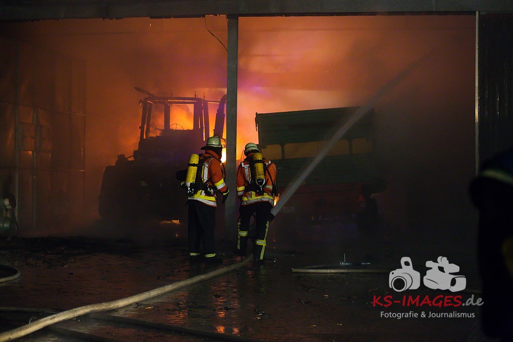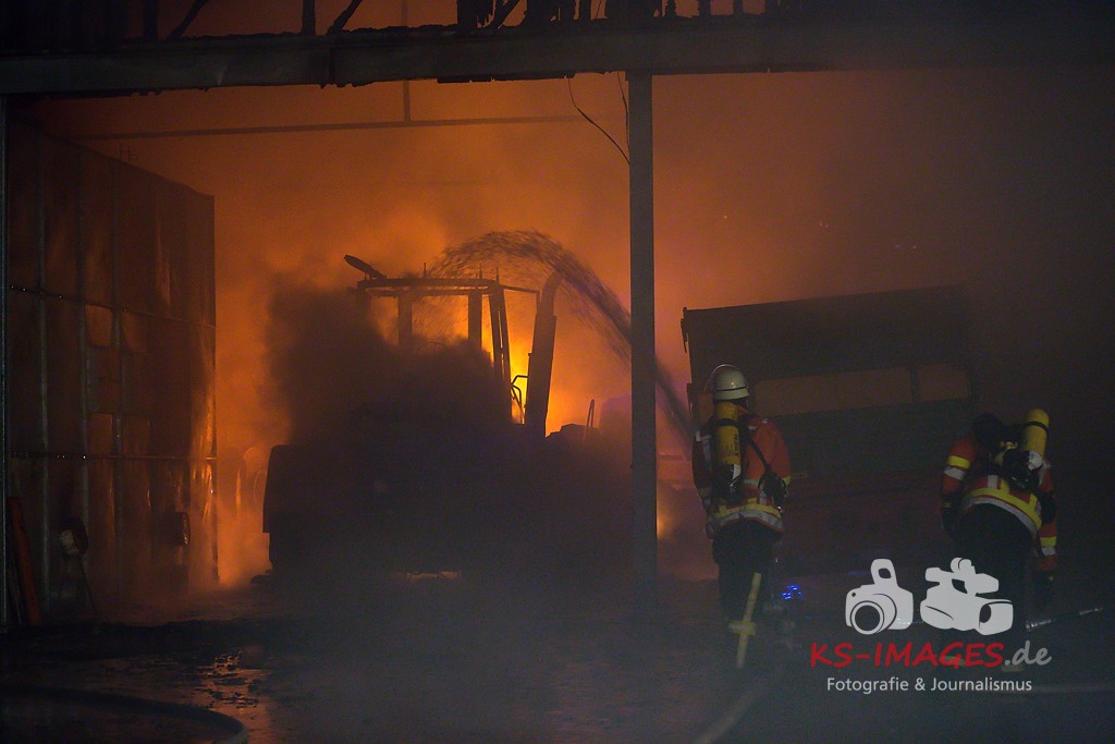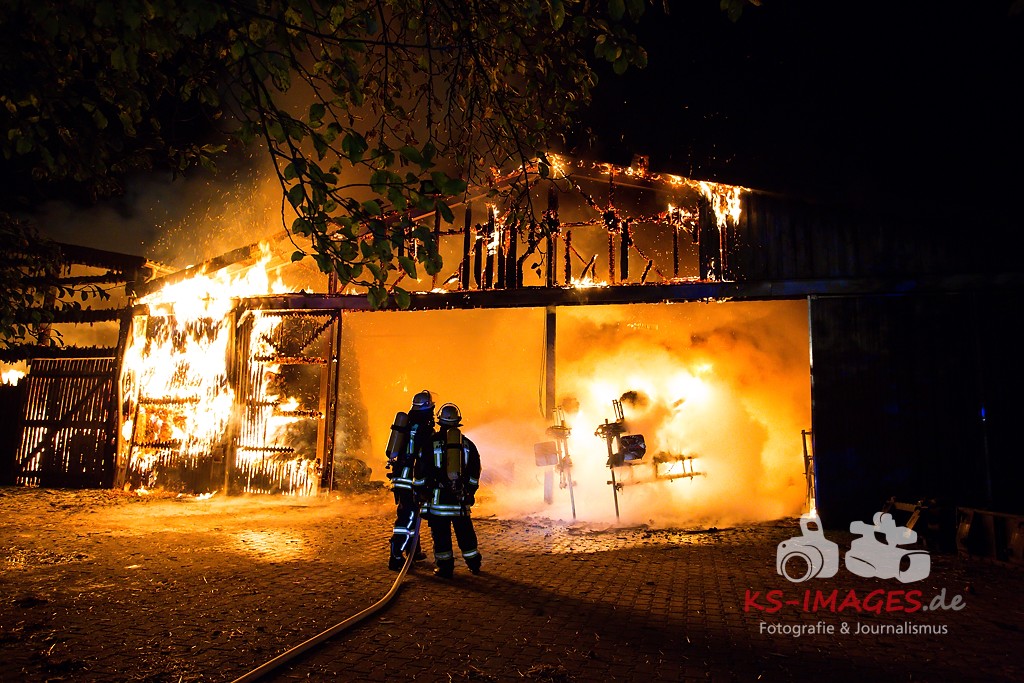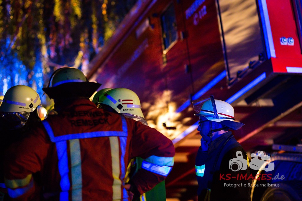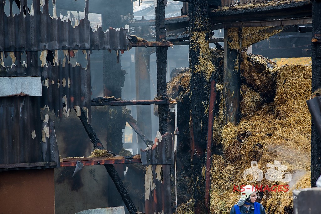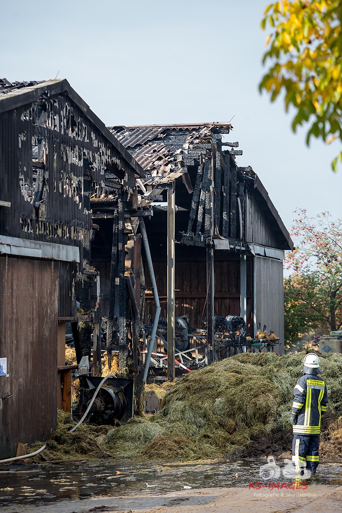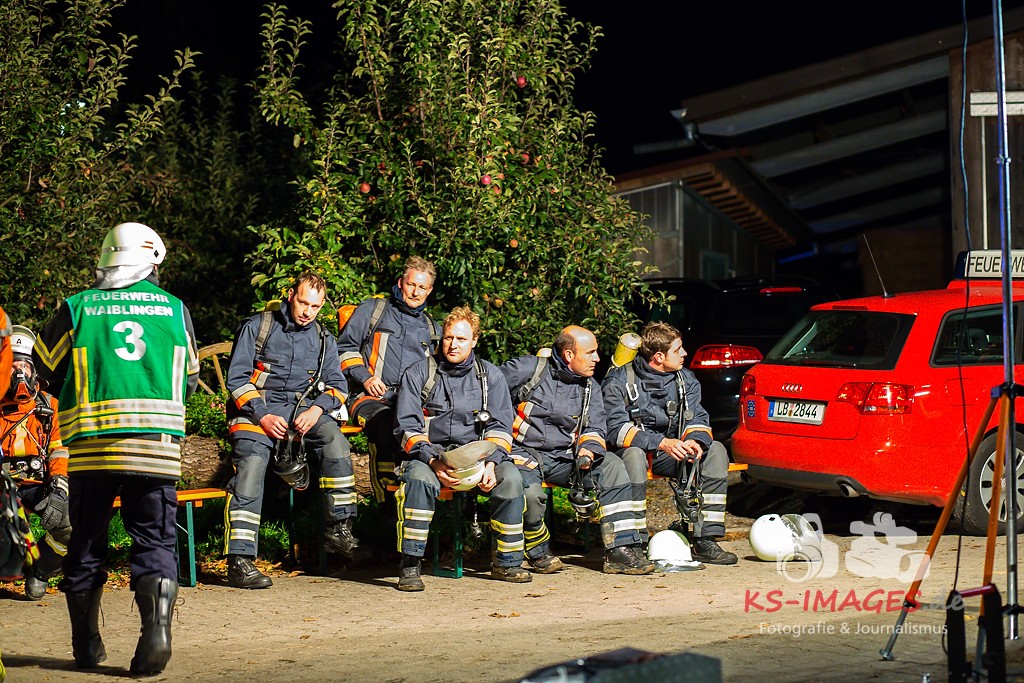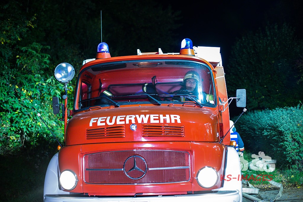 0								REMSECK: – Am Samstag wurde gegen 22.00 Uhr der Brand einer Maschinenhalle auf einem Aussiedlerhof in der Lembergstraße festgestellt. Beim Eintreffen der Einsatzkräfte hatte das Feuer zwischenzeitlich auf die unmittelbar daneben befindliche Stallung übergegriffen. Zu diesem Zeitpunkt befanden sich dort ca. 100 Rinder. Durch das rasche Eingreifen der Einsatzkräfte und den Verantwortlichen wurden die Tiere in ein Bodensilo getrieben und nahmen dort keinen weiteren Schaden. Ein Rind setzte sich jedoch von der Herde ab und beschädigte auf der Flucht auf ein angrenzendes Freigelände ein Einsatzfahrzeug der Feuerwehr. Das Tier konnte trotz aller Bemühungen nicht wieder eingefangen werden und musste vom Jagdpächter erlegt werden. Der Kreisbrandmeister und die Feuerwehren Ludwigsburg, Remseck, Marbach, Kornwestheim und Affalterbach waren mit 27 Fahrzeugen und etwa 120 Wehrleuten vor Ort. Zur Räumung des Brandortes musste ein Bagger hinzugezogen werden. Bei der Anfahrt blieb dieser in der Hochdorfer Straße an einem Freilandstromkabel hängen. Das abgerissene Stromkabel führte zu einem teilweisen Stromausfall in der nahen Umgebung. Der Bagger war dadurch nicht mehr einsatzfähig. Der Ersatzbagger musste mit einem Tieflader aus Freiberg angeliefert werden. Der Rettungsdienst war mit etwa dreißig Einsatzkräften vor Ort. Im Zusammenhang mit dem gesamten Einsatzgeschehen waren glücklicherweise keine Verletzten zu beklagen. Zur Absperrung der Bandörtlichkeit vor Schaulustigen sowie den erforderlichen Ermittlungen waren mehrere Einsatzfahrzeuge des Polizeireviers Kornwestheim und der Polizeipräsidien Aalen und Stuttgart eingesetzt. Der Sachschaden wird auf mindestens 600.000 Euro geschätzt. Nach bisherigem Ermittlungsstand wird von einer technischen Ursache als Brandursache ausgegangen.