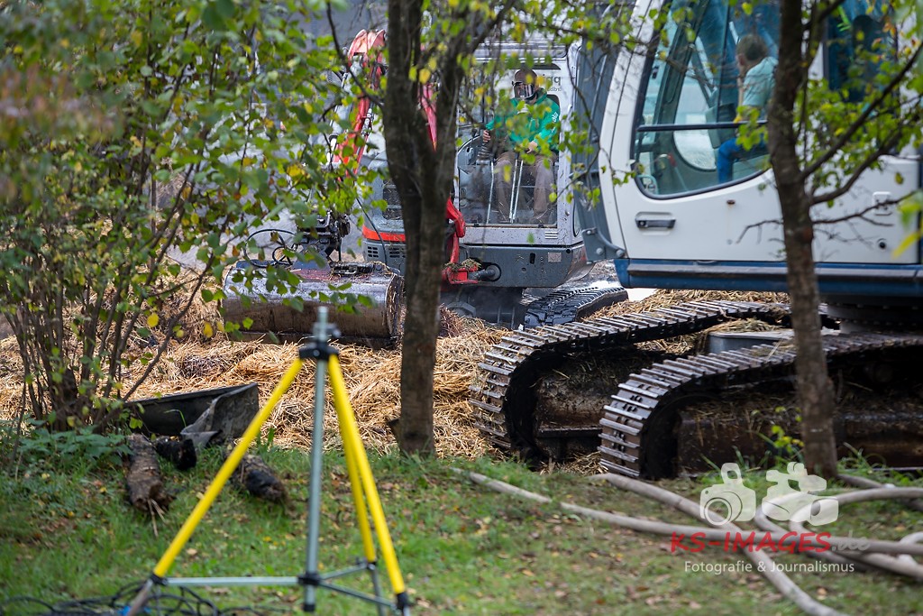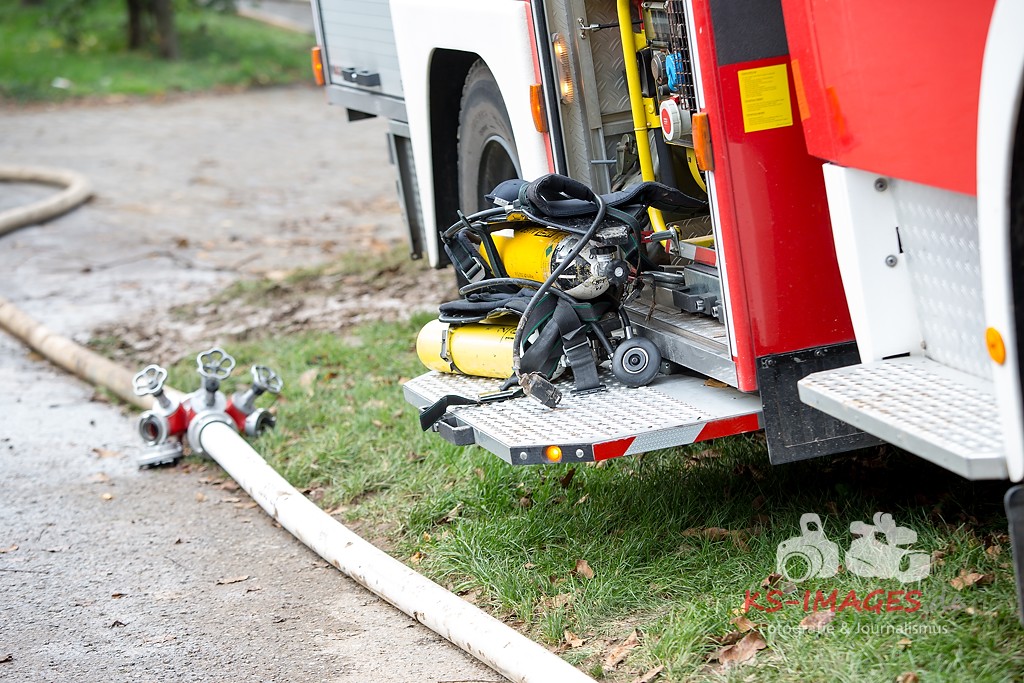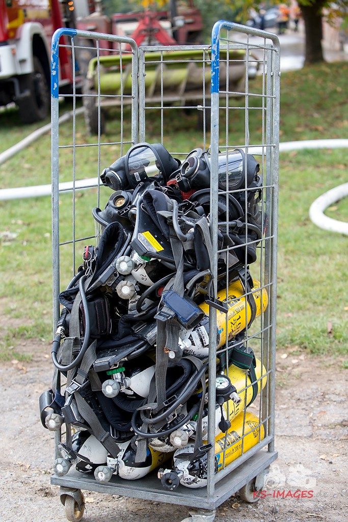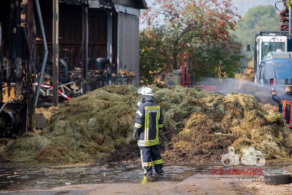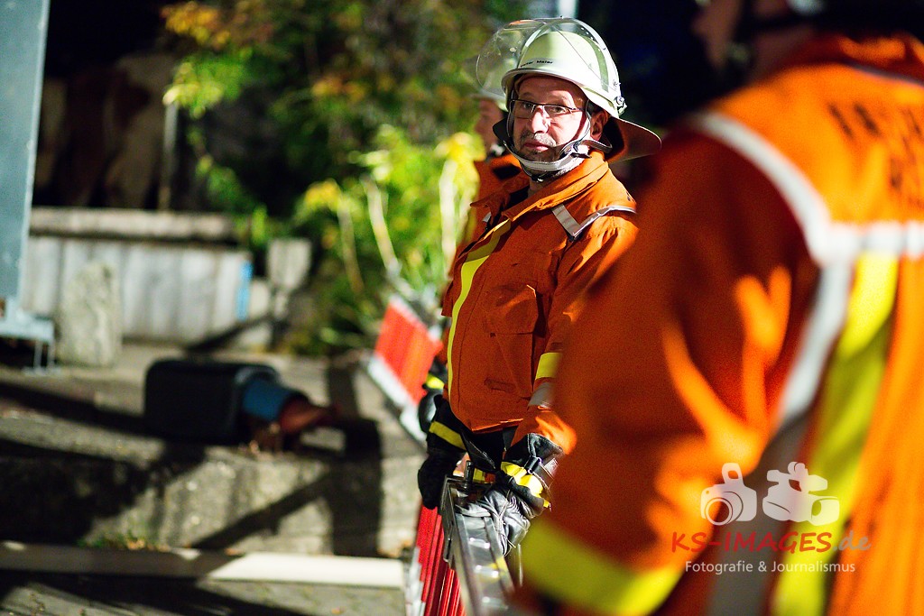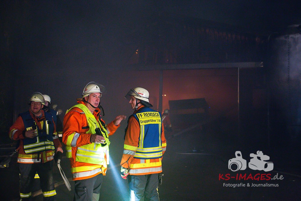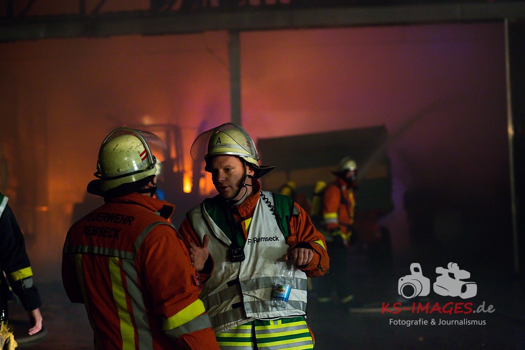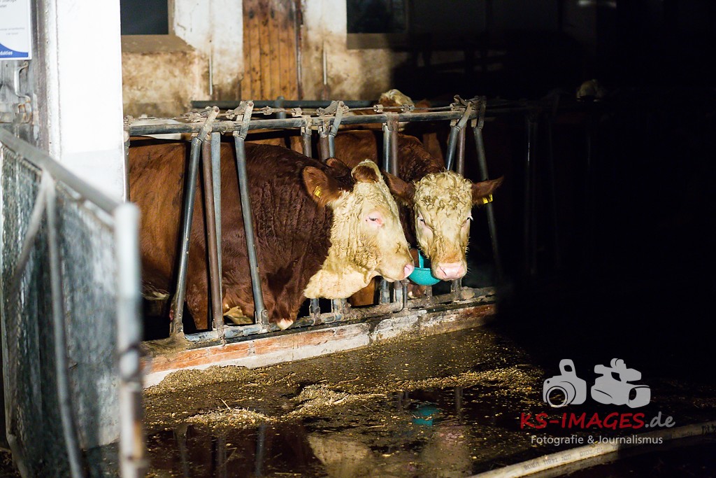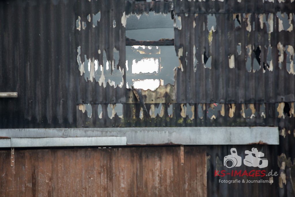 0								REMSECK: – Am Samstag wurde gegen 22.00 Uhr der Brand einer Maschinenhalle auf einem Aussiedlerhof in der Lembergstraße festgestellt. Beim Eintreffen der Einsatzkräfte hatte das Feuer zwischenzeitlich auf die unmittelbar daneben befindliche Stallung übergegriffen. Zu diesem Zeitpunkt befanden sich dort ca. 100 Rinder. Durch das rasche Eingreifen der Einsatzkräfte und den Verantwortlichen wurden die Tiere in ein Bodensilo getrieben und nahmen dort keinen weiteren Schaden. Ein Rind setzte sich jedoch von der Herde ab und beschädigte auf der Flucht auf ein angrenzendes Freigelände ein Einsatzfahrzeug der Feuerwehr. Das Tier konnte trotz aller Bemühungen nicht wieder eingefangen werden und musste vom Jagdpächter erlegt werden. Der Kreisbrandmeister und die Feuerwehren Ludwigsburg, Remseck, Marbach, Kornwestheim und Affalterbach waren mit 27 Fahrzeugen und etwa 120 Wehrleuten vor Ort. Zur Räumung des Brandortes musste ein Bagger hinzugezogen werden. Bei der Anfahrt blieb dieser in der Hochdorfer Straße an einem Freilandstromkabel hängen. Das abgerissene Stromkabel führte zu einem teilweisen Stromausfall in der nahen Umgebung. Der Bagger war dadurch nicht mehr einsatzfähig. Der Ersatzbagger musste mit einem Tieflader aus Freiberg angeliefert werden. Der Rettungsdienst war mit etwa dreißig Einsatzkräften vor Ort. Im Zusammenhang mit dem gesamten Einsatzgeschehen waren glücklicherweise keine Verletzten zu beklagen. Zur Absperrung der Bandörtlichkeit vor Schaulustigen sowie den erforderlichen Ermittlungen waren mehrere Einsatzfahrzeuge des Polizeireviers Kornwestheim und der Polizeipräsidien Aalen und Stuttgart eingesetzt. Der Sachschaden wird auf mindestens 600.000 Euro geschätzt. Nach bisherigem Ermittlungsstand wird von einer technischen Ursache als Brandursache ausgegangen.