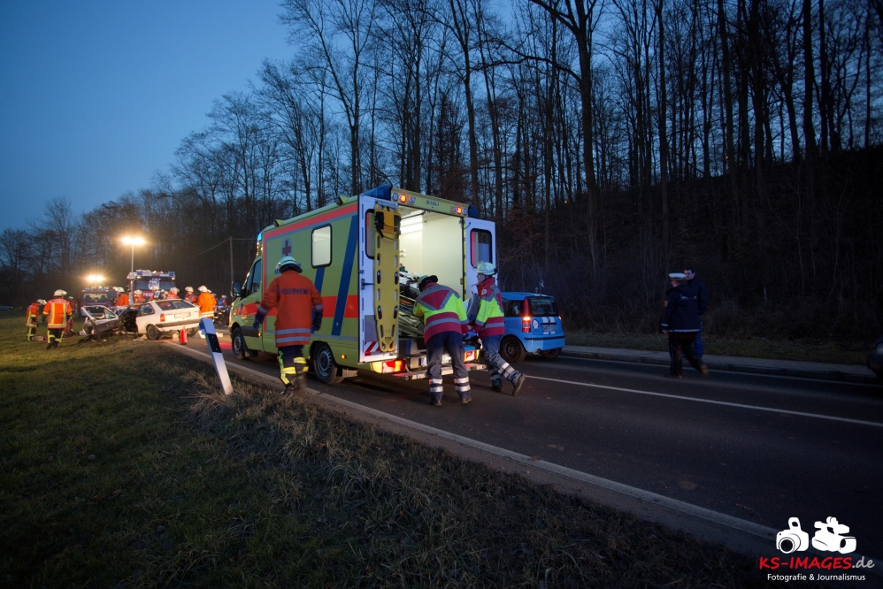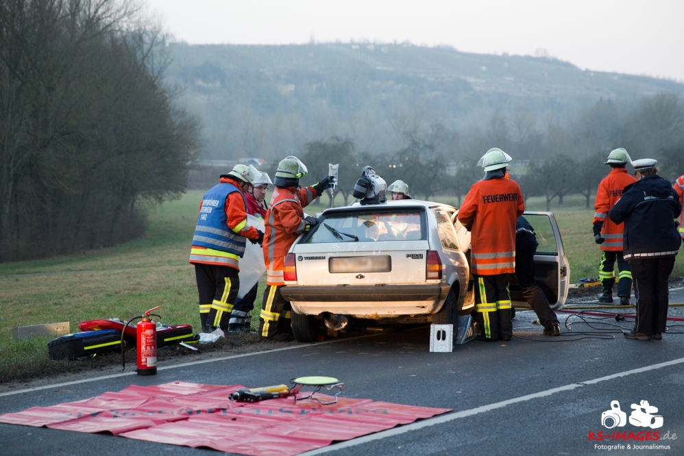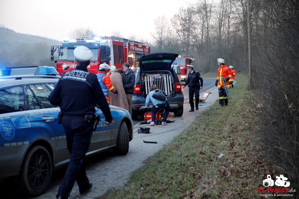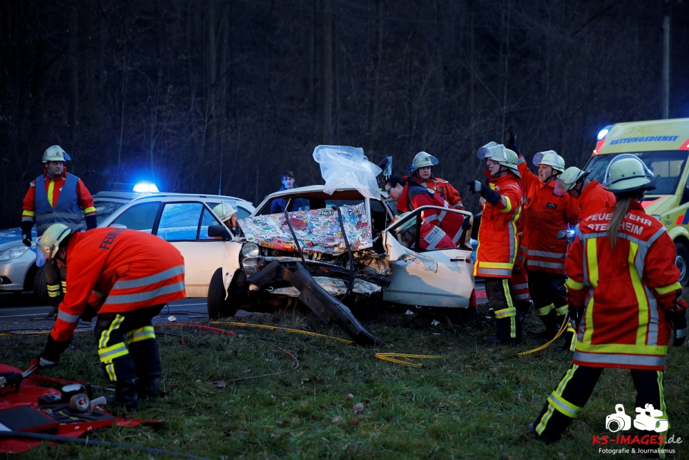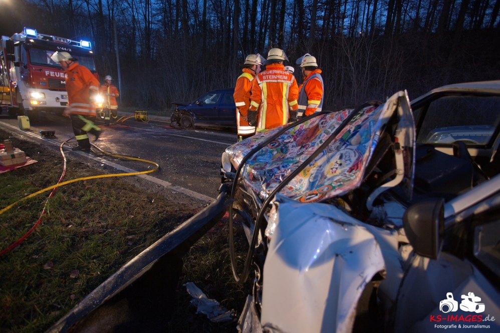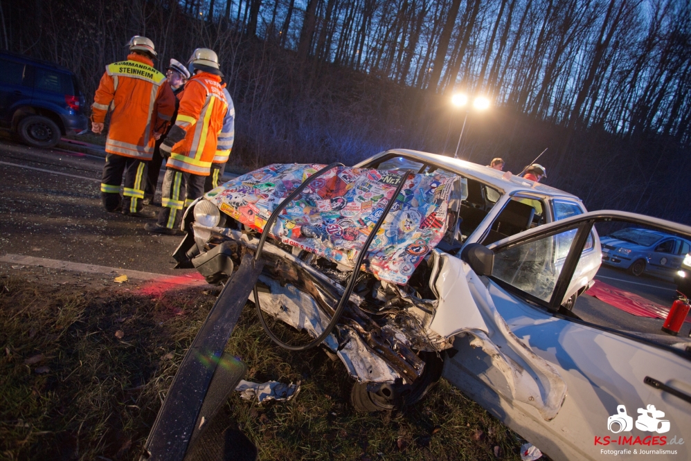 Geschwindigkeit auf feuchter Fahrbahn ins Schlingern, kam auf die Gegenfahrbahn und kollidierte dort mit einem Skoda Yeti, welcher von einer 35- jährigen gelenkt wurde. Durch den Zusammenstoß kam der Polo von der Fahrbahn nach rechts ab und kam entgegen der Fahrtrichtung im Grünstreifen zum Stehen. Der Fahrer des Polos wurde bei dem Unfall eingeklemmt und musste durch die Feuerwehr Steinheim befreit werden. Schwerverletzt wurde er mit dem Rettungsdienst in ein Krankenhaus gebracht. Die Fahrerin des Skodas wurde bei dem Unfall leicht verletzt, musste jedoch vorsorglich auch ins Krankenhaus gebracht werden. Aufgrund der Unfallaufnahme und der Bergung der Fahrzeuge, war die Landesstraße bis gegen 19.00 Uhr voll gesperrt. Der Rettungsdienst war mit zwei Fahrzeugen und einem Notarzt sowie die Feuerwehr Steinheim mit drei Fahrzeugen und 30 Mann vor Ort. Bei dem Unfall entstand ein Sachschaden in Gesamthöhe von zirka 18.000 Euro.