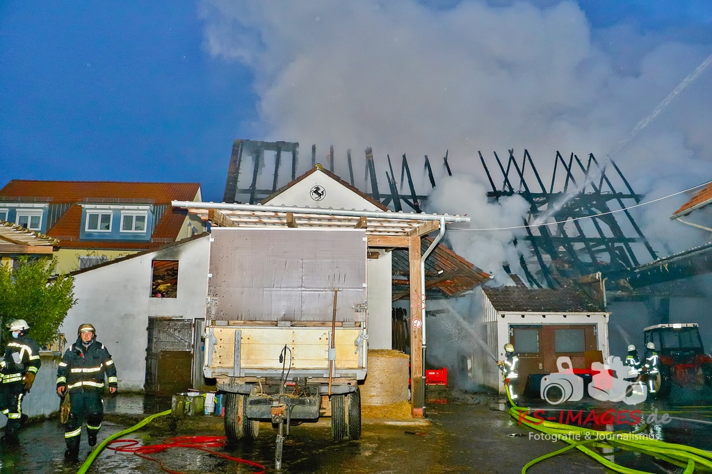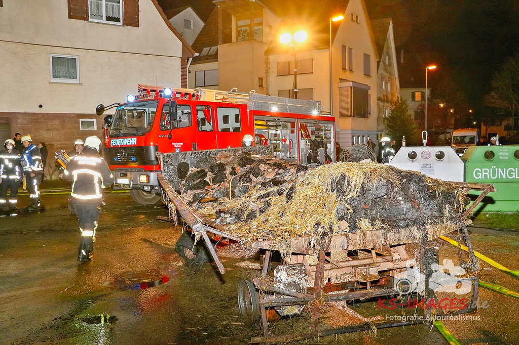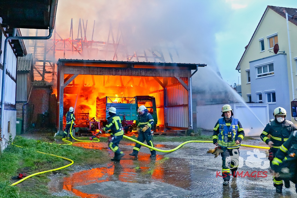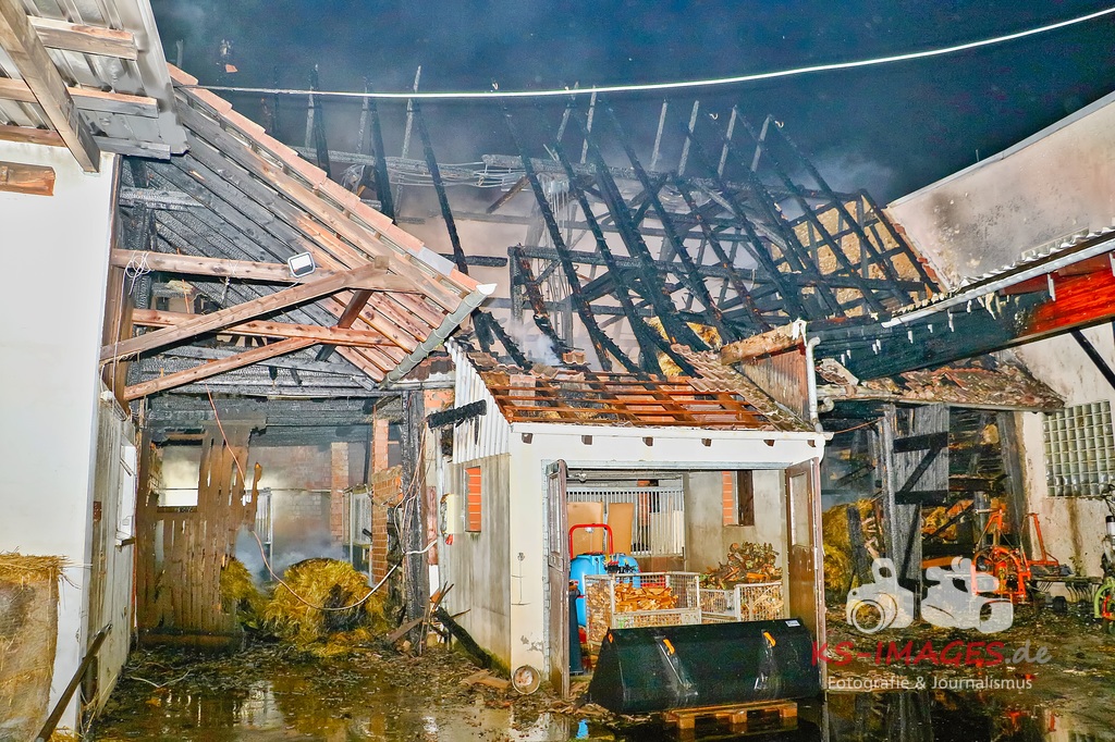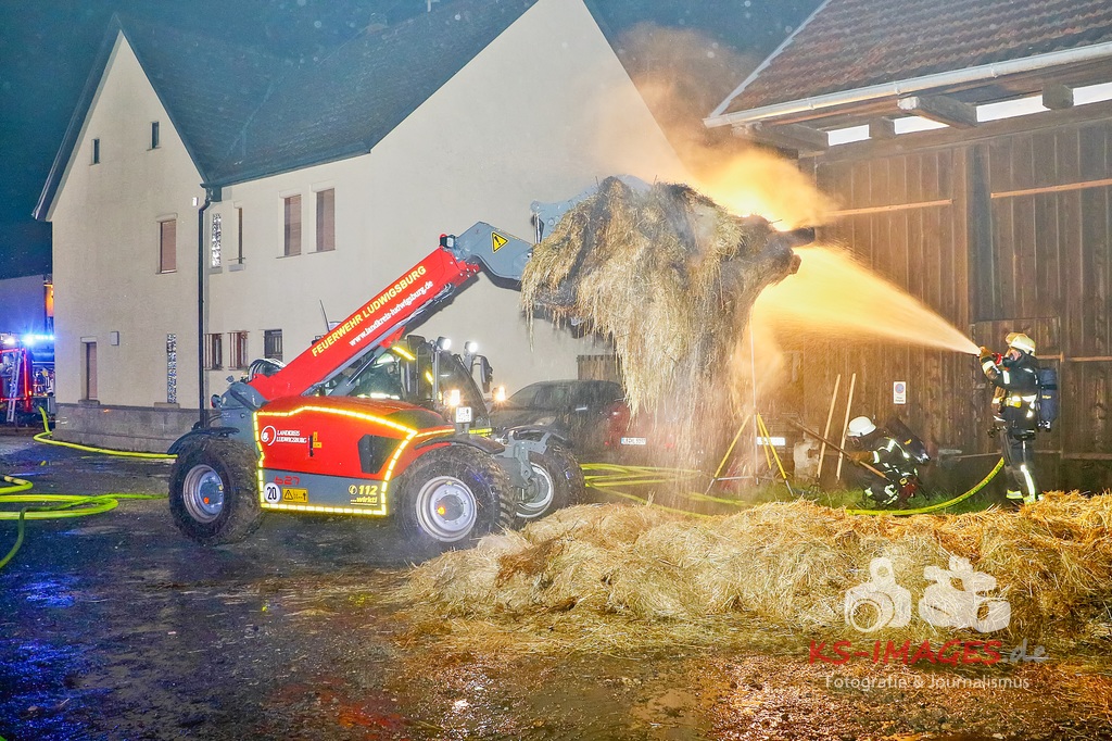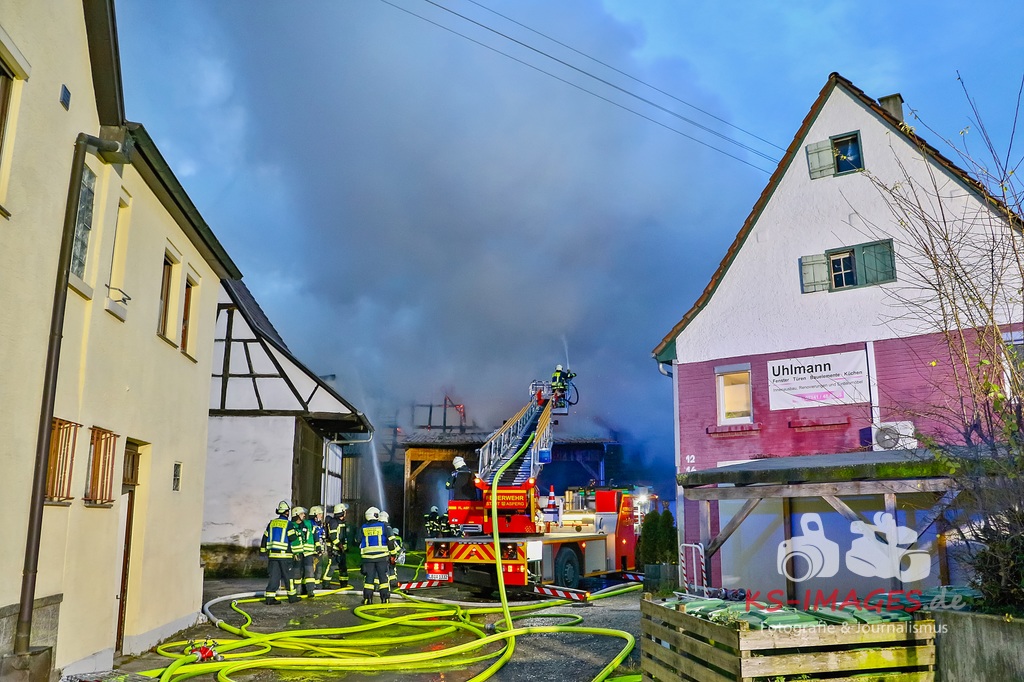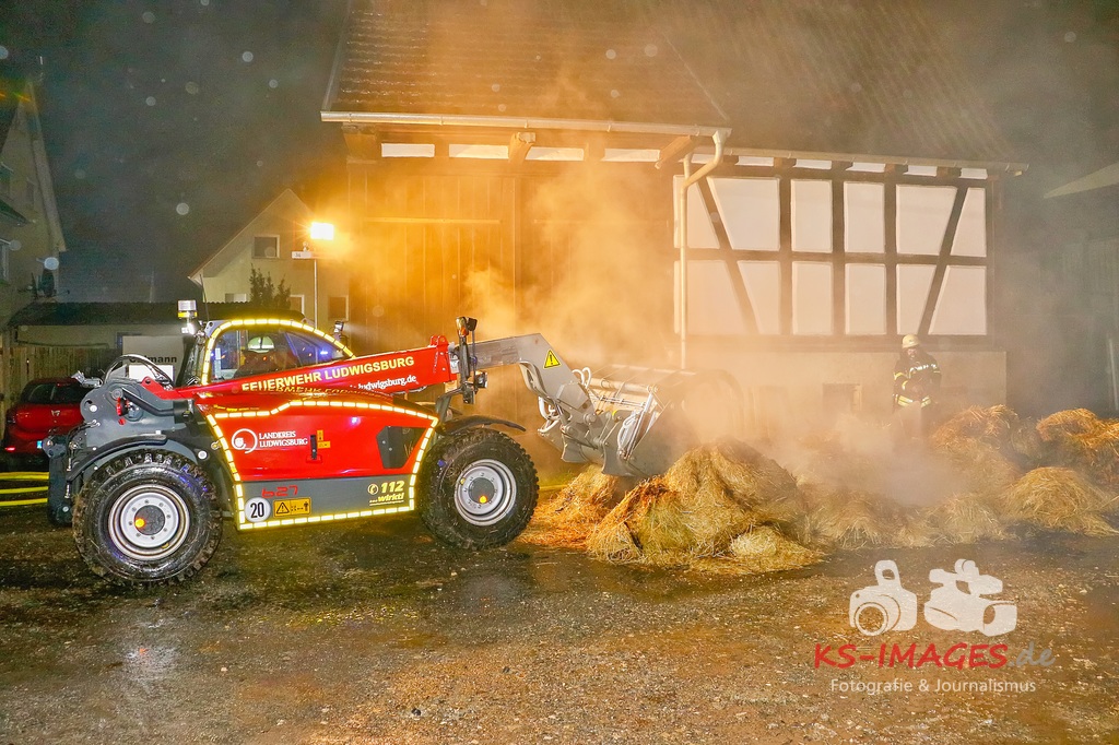 Aufgrund des Brandes drohte das Einstürzen der westlichen Mauer, sodass ein angrenzendes Mehrfamilienhaus geräumt werden musste. Den Personen wurde die Möglichkeit gegeben sich für die Dauer der Lösch- und Einsatzmaßnahmen im Rathaus Möglingen aufzuhalten. In der Scheune waren neben Stroh und Maschinen auch sieben Pferde untergebracht, wovon eines durch das Feuer getötet wurde. Die 31-jährige Freundin des Hauseigentümers befand sich zum Zeitpunkt des Brandausbruches in dem Wohnhaus und erlitt eine Rauchgasvergiftung, weshalb sie durch die Rettungskräfte vor Ort behandelt werden musste. Die Brandursache sowie der entstandene Sachschaden sind derzeit noch Gegenstand der Ermittlungen. Neben fünf Streifenfahrzeugen des Polizeipräsidiums Ludwigsburg befinden sich die Feuerwehren Möglingen, Asperg und Ludwigsburg mit 17 Fahrzeugen und 58 Wehrleuten vor Ort, welche derzeit noch mit den Löscharbeiten beschäftigt sind. Es wird nachberichtet. (Fotos: Andreas Rometsch)