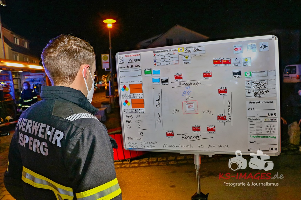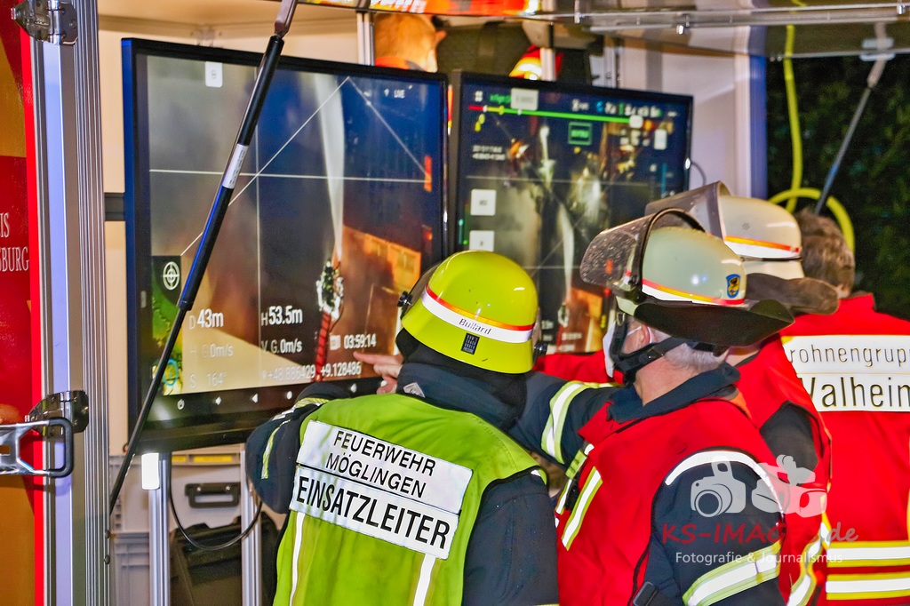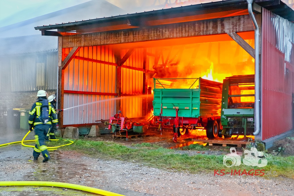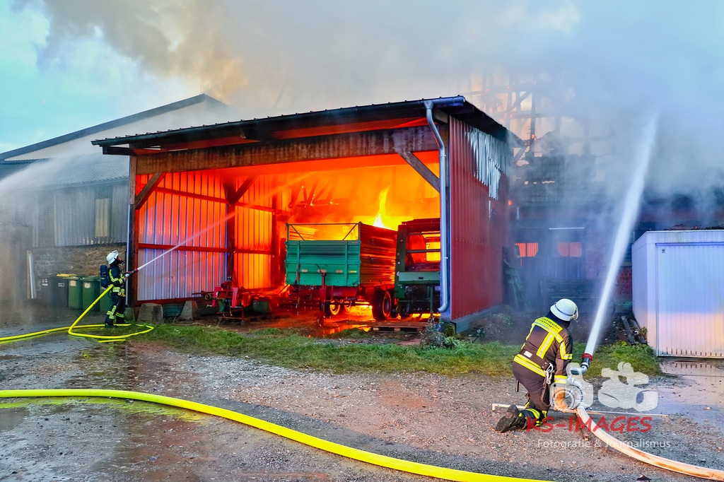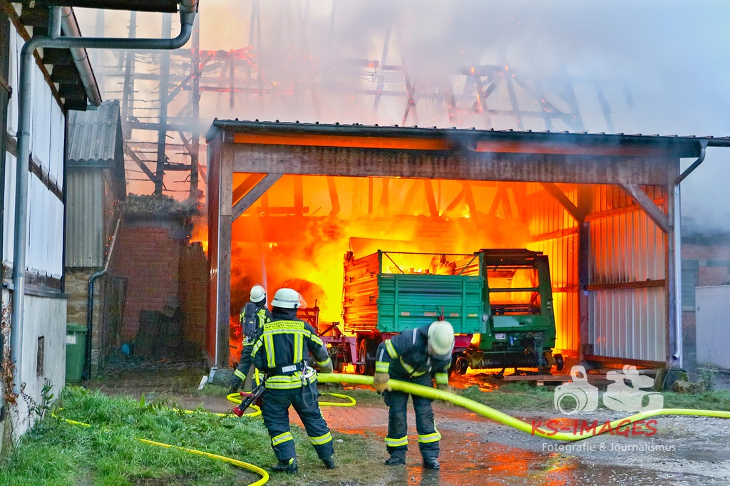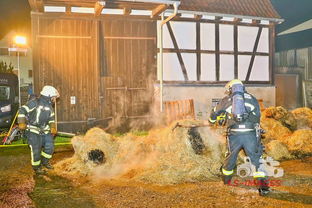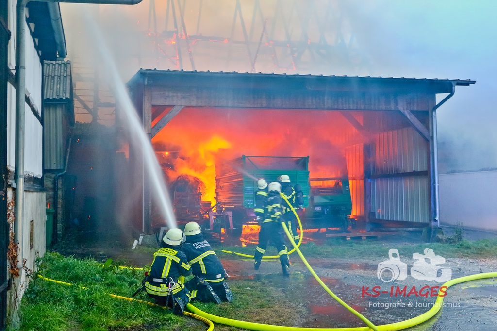 Aufgrund des Brandes drohte das Einstürzen der westlichen Mauer, sodass ein angrenzendes Mehrfamilienhaus geräumt werden musste. Den Personen wurde die Möglichkeit gegeben sich für die Dauer der Lösch- und Einsatzmaßnahmen im Rathaus Möglingen aufzuhalten. In der Scheune waren neben Stroh und Maschinen auch sieben Pferde untergebracht, wovon eines durch das Feuer getötet wurde. Die 31-jährige Freundin des Hauseigentümers befand sich zum Zeitpunkt des Brandausbruches in dem Wohnhaus und erlitt eine Rauchgasvergiftung, weshalb sie durch die Rettungskräfte vor Ort behandelt werden musste. Die Brandursache sowie der entstandene Sachschaden sind derzeit noch Gegenstand der Ermittlungen. Neben fünf Streifenfahrzeugen des Polizeipräsidiums Ludwigsburg befinden sich die Feuerwehren Möglingen, Asperg und Ludwigsburg mit 17 Fahrzeugen und 58 Wehrleuten vor Ort, welche derzeit noch mit den Löscharbeiten beschäftigt sind. Es wird nachberichtet. (Fotos: Andreas Rometsch)