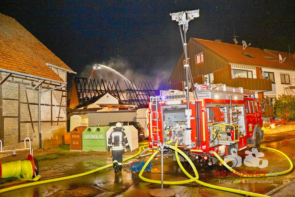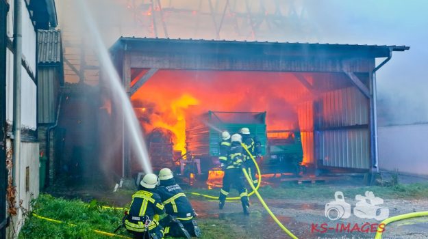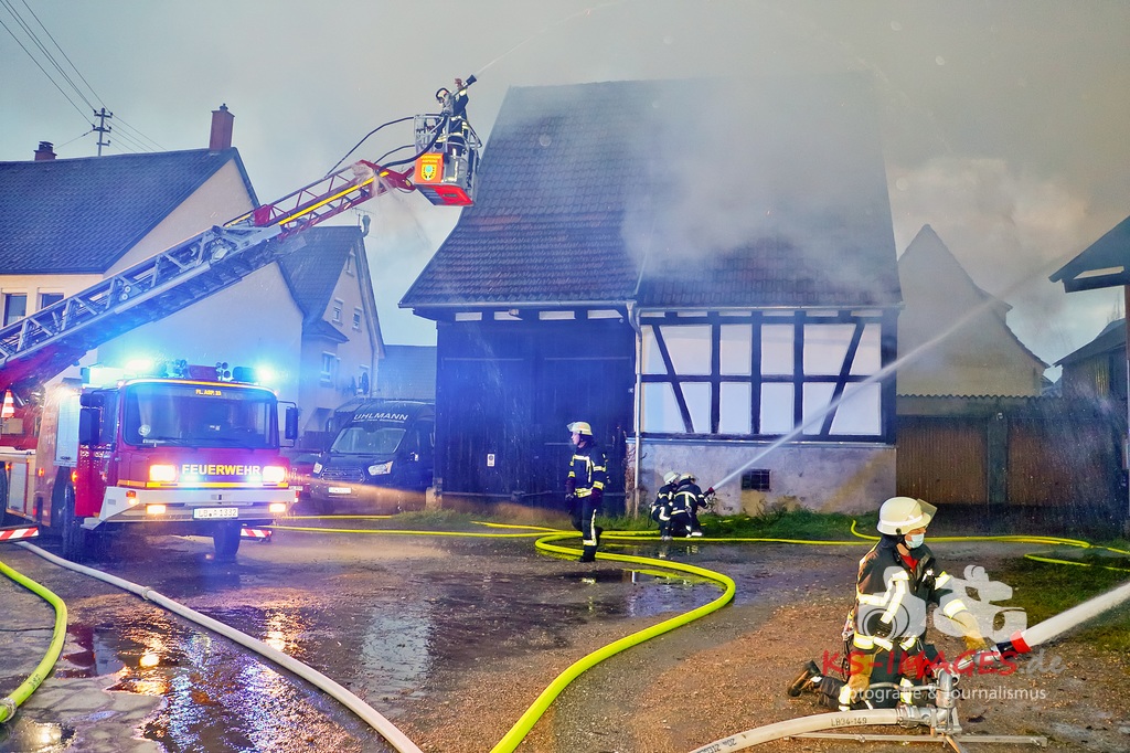 MÖGLINGEN: Am Samstagmittag erreichten Polizei und Feuerwehr gegen 16:15 Uhr mehrere Meldungen über ein brennendes Gebäude in der Ortsmitte in Möglingen. Es handelte sich um ein Wohnhaus mit angrenzender Scheune, welches beim Eintreffen der Einsatzkräfte im Vollbrand stand.