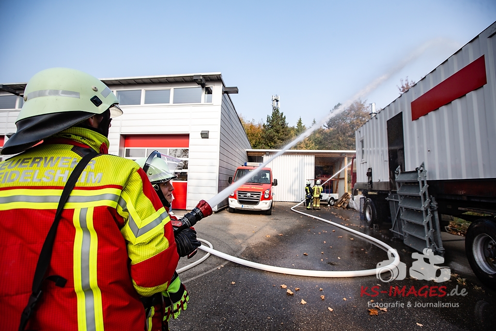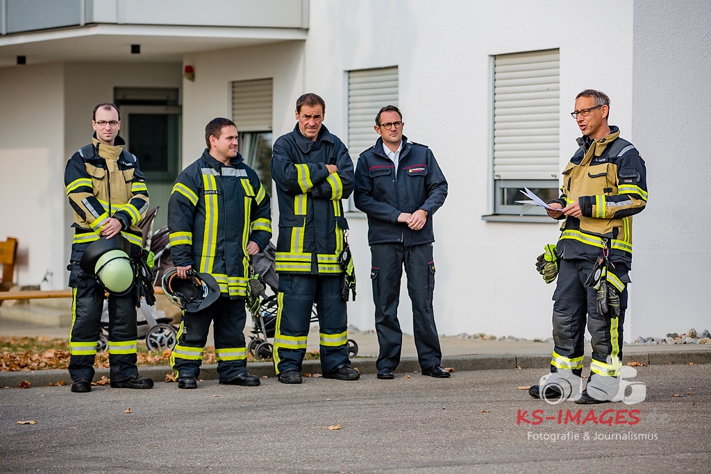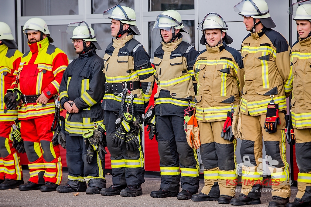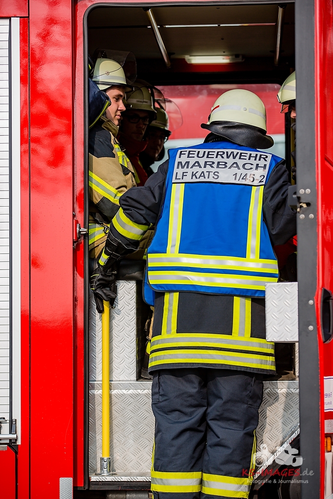 Auf dem Hof der Feuerwache Marbach begrüßte Lehrgangsleiter Lars Meyer, Feuerwehr Marbach, die zahlreichen Zuschauer, die zur Marbacher Feuerwache gekommen waren, um sich die Übung anzusehen. Ein Großteil der Zuschauer, Freunde, Verwandte oder Feuerwehrkameraden und Kommandanten der Lehrgangsteilnehmer, drückten diesen für die Abschlussübung die Daumen.