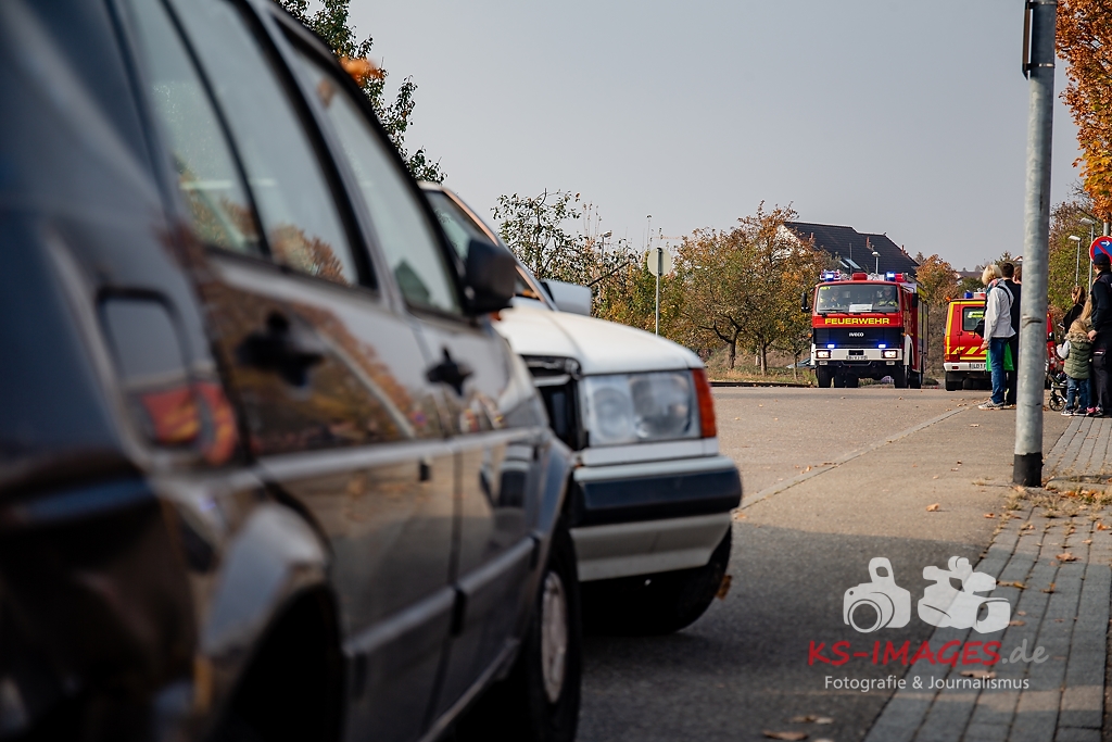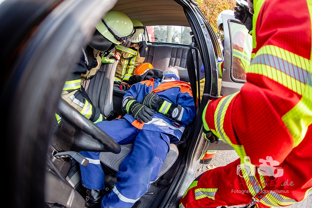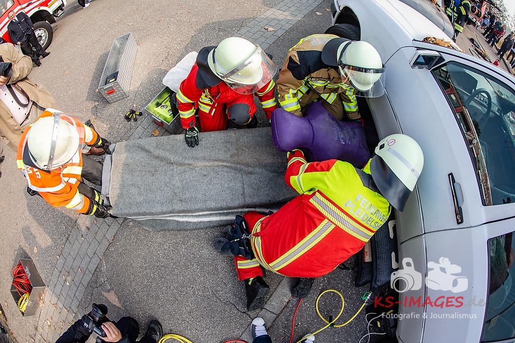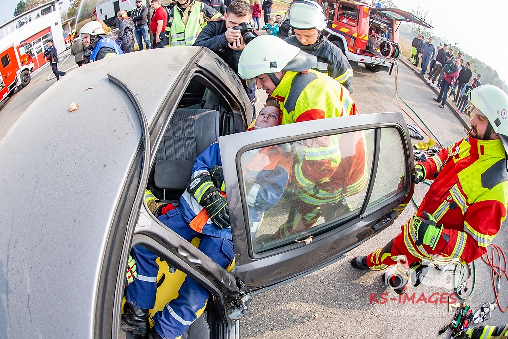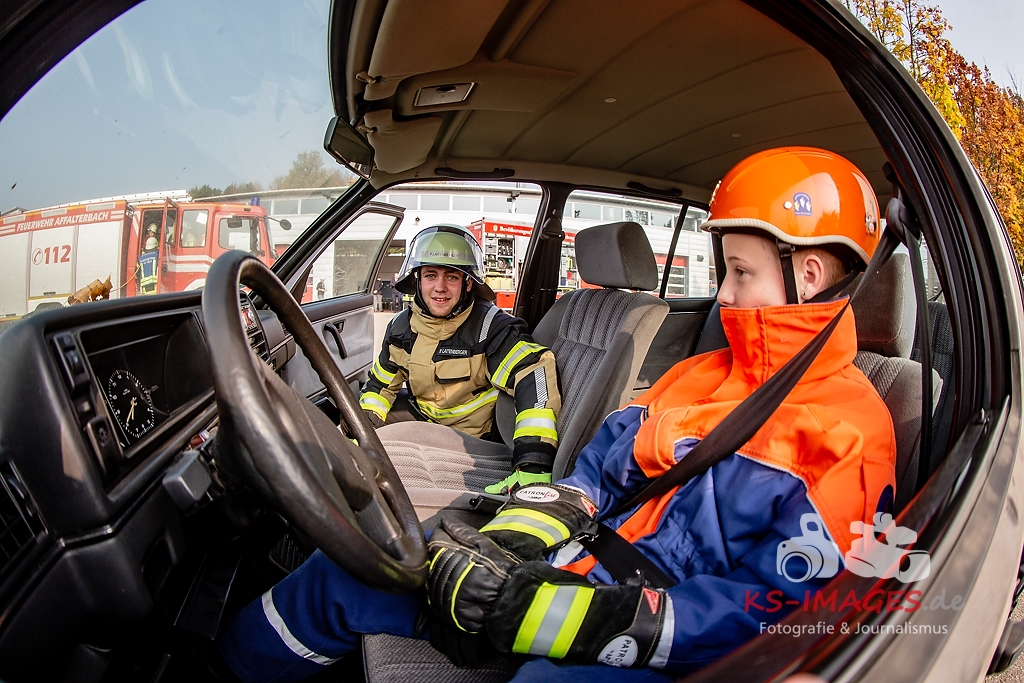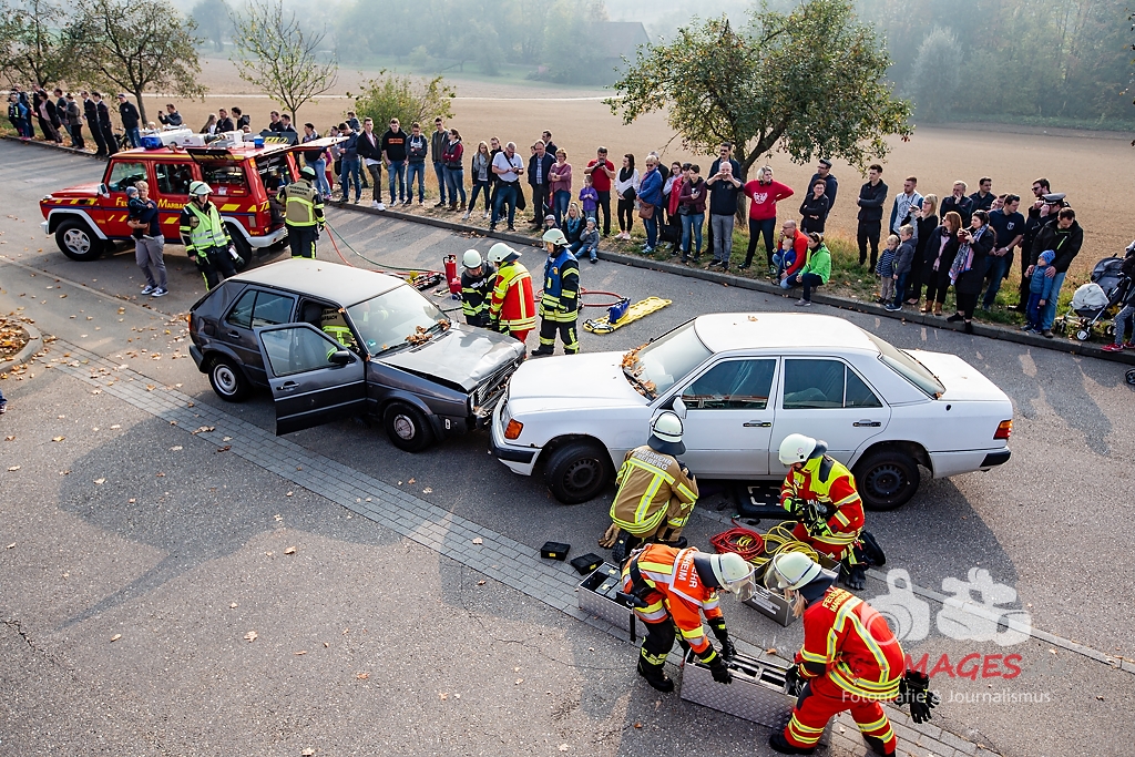 Bereits am Donnerstag, war für die Teilnehmerinnen und Teilnehmer der Großteil des Lehrgangs geschafft. Bei einer theoretischen Prüfung bewiesen sie, was das Lehrgangsteam ihnen in insgesamt 77 Stunden Theorie, Erste Hilfe, Knoten und praktischen Übungen in Technischer Hilfeleistung und Löschen vom 11.09 bis 20.10.2018 beigebracht hatte. Der Lehrgang befähigt die jungen Leute in die Einsatzabteilungen der Freiwilligen Feuerwehren Affalterbach, Benningen, Bönnigheim, Erdmannhausen, Freiberg, Ingersheim, Kornwestheim, Marbach, Markgröningen, Pleidelsheim oder Steinheim einzutreten. Dort dürfen sie ab sofort mitüben und mit erreichen der Volljährigkeit bei Einsätzen mit ausrücken. Die drei besten Teilnehmer der theoretischen Prüfung wurden vor den anwesenden Zuschauerinnen und Zuschauern lobend hervorgehoben, bevor die Teilnehmerinnen und Teilnehmer für die praktische Abschlussprüfung die Fahrzeuge besetzten.