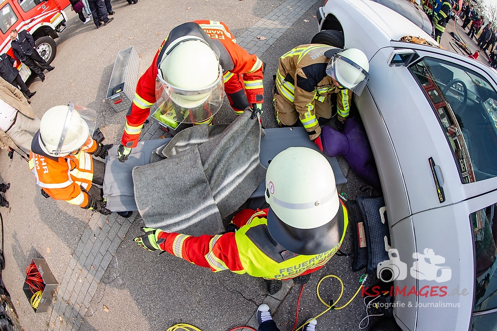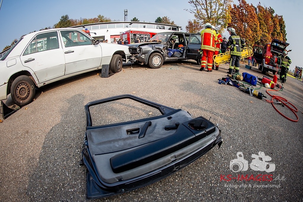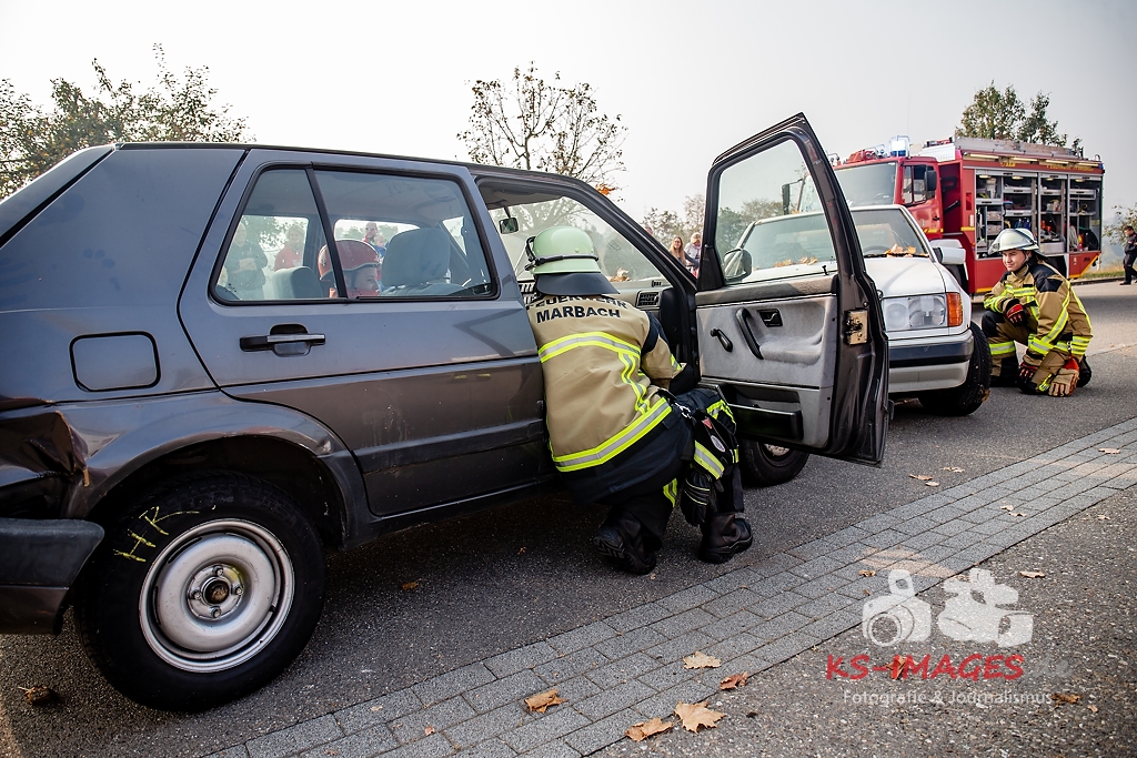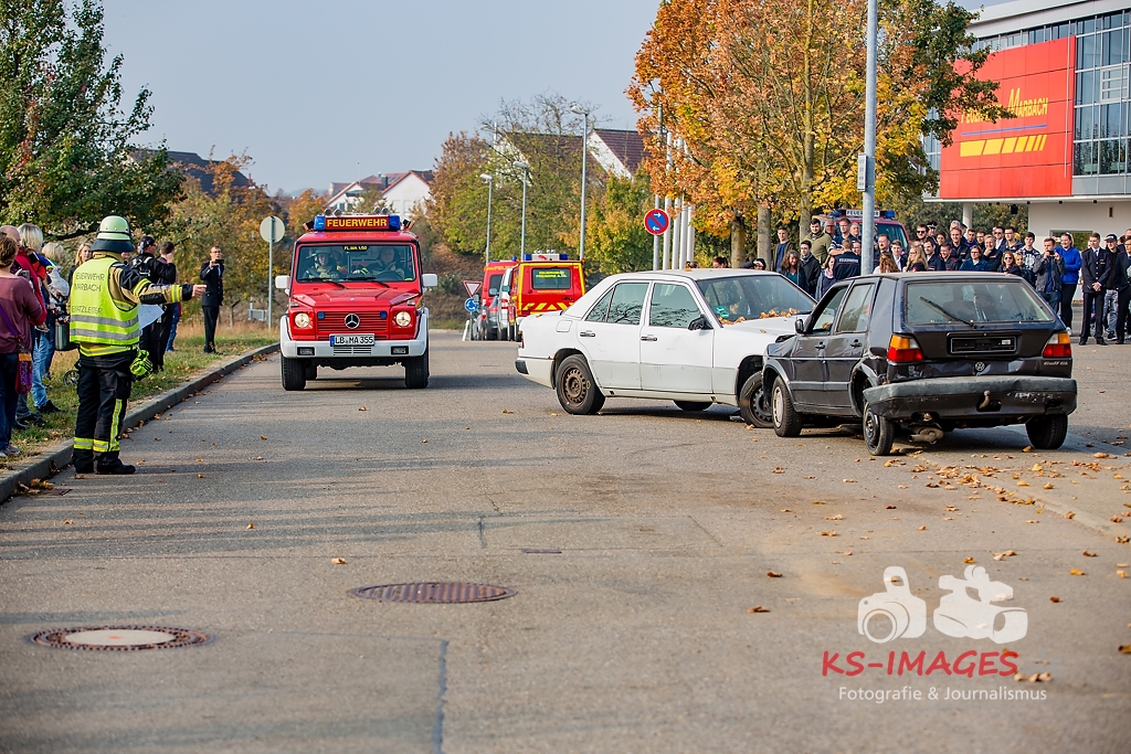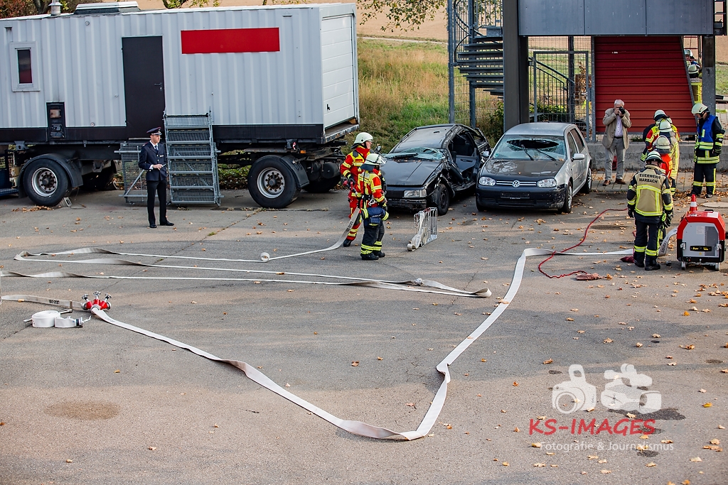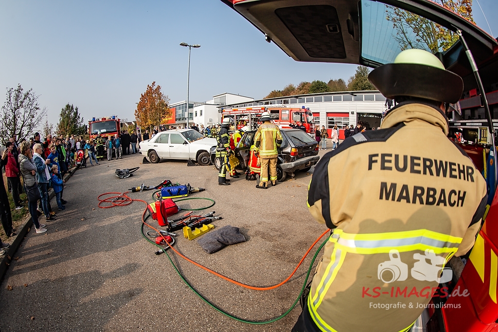 Kurz darauf beginnt die Einsatzübung im Hof der Feuerwache Marbach. Das Martinshorn der anrückenden Einsatzfahrzeuge lässt die zahlreichen Zuschauer auseinander rücken. Angenommen wird eine starke Rauchentwicklung aus einem Firmengebäude. Aufmerksame Passanten haben dies bemerkt und die Feuerwehr alarmiert. Rauch dringt aus einer Tür des Gebäudes. Auf einem Balkon im 1. Obergeschoss des Übungsturms ruft eine Person um Hilfe. Durch das Geschehen abgelenkt prallt ein Autofahrer auf ein parkendes Fahrzeug und wird in seinem PKW eingeklemmt. Das Besatzung des ersten eintreffenden Feuerwehrfahrzeugs bereitet die Rettung der auf dem Balkon nach Hilfe rufenden Person vor. Über eine Steckleiter wird der Jugendliche der Jugendfeuerwehr, der den Mitarbeiter mimt, gerettet. Das zweite eintreffende Löschfahrzeug bereitet eine so genannte Riegelstellung vor, um ein benachbartes Wohnhaus vor dem Übergreifen der Flammen zu schützen. Der Vorausrüstwagen und der Rüstwagen kümmern sich zusammen mit dem dritten anrückenden Löschfahrzeug um den Verkehrsunfall. Die in den Unfall verwickelten Fahrzeuge werden von den Nachwuchskräften fachgerecht gesichert und der verletzte Fahrer wird aus seinem PKW befreit. Er wird bis zum Eintreffen des Rettungsdienstes von den Feuerwehrangehörigen erstversorgt. Weiterhin muss auch bei einem Verkehrsunfall der Brandschutz sichergestellt werden, das die Mannschaft des dritten Löschfahrzeugs ebenfalls übernimmt.