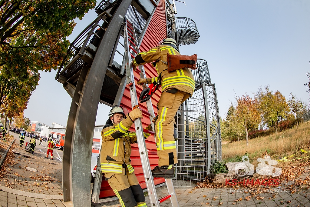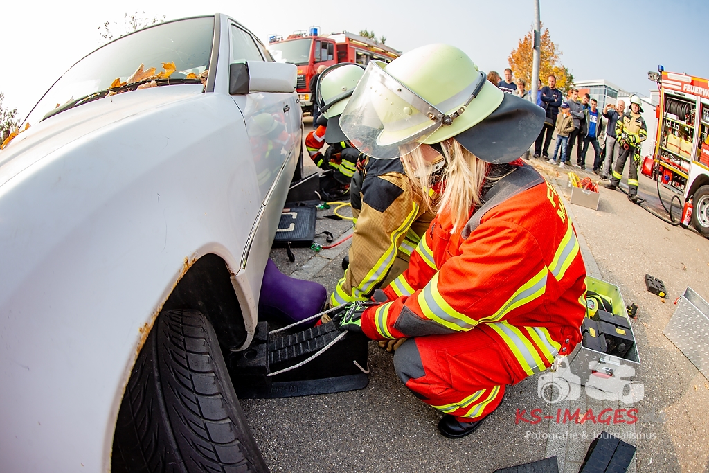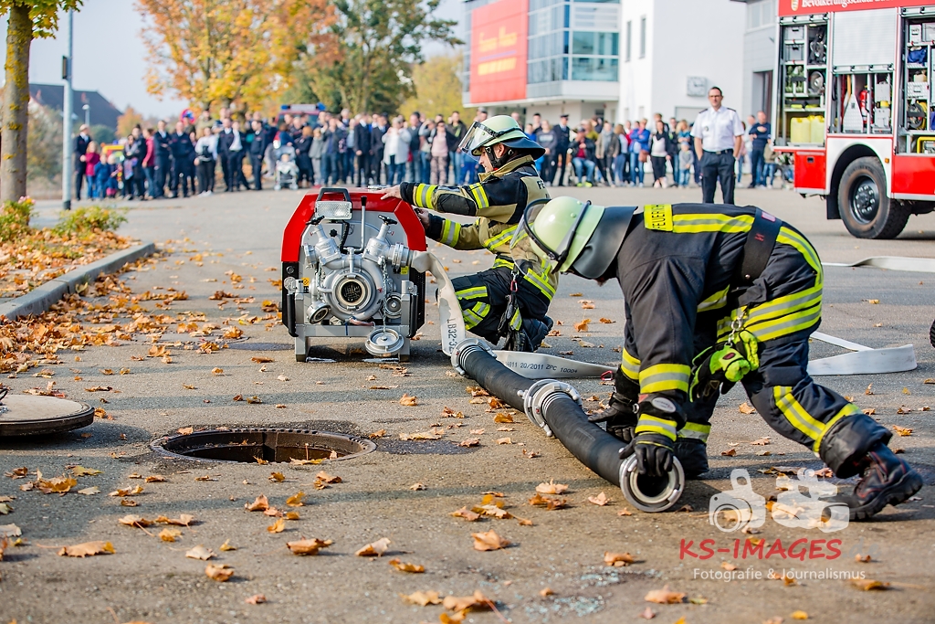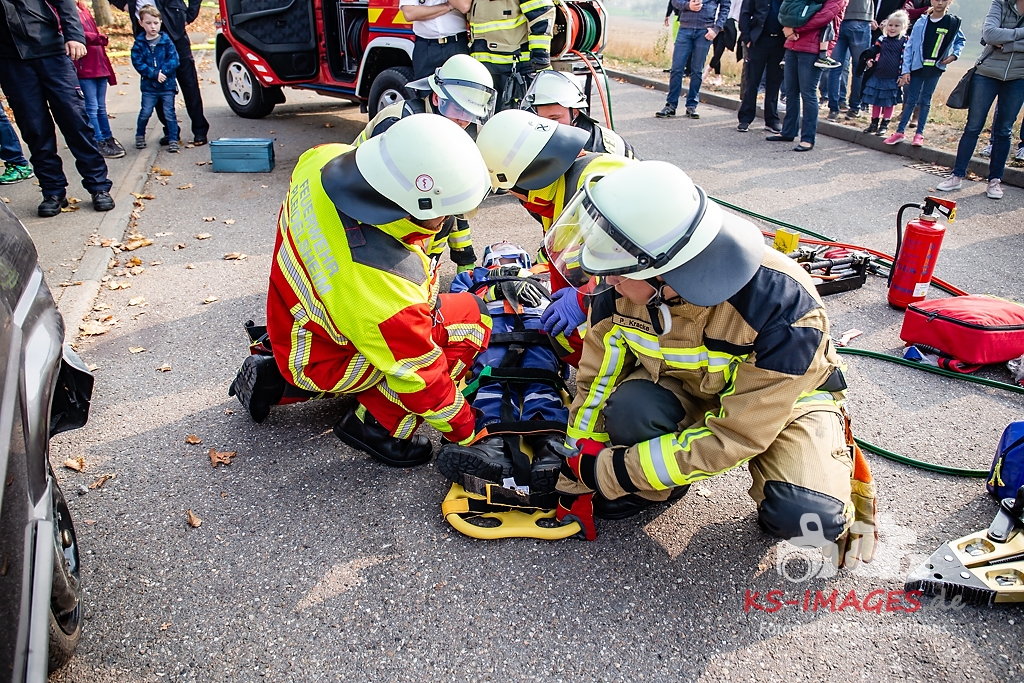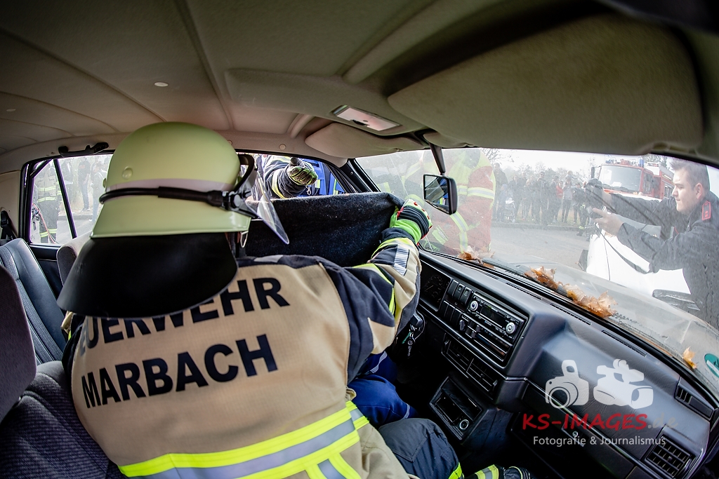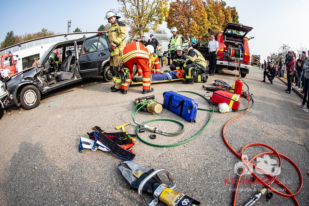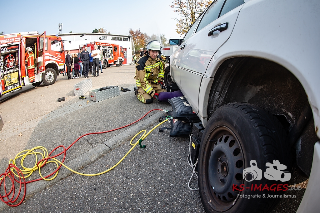 Kurz darauf beginnt die Einsatzübung im Hof der Feuerwache Marbach. Das Martinshorn der anrückenden Einsatzfahrzeuge lässt die zahlreichen Zuschauer auseinander rücken. Angenommen wird eine starke Rauchentwicklung aus einem Firmengebäude. Aufmerksame Passanten haben dies bemerkt und die Feuerwehr alarmiert. Rauch dringt aus einer Tür des Gebäudes. Auf einem Balkon im 1. Obergeschoss des Übungsturms ruft eine Person um Hilfe. Durch das Geschehen abgelenkt prallt ein Autofahrer auf ein parkendes Fahrzeug und wird in seinem PKW eingeklemmt. Das Besatzung des ersten eintreffenden Feuerwehrfahrzeugs bereitet die Rettung der auf dem Balkon nach Hilfe rufenden Person vor. Über eine Steckleiter wird der Jugendliche der Jugendfeuerwehr, der den Mitarbeiter mimt, gerettet. Das zweite eintreffende Löschfahrzeug bereitet eine so genannte Riegelstellung vor, um ein benachbartes Wohnhaus vor dem Übergreifen der Flammen zu schützen. Der Vorausrüstwagen und der Rüstwagen kümmern sich zusammen mit dem dritten anrückenden Löschfahrzeug um den Verkehrsunfall. Die in den Unfall verwickelten Fahrzeuge werden von den Nachwuchskräften fachgerecht gesichert und der verletzte Fahrer wird aus seinem PKW befreit. Er wird bis zum Eintreffen des Rettungsdienstes von den Feuerwehrangehörigen erstversorgt. Weiterhin muss auch bei einem Verkehrsunfall der Brandschutz sichergestellt werden, das die Mannschaft des dritten Löschfahrzeugs ebenfalls übernimmt.