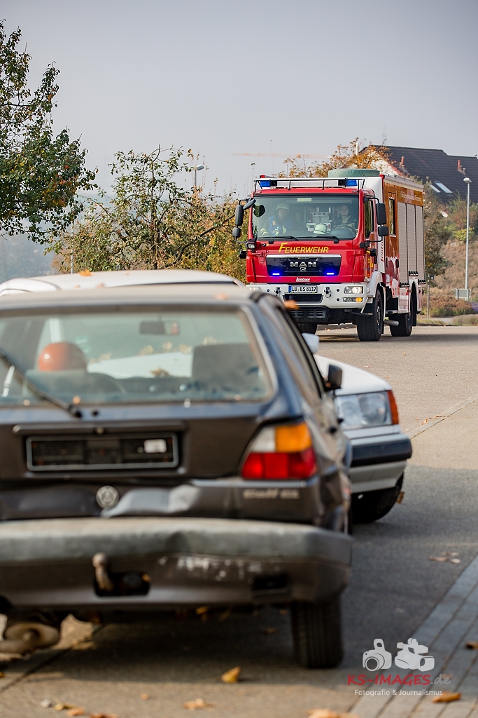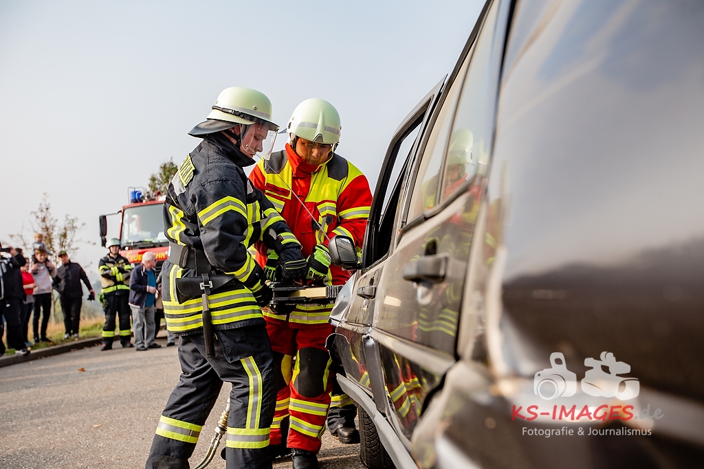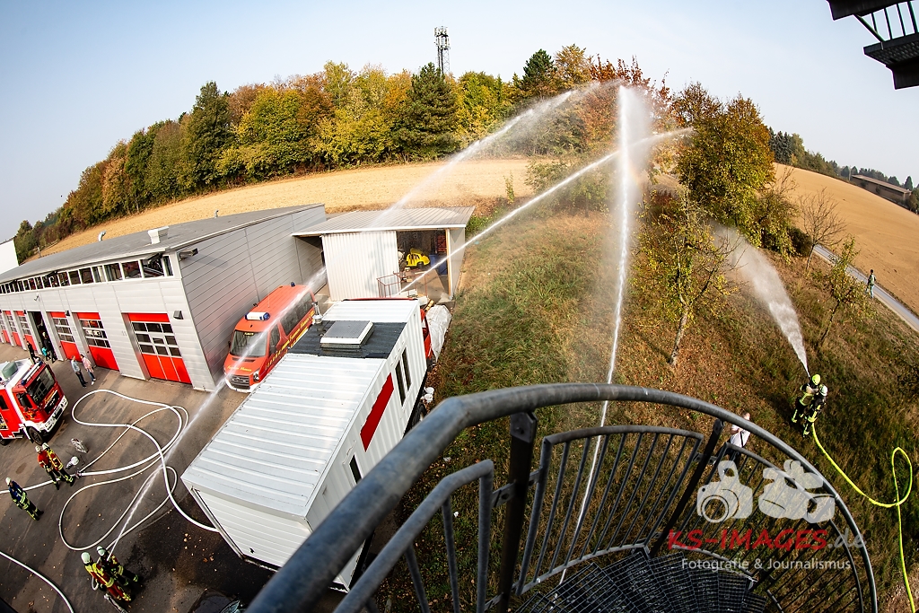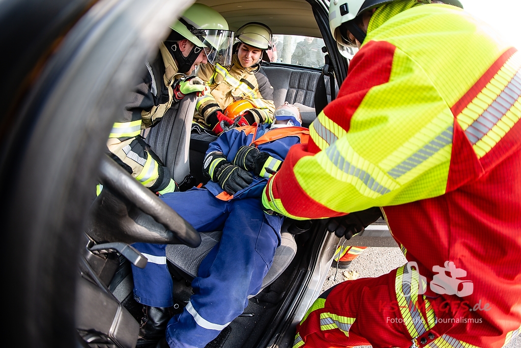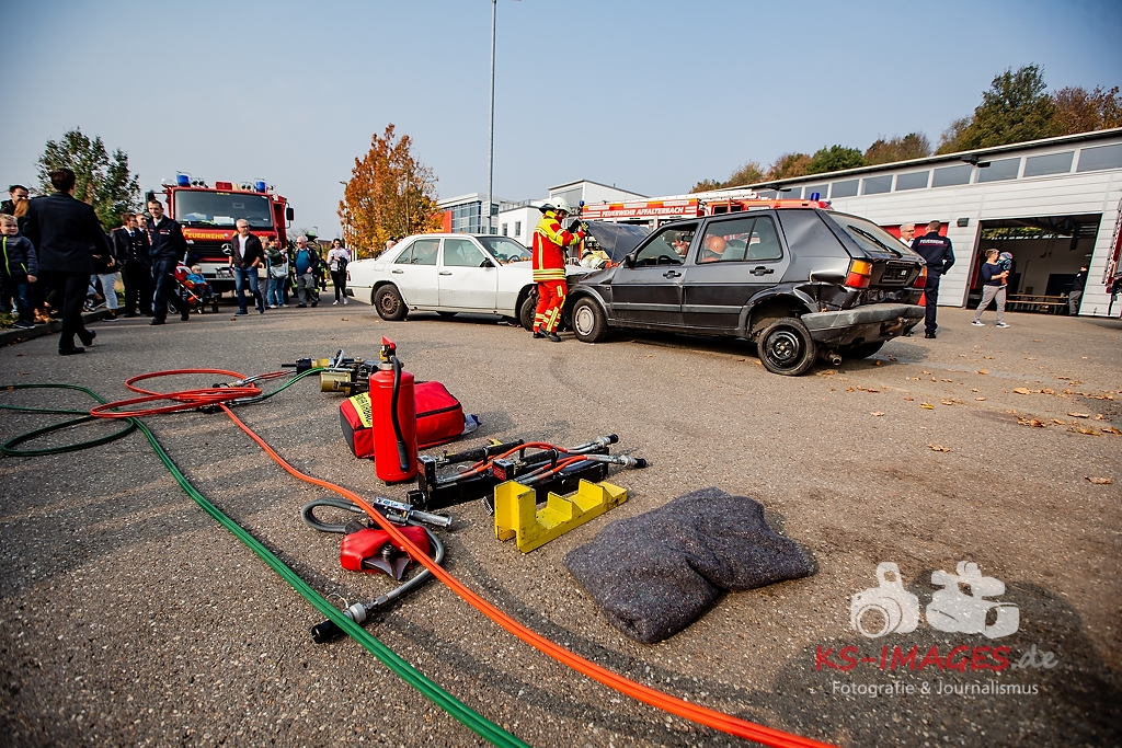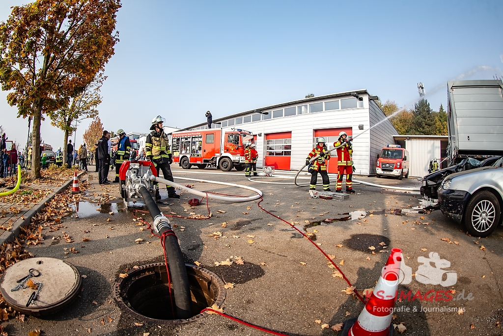 Kurz darauf beginnt die Einsatzübung im Hof der Feuerwache Marbach. Das Martinshorn der anrückenden Einsatzfahrzeuge lässt die zahlreichen Zuschauer auseinander rücken. Angenommen wird eine starke Rauchentwicklung aus einem Firmengebäude. Aufmerksame Passanten haben dies bemerkt und die Feuerwehr alarmiert. Rauch dringt aus einer Tür des Gebäudes. Auf einem Balkon im 1. Obergeschoss des Übungsturms ruft eine Person um Hilfe. Durch das Geschehen abgelenkt prallt ein Autofahrer auf ein parkendes Fahrzeug und wird in seinem PKW eingeklemmt. Das Besatzung des ersten eintreffenden Feuerwehrfahrzeugs bereitet die Rettung der auf dem Balkon nach Hilfe rufenden Person vor. Über eine Steckleiter wird der Jugendliche der Jugendfeuerwehr, der den Mitarbeiter mimt, gerettet. Das zweite eintreffende Löschfahrzeug bereitet eine so genannte Riegelstellung vor, um ein benachbartes Wohnhaus vor dem Übergreifen der Flammen zu schützen. Der Vorausrüstwagen und der Rüstwagen kümmern sich zusammen mit dem dritten anrückenden Löschfahrzeug um den Verkehrsunfall. Die in den Unfall verwickelten Fahrzeuge werden von den Nachwuchskräften fachgerecht gesichert und der verletzte Fahrer wird aus seinem PKW befreit. Er wird bis zum Eintreffen des Rettungsdienstes von den Feuerwehrangehörigen erstversorgt. Weiterhin muss auch bei einem Verkehrsunfall der Brandschutz sichergestellt werden, das die Mannschaft des dritten Löschfahrzeugs ebenfalls übernimmt.