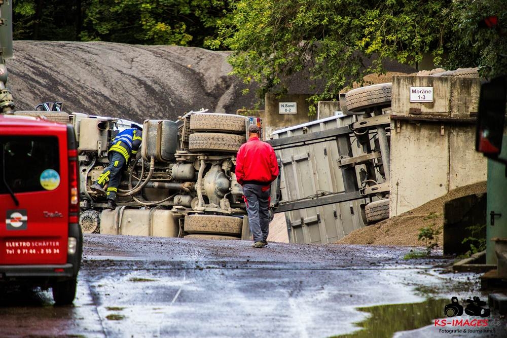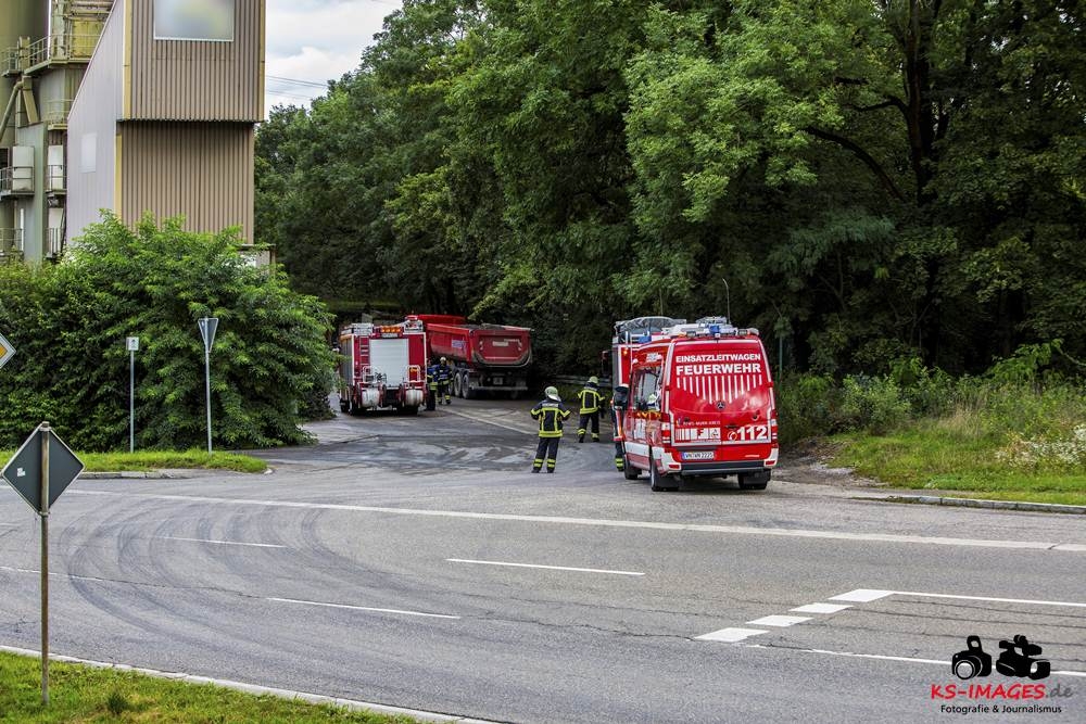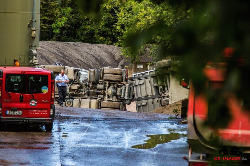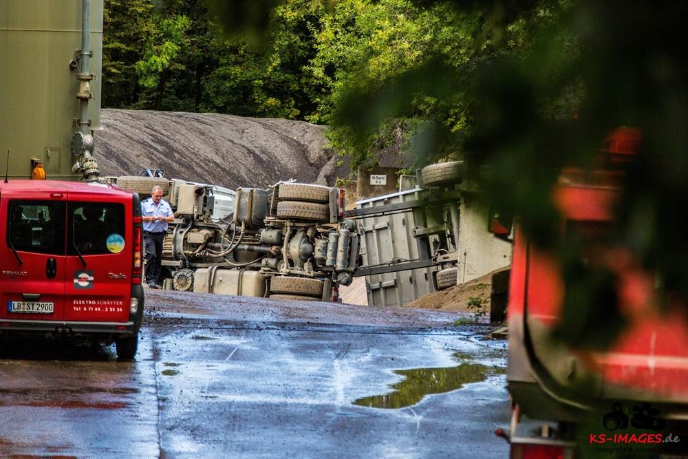 Mit schweren Verletzungen musste am Dienstagmittag ein 59 Jahre alter Lkw-Fahrer nach einem Arbeitsunfall in ein Krankenhaus eingeliefert werden. Der Mann fuhr gegen 11.45 Uhr auf dem Gelände des Asphaltwerks in der Neckarstraße mit seinem voll beladenen Sattelzug rückwärts an eine Schüttung, um dort Schotter abzukippen. Der Sattelzug stand hierbei aufgrund eines seitlichen Gefälles des Untergrundes leicht schräg. Als der Mann den Auflieger abkippen wollte und dieser hierzu in die Höhe fuhr, bekam der Sattelzug Übergewicht und kippte komplett nach rechts. Hierdurch wurde der 59-Jährige im Fahrerhaus umhergeschleudert und zog sich schwere Verletzungen zu. Nach dem derzeitigen ermittlungsstand kann ein Fremdverschulden ausgeschlossen werden
