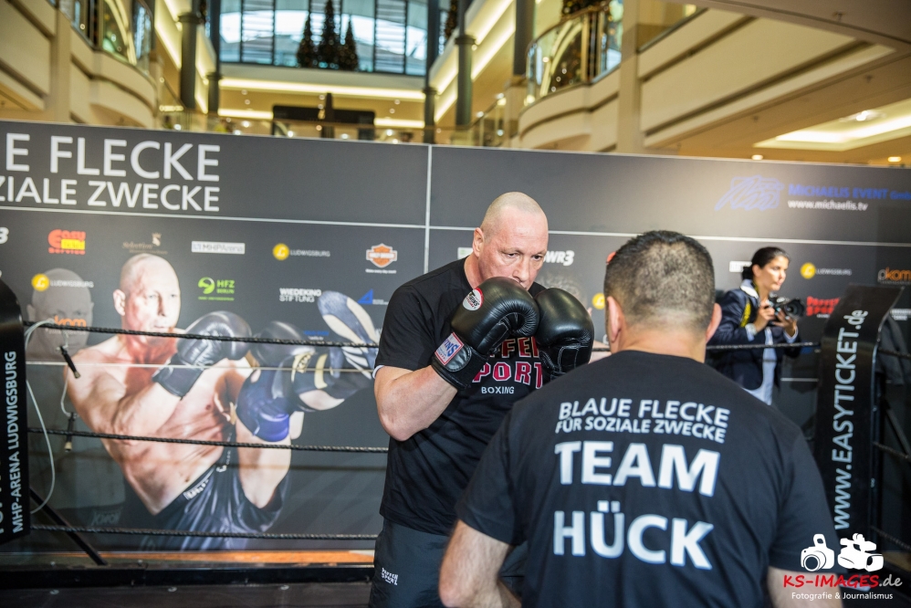 Hueck vs. Krasniqi Pressetraining 13.11.2013 Charety Boxen_ 0061Am 16.11.2013 ist es soweit – Uwe Hück und Luan Krasniqi werden in der MHP Arena in Ludwigsburg im Ring gegenüber stehen und für einen guten Zweck kämpfen. Am 13.11.2013 wurde im Breunigerland in Ludwigsburg ein Pressetraining abgehalten.