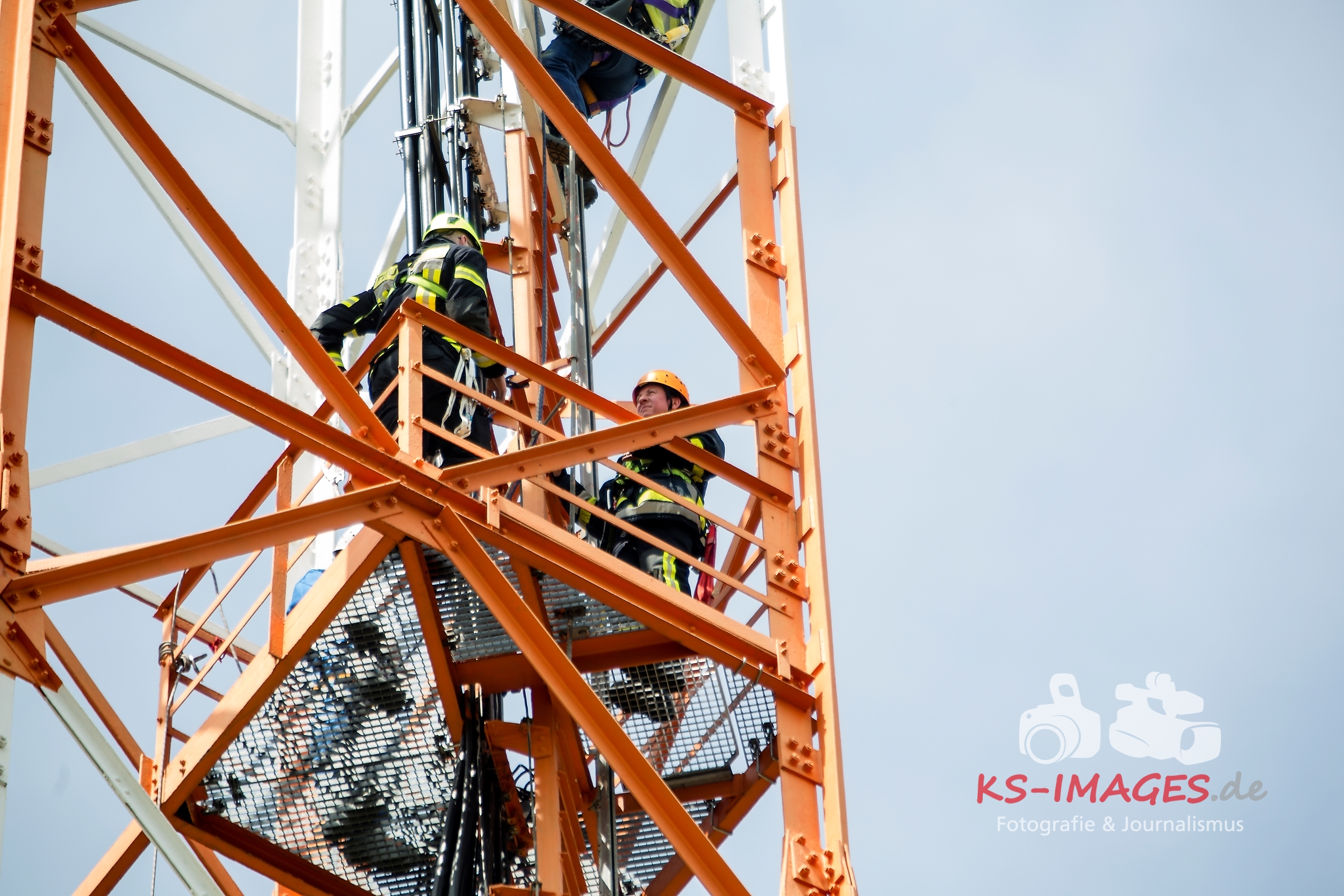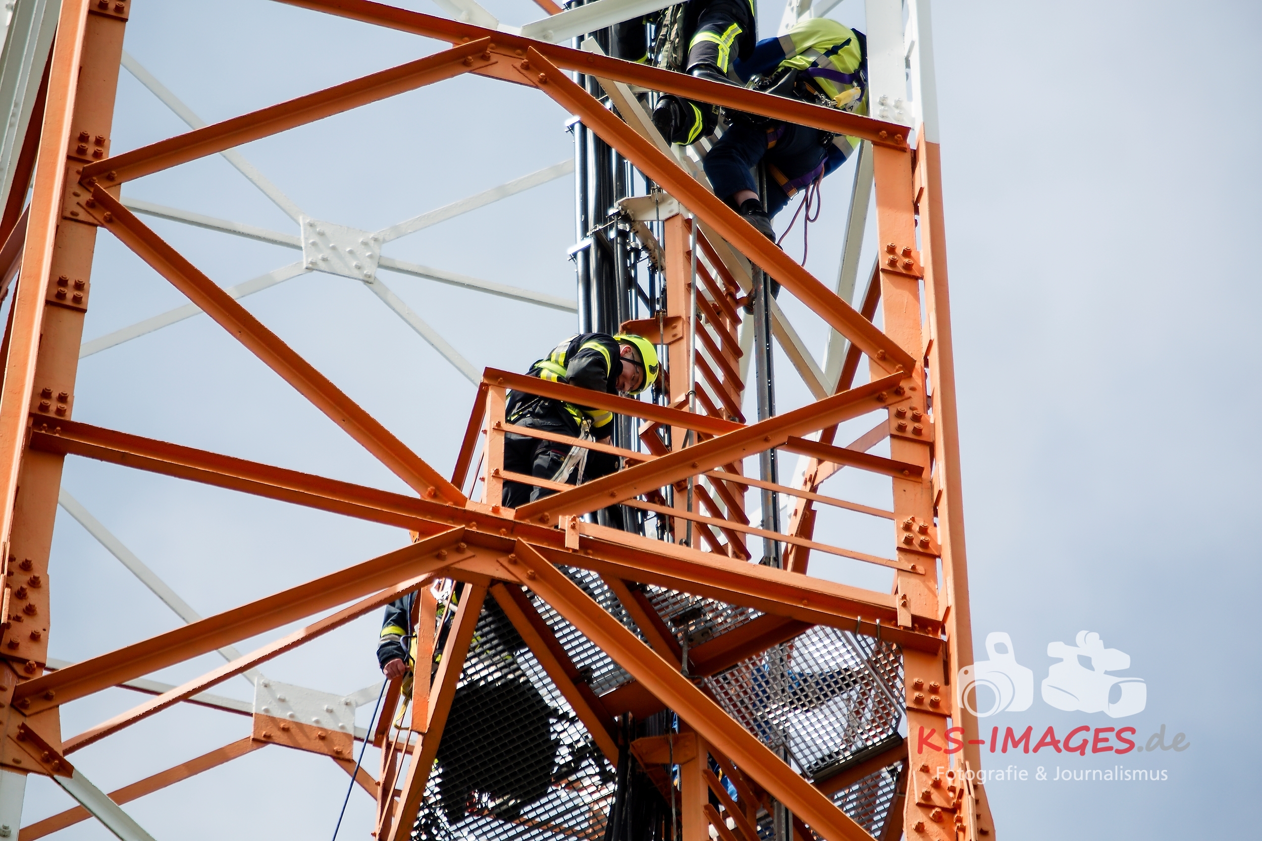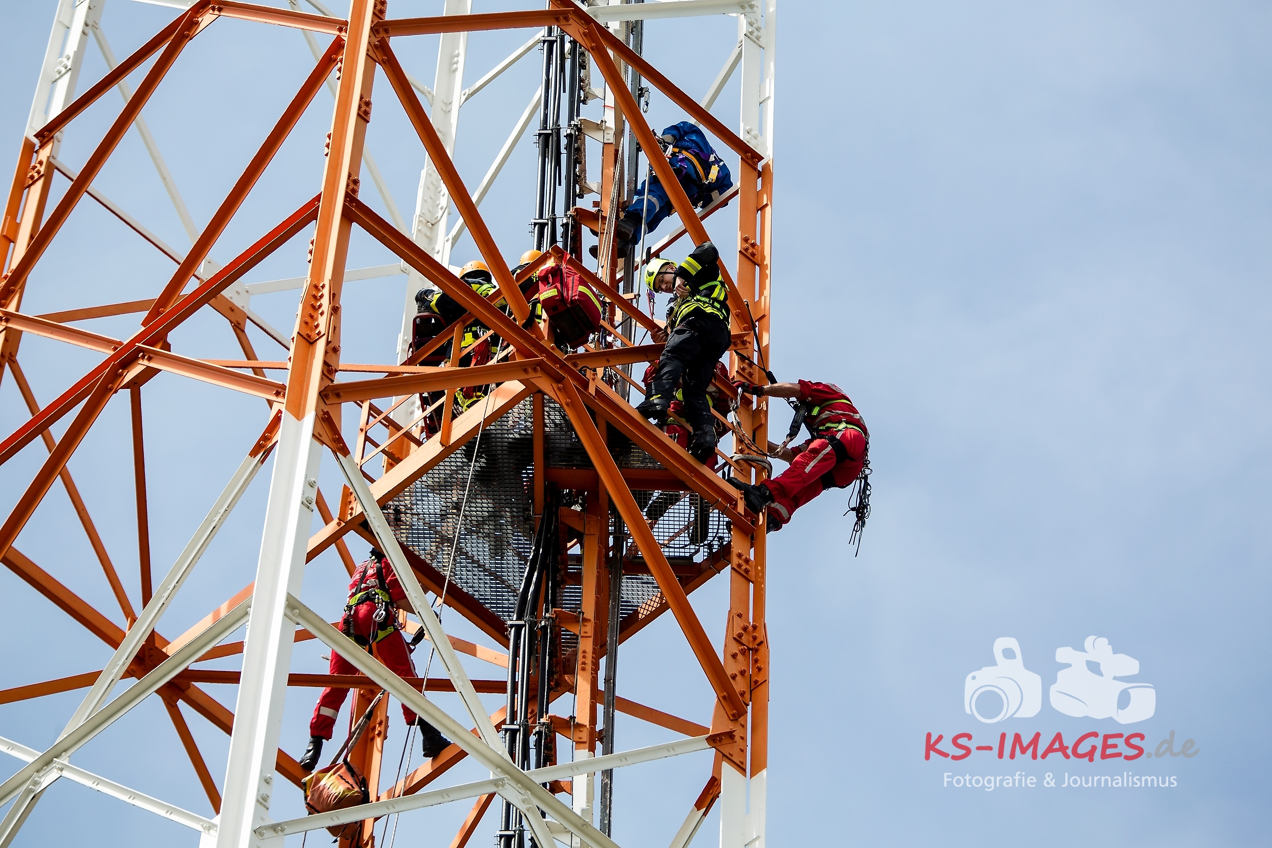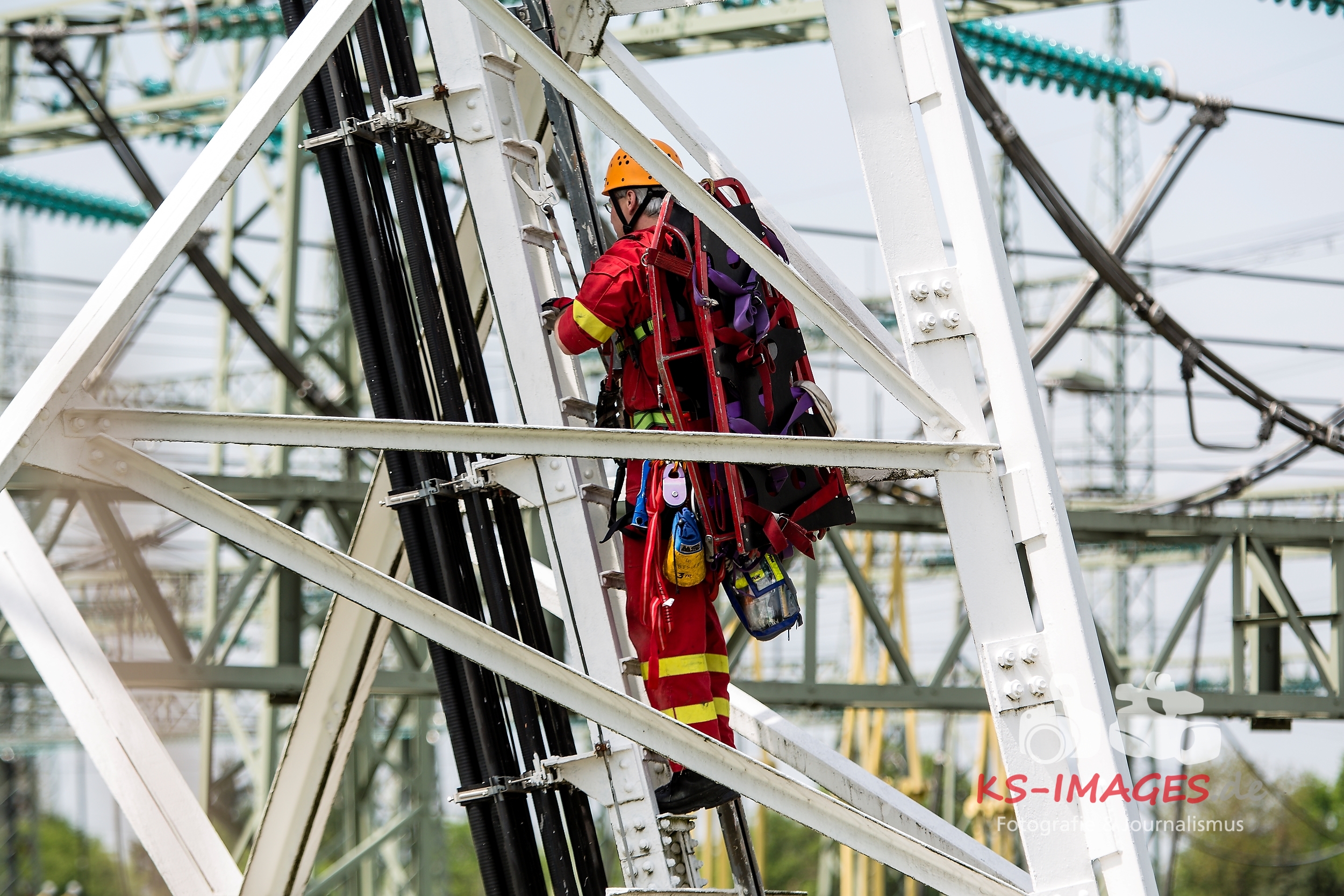 0 LUDWIGSBURG: Am Nachmittag des 11.05.2016 wurde von der Feuerwehr Ludwigsburg der hauptamtlichen Abteilung in Zusammenarbeit mit der Höhenrettungseinheit der Feuerwehr Ludwigsburg an dem rund 70 Meter hohen Funkmast des Umspannwerks Hoheneck der Firma Amprion eine Höhenrettung durchgeführt.