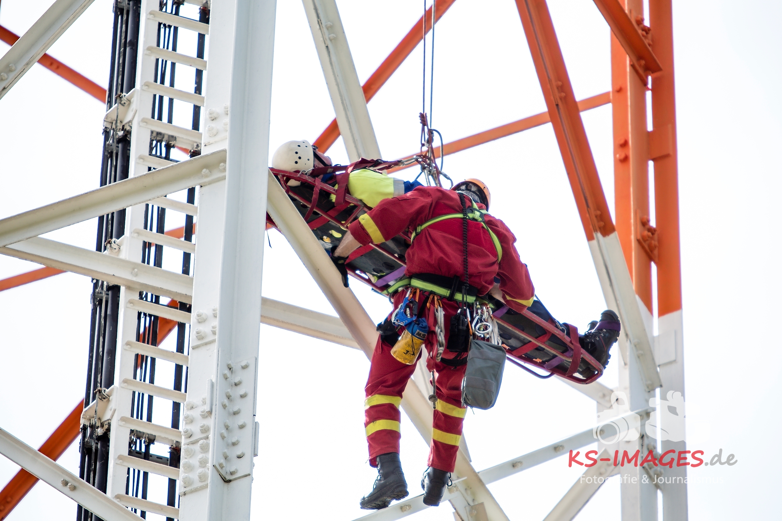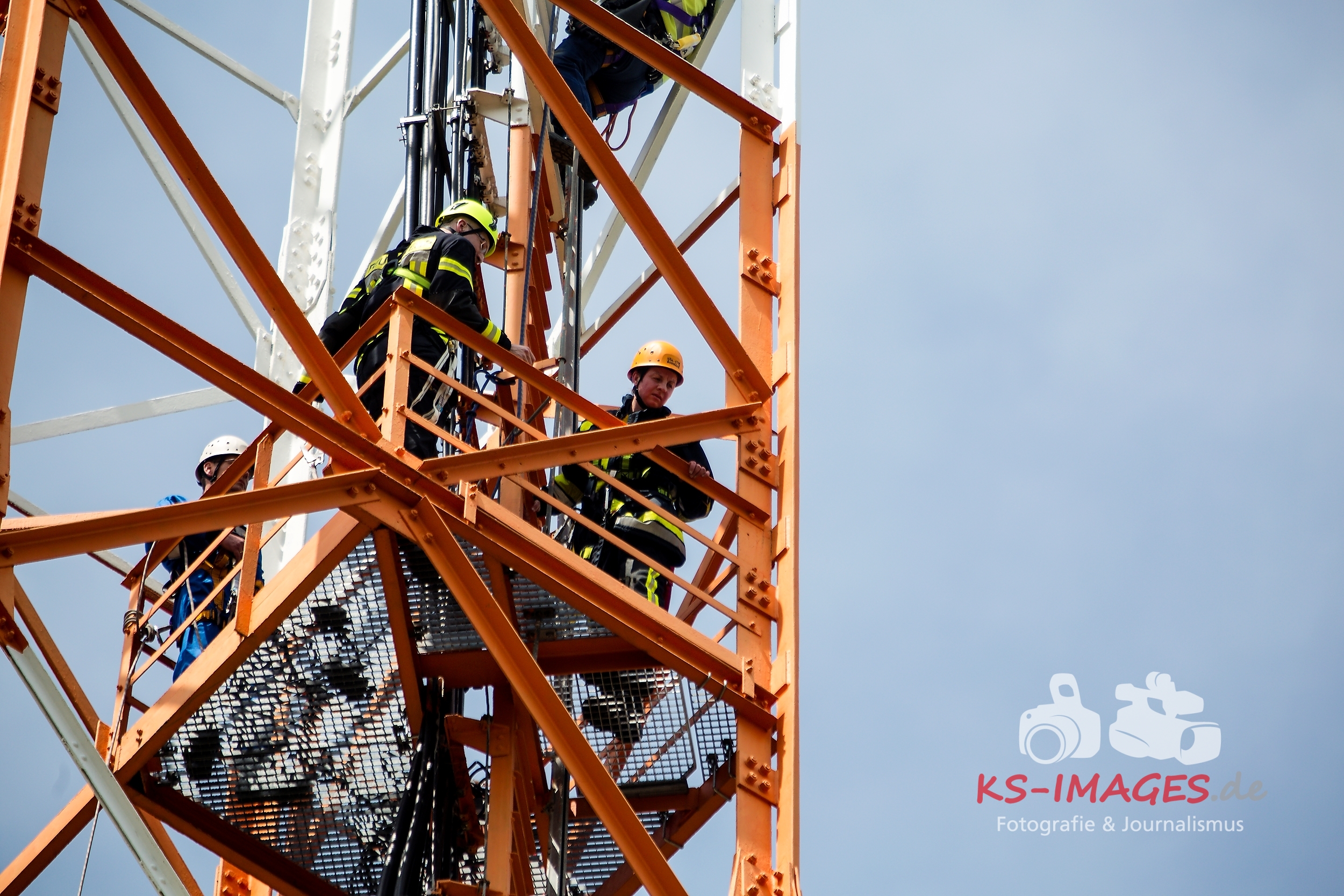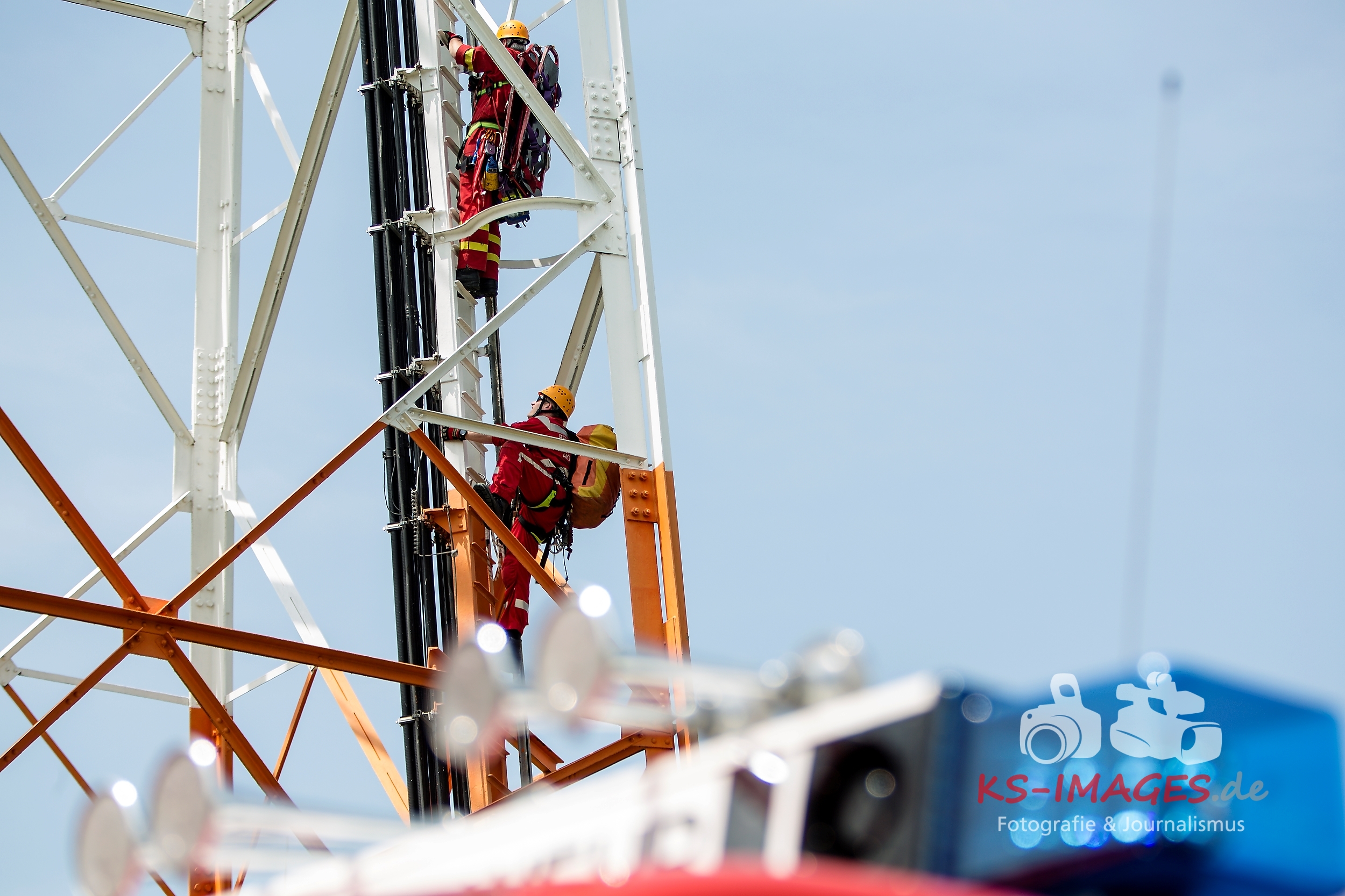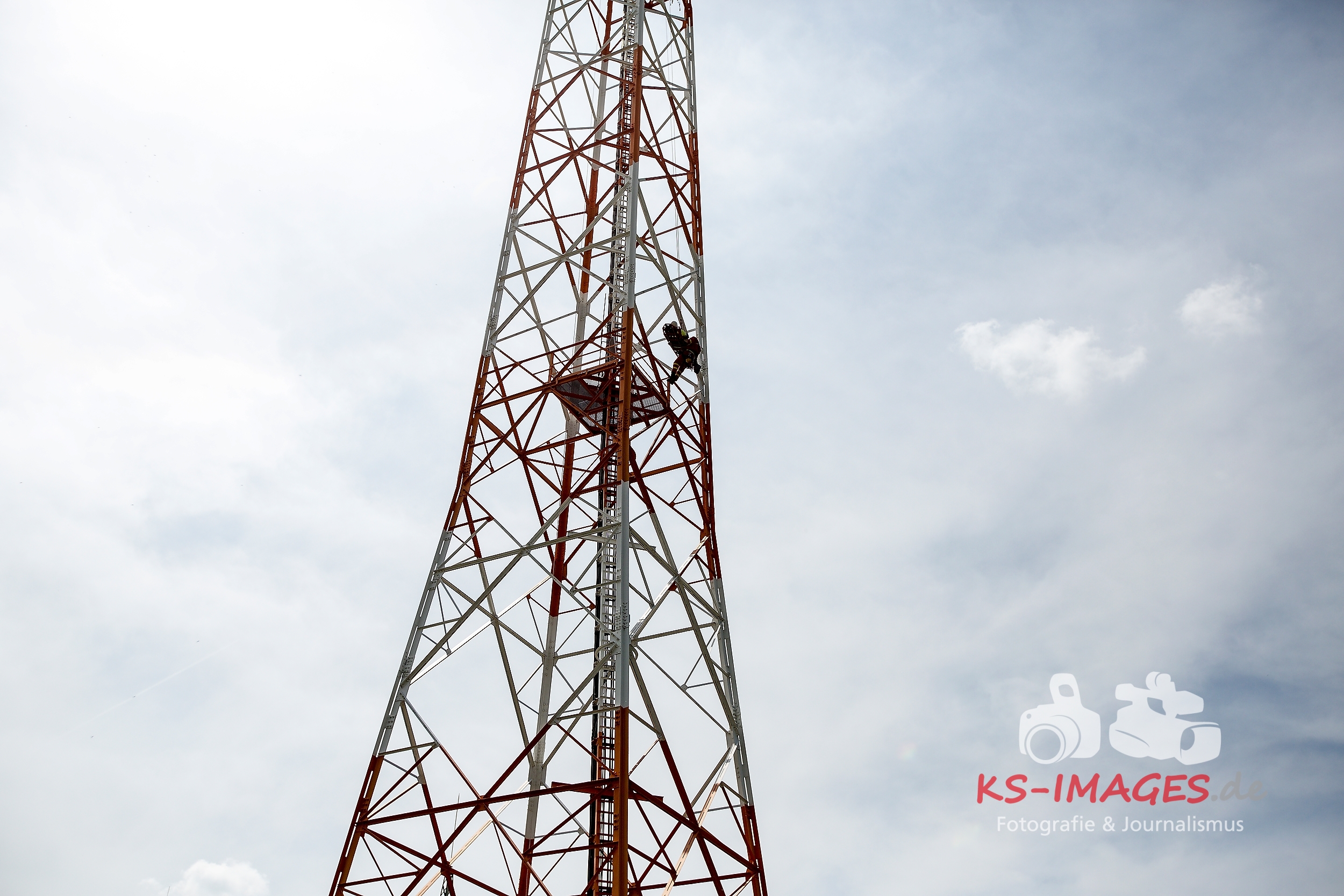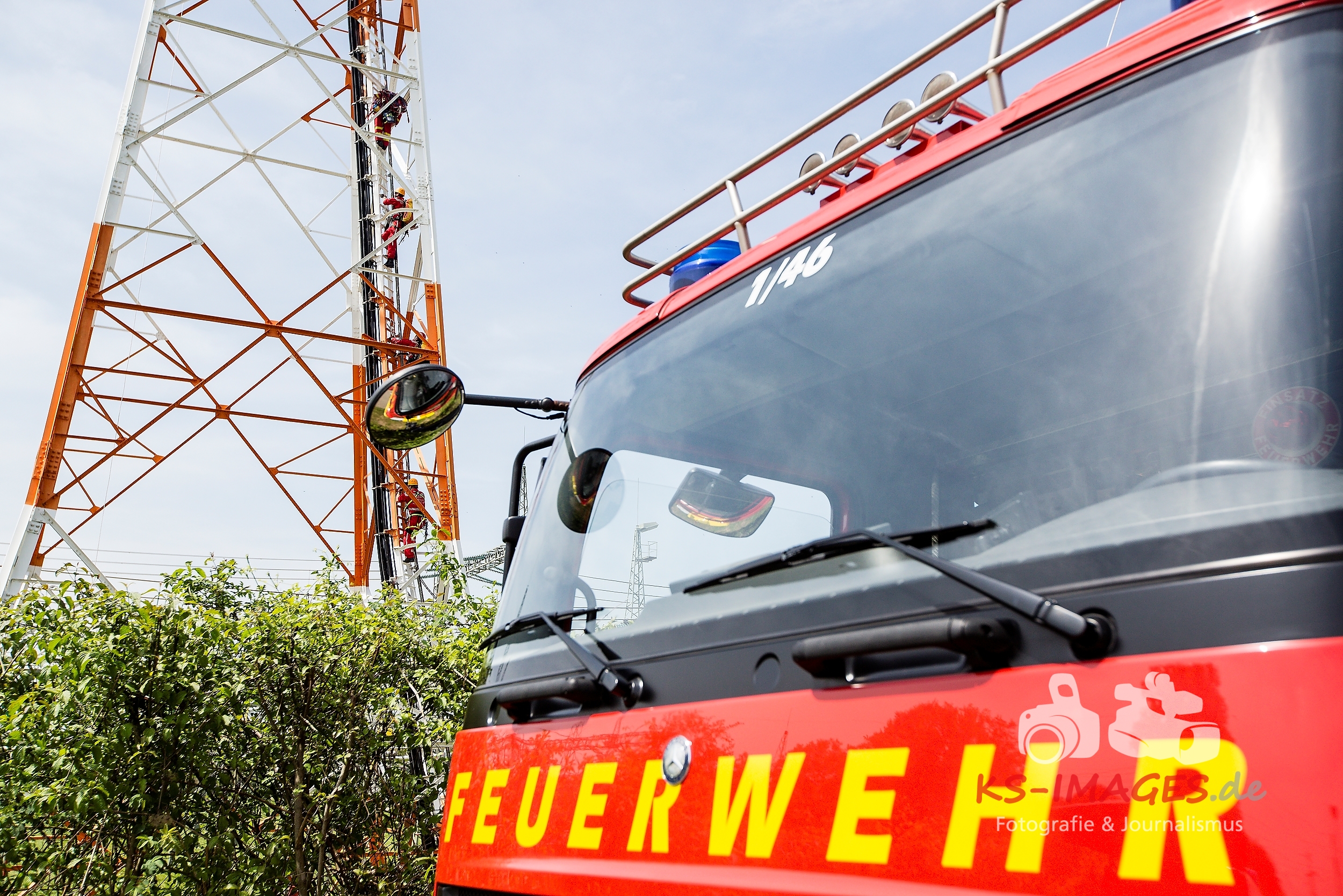 0 LUDWIGSBURG: Am Nachmittag des 11.05.2016 wurde von der Feuerwehr Ludwigsburg der hauptamtlichen Abteilung in Zusammenarbeit mit der Höhenrettungseinheit der Feuerwehr Ludwigsburg an dem rund 70 Meter hohen Funkmast des Umspannwerks Hoheneck der Firma Amprion eine Höhenrettung durchgeführt.