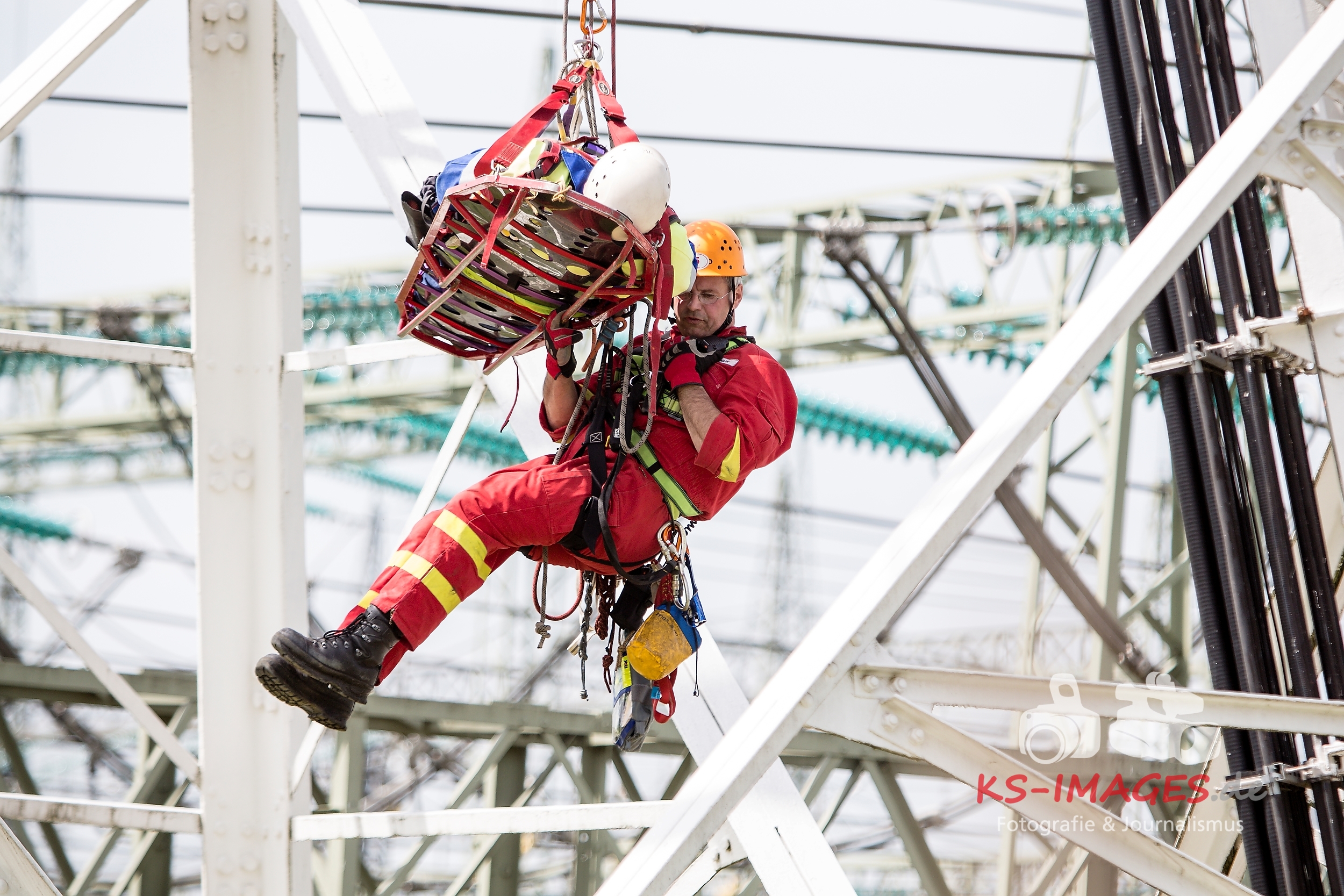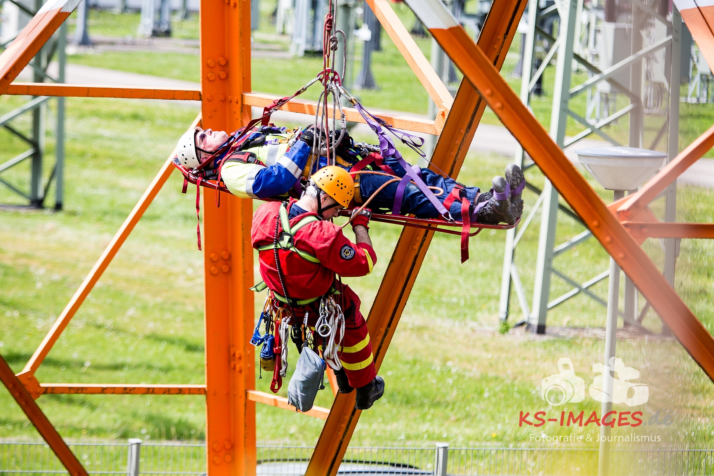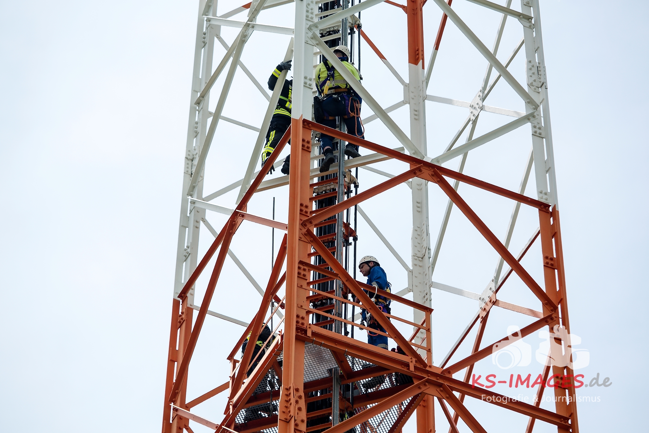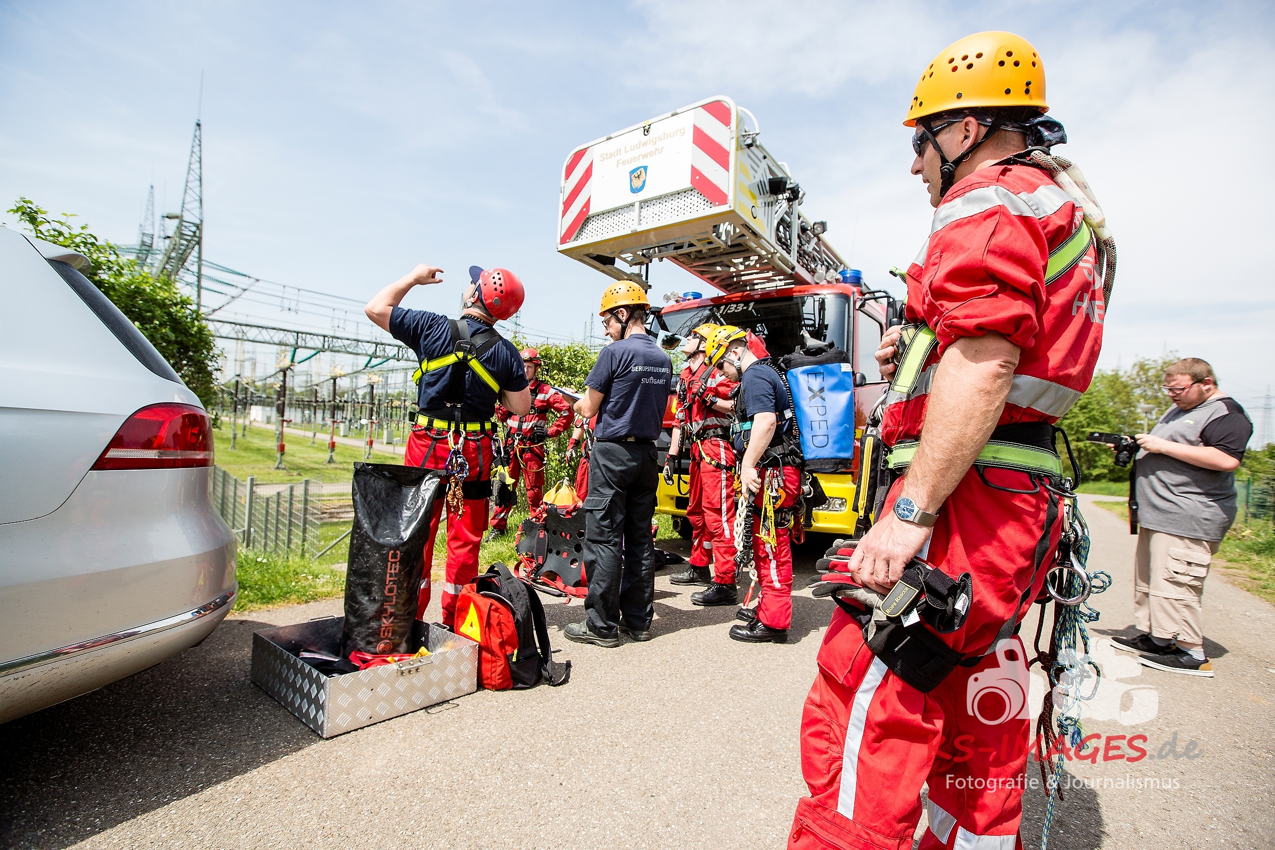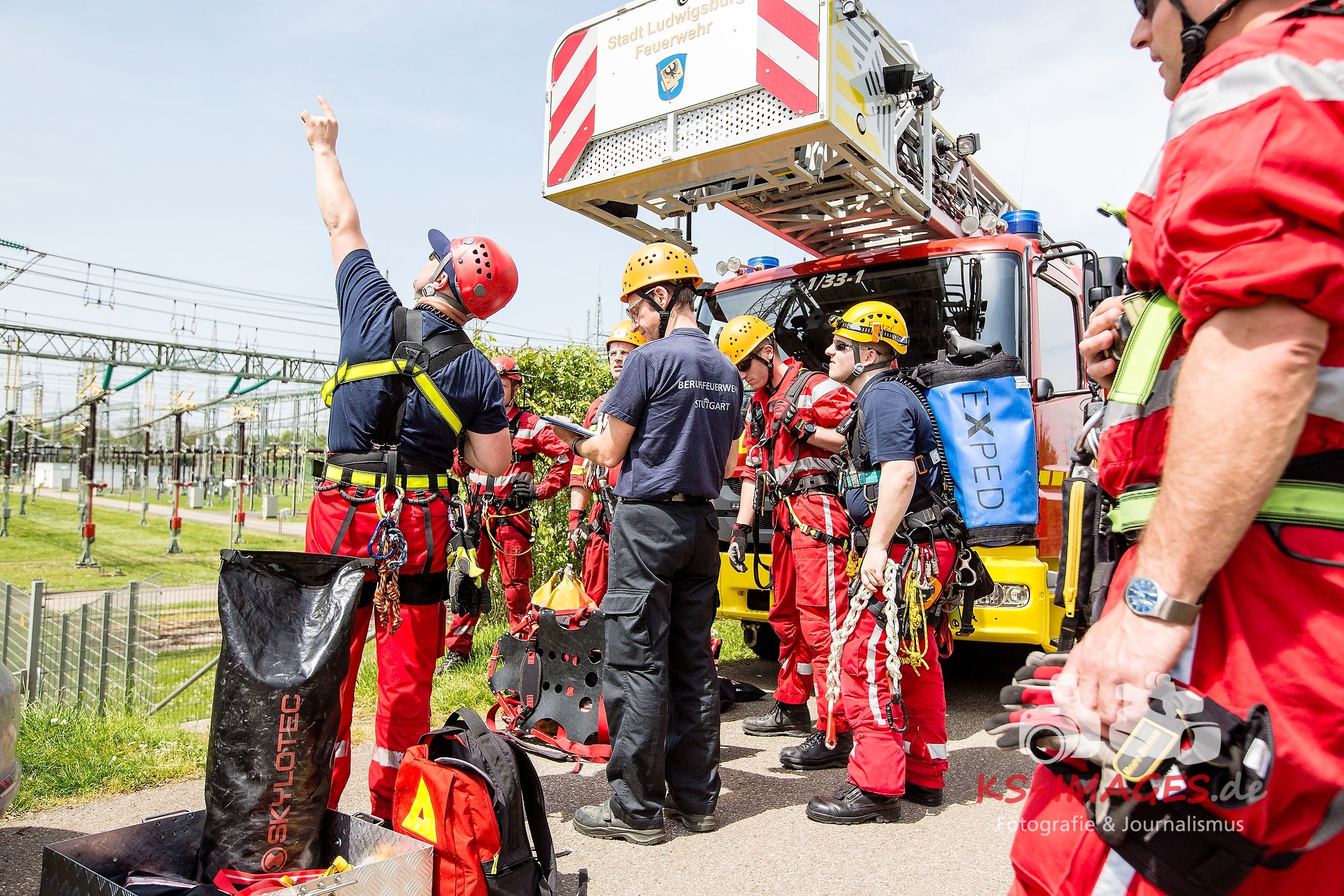 Herr Bläse von der Feuerwehr Ludwigsburg hatte sich zusammen mit der Firma Amprion ein Übung Szenarium auserarbeitet. Es sollte hier die Zusammenarbeit mit der Höhenrettungsgruppe aus Stuttgart geübt werden.