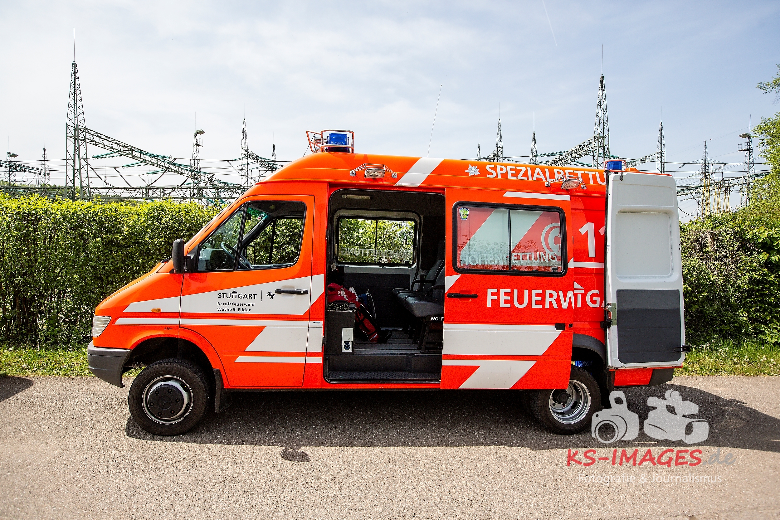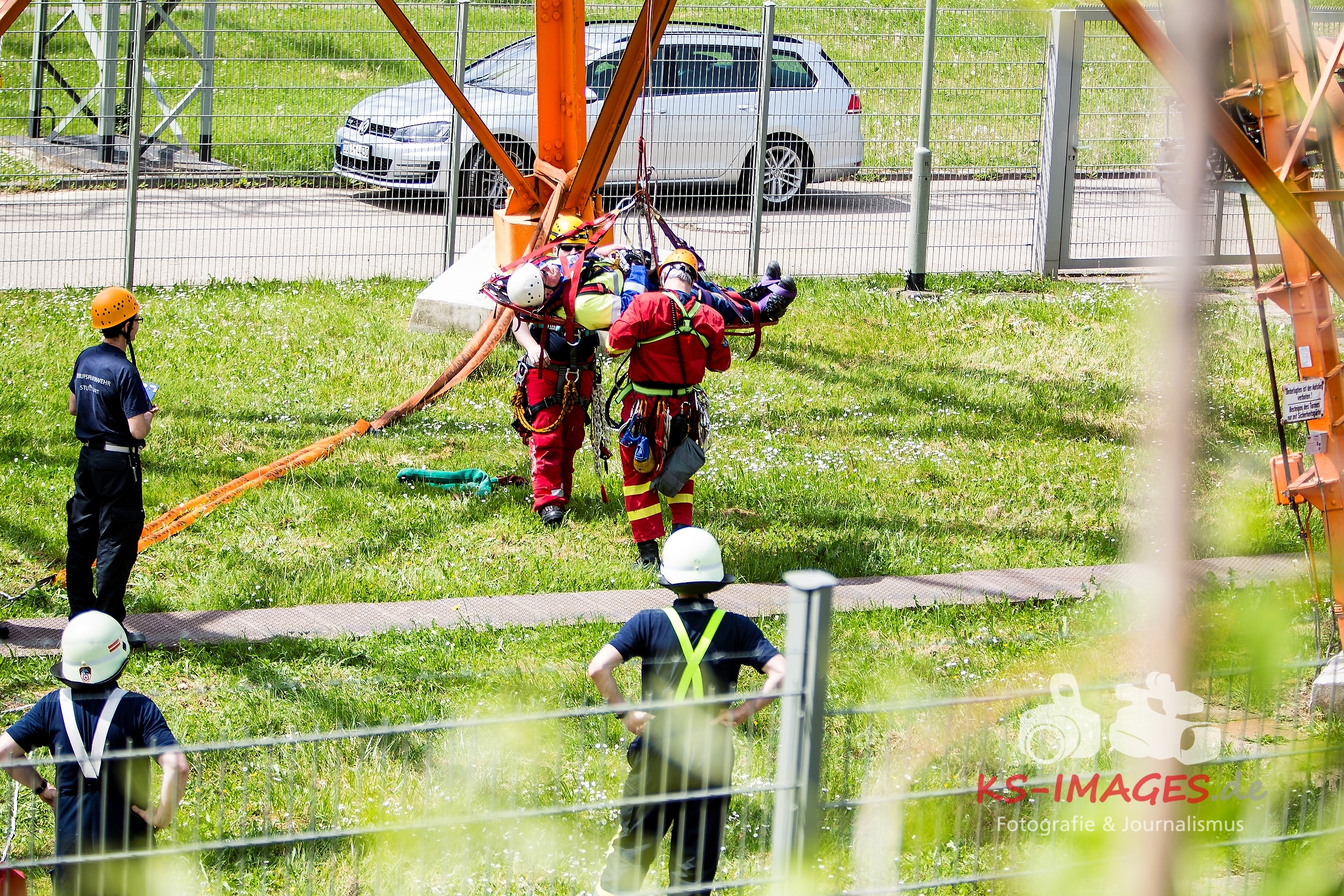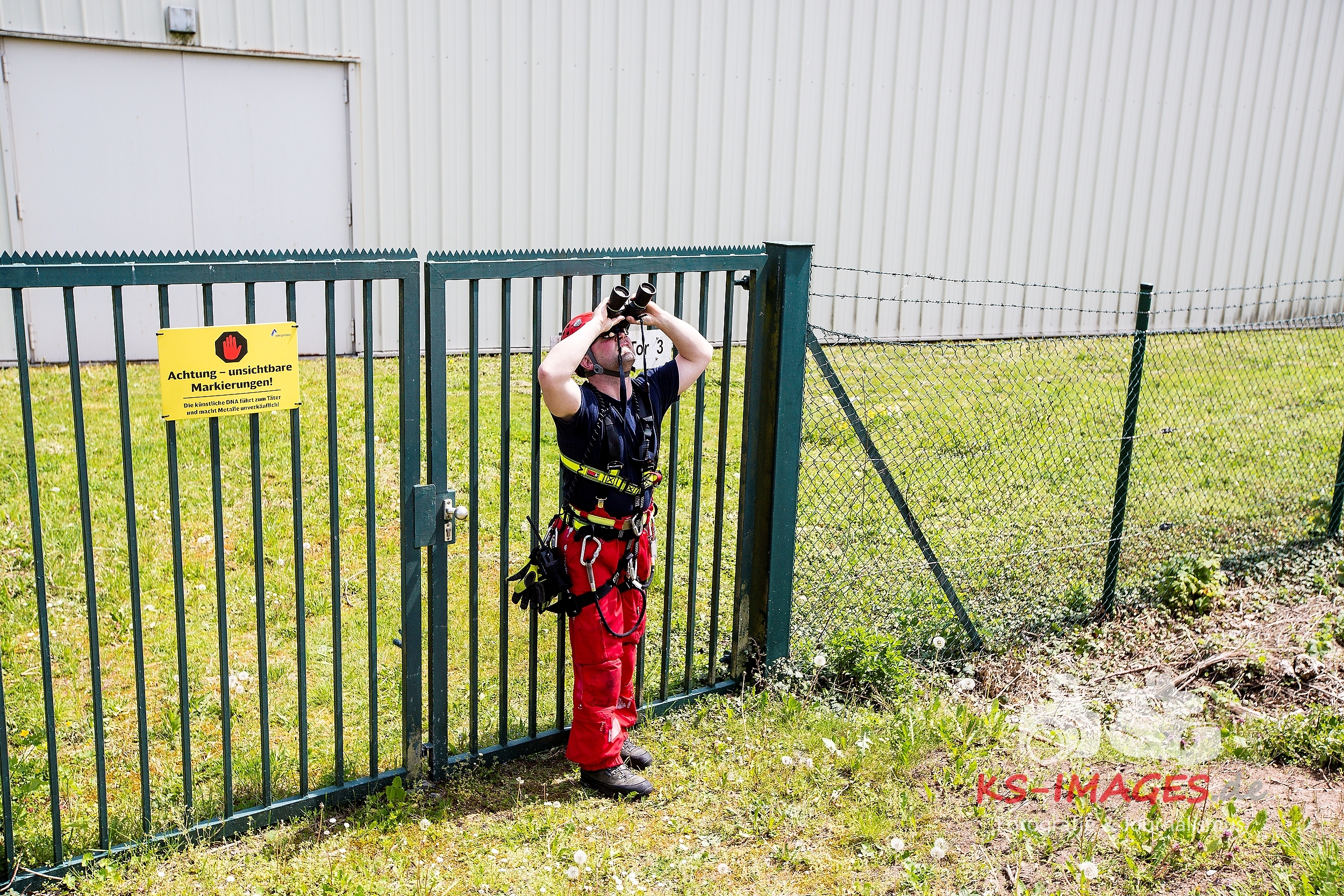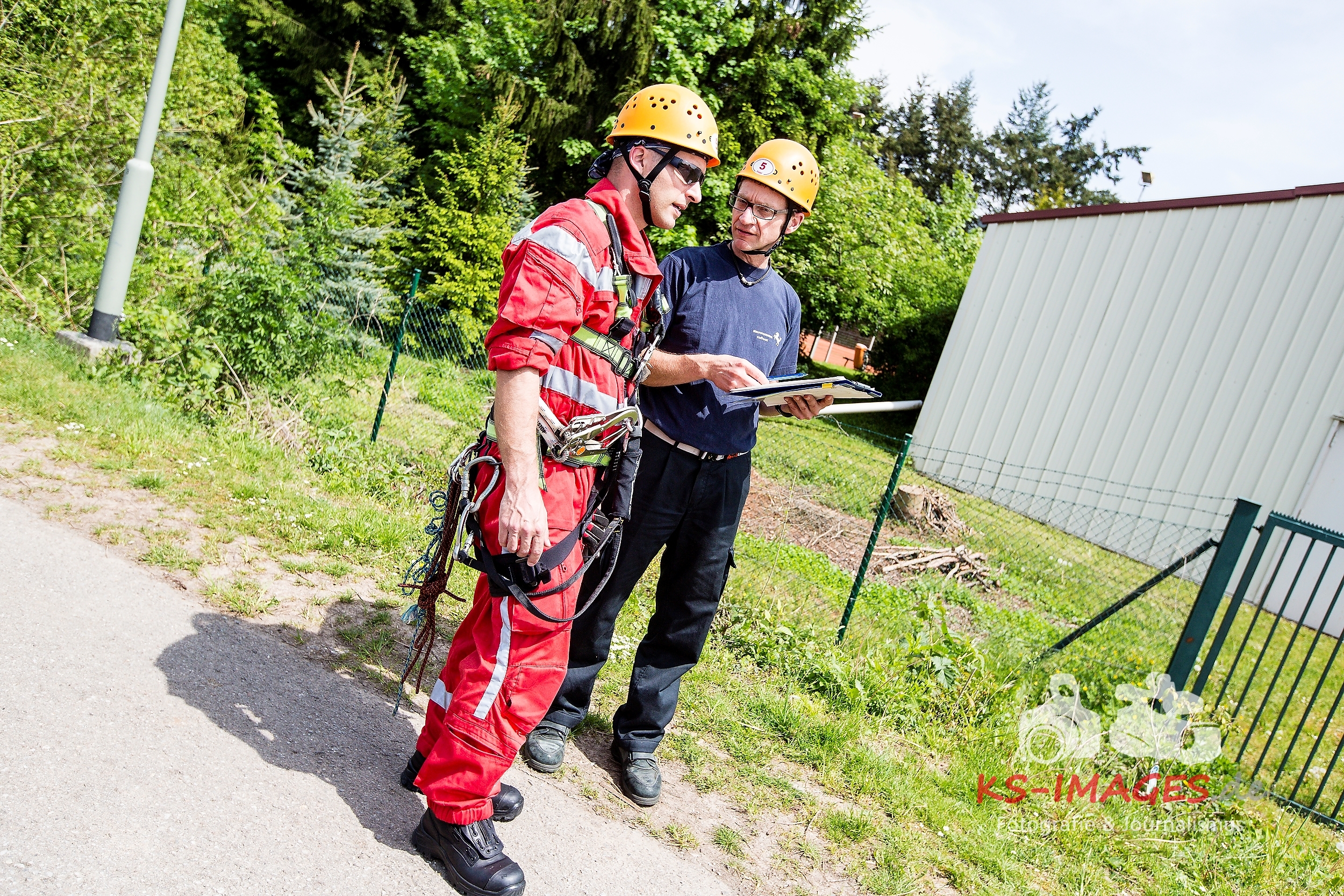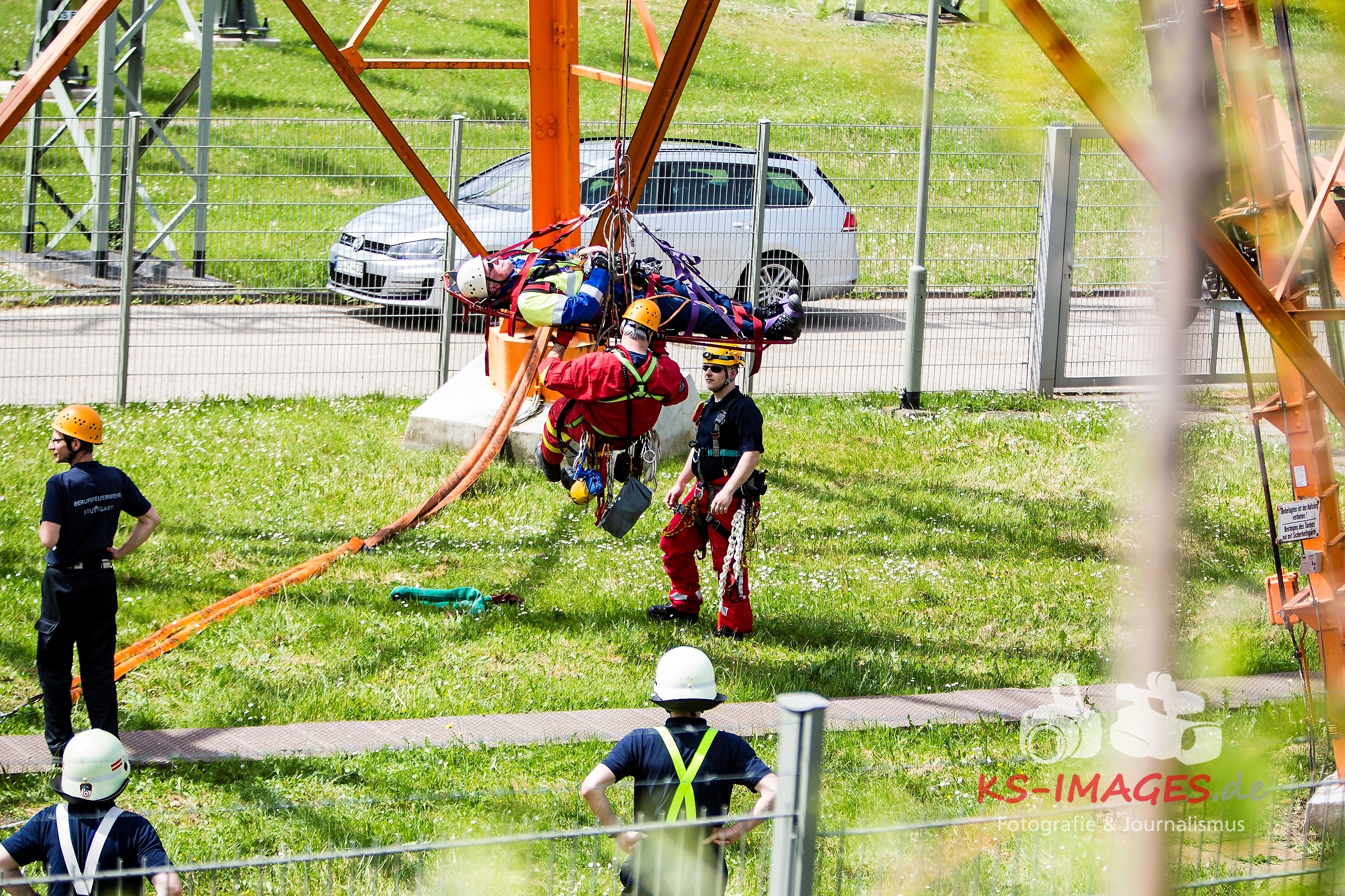 Herr Bläse von der Feuerwehr Ludwigsburg hatte sich zusammen mit der Firma Amprion ein Übung Szenarium auserarbeitet. Es sollte hier die Zusammenarbeit mit der Höhenrettungsgruppe aus Stuttgart geübt werden.