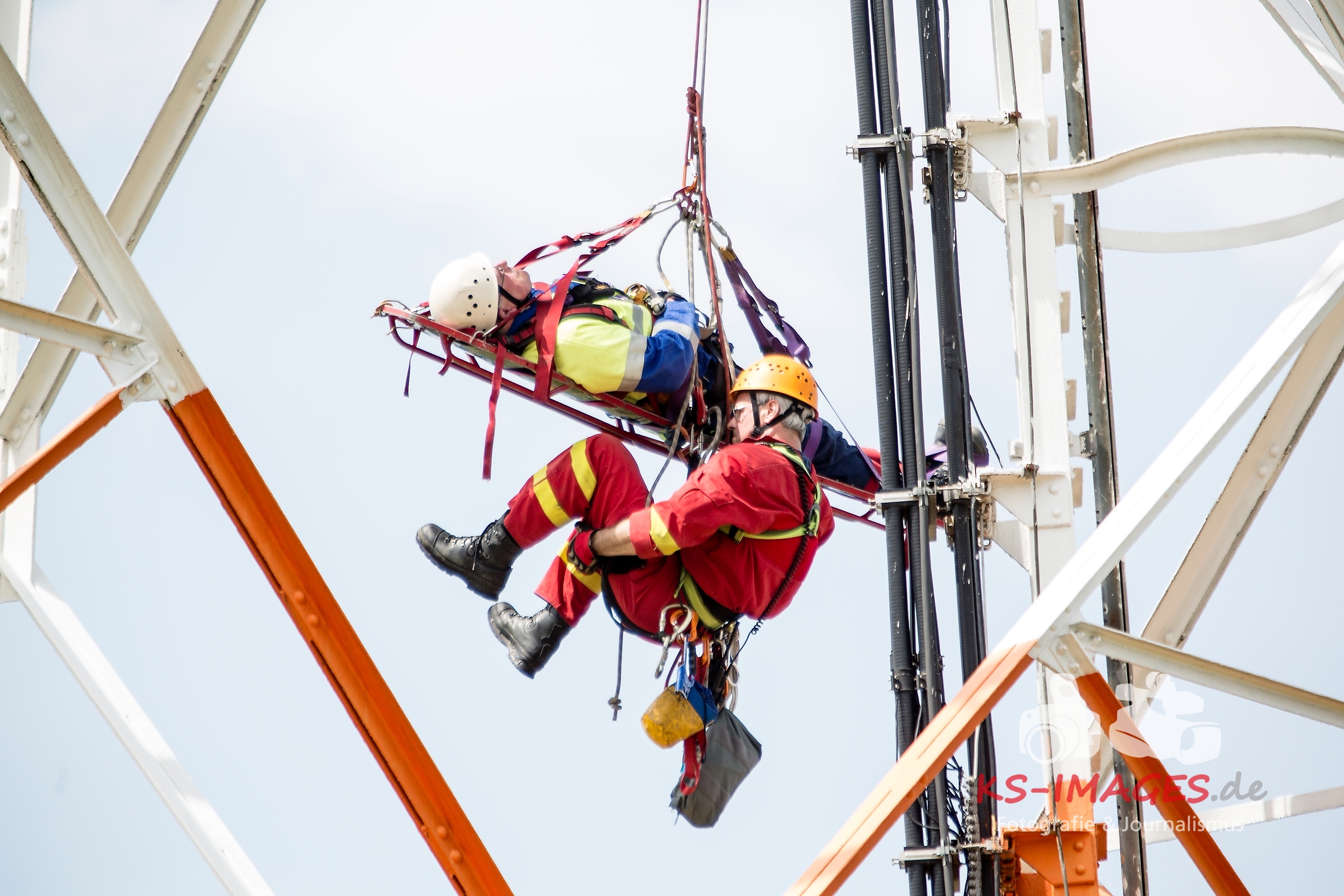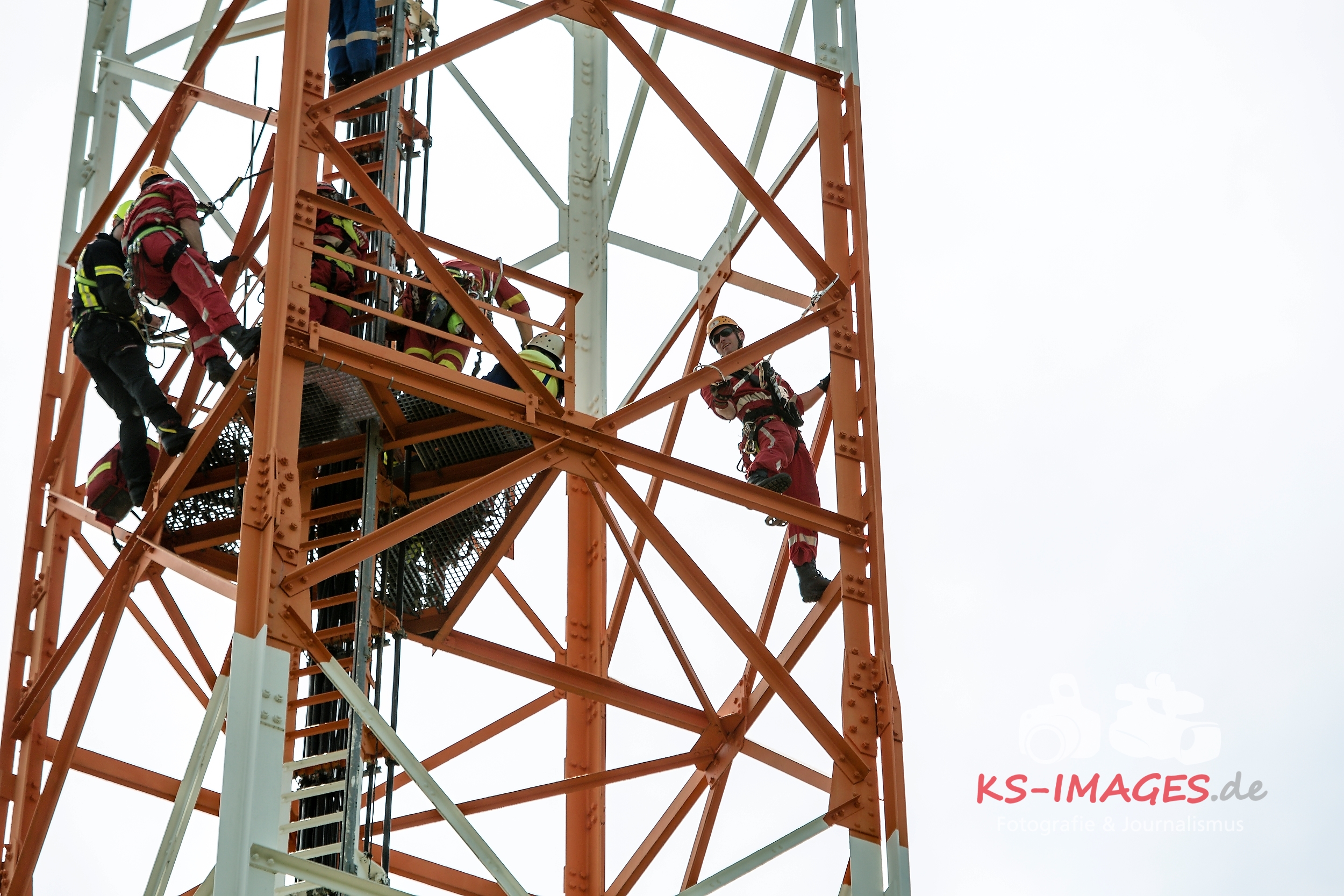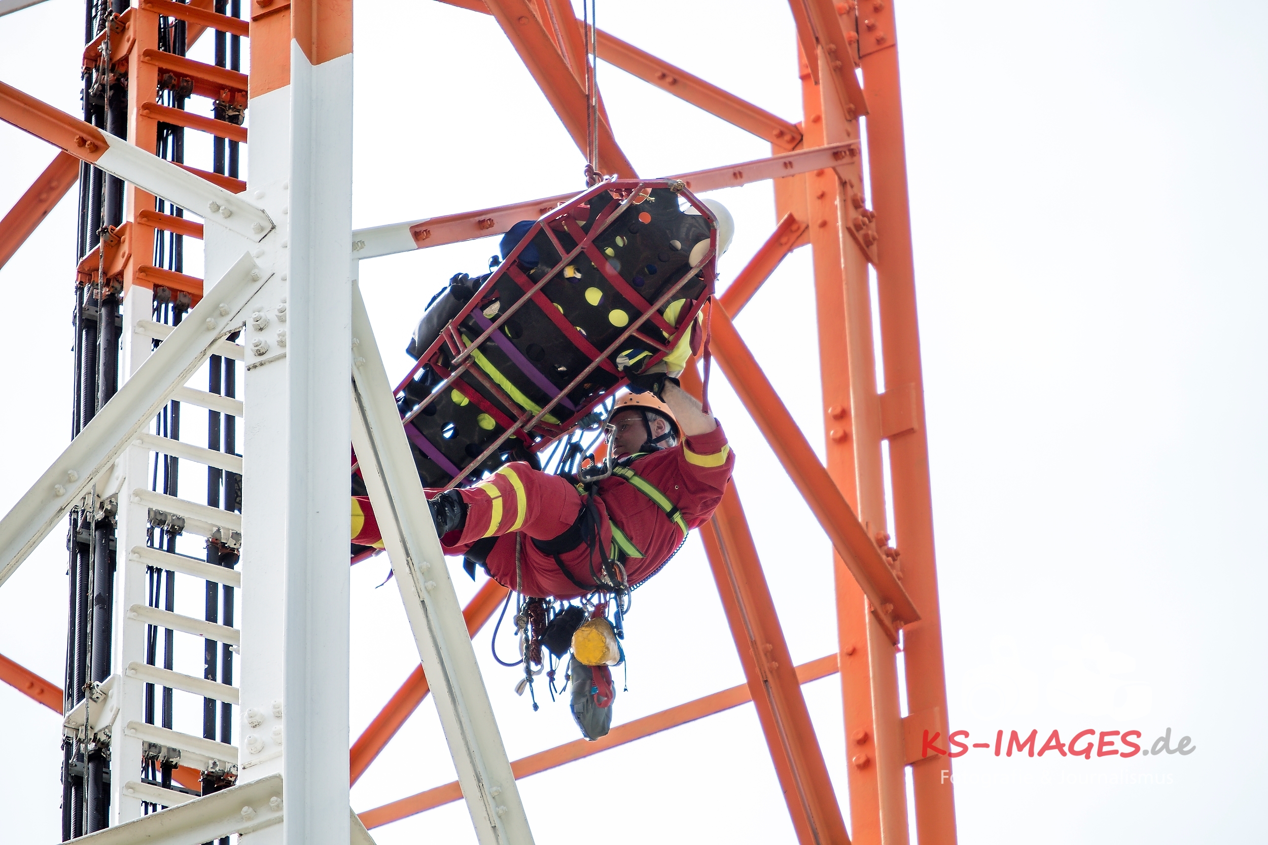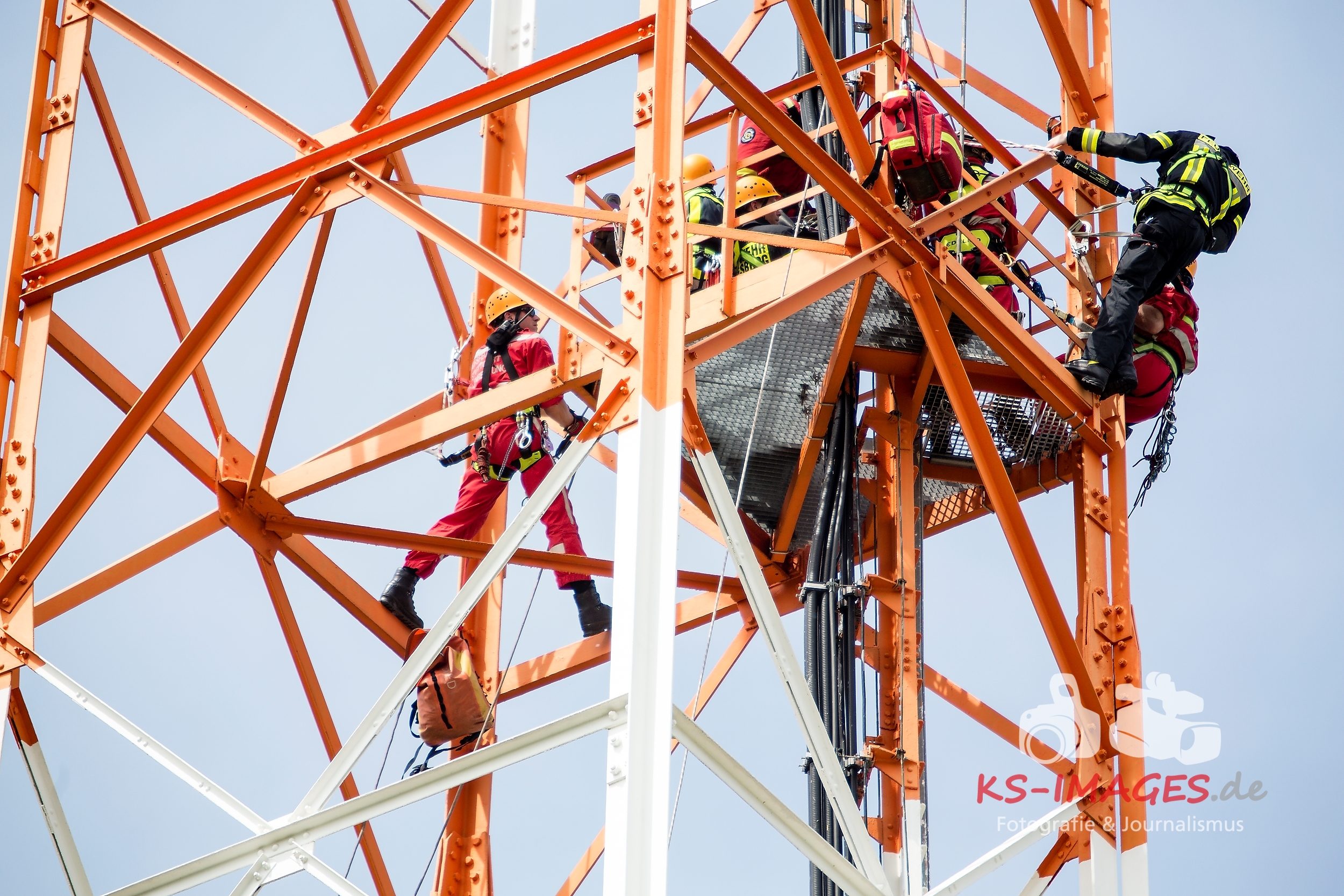 Herr Bläse von der Feuerwehr Ludwigsburg hatte sich zusammen mit der Firma Amprion ein Übung Szenarium auserarbeitet. Es sollte hier die Zusammenarbeit mit der Höhenrettungsgruppe aus Stuttgart geübt werden.