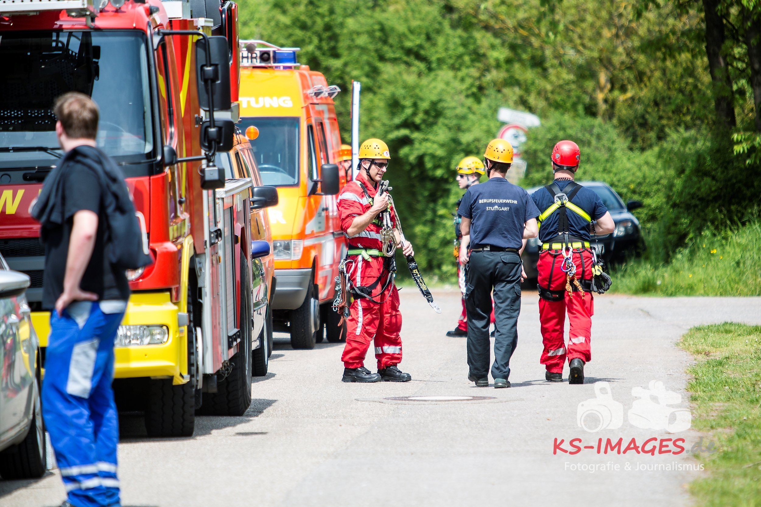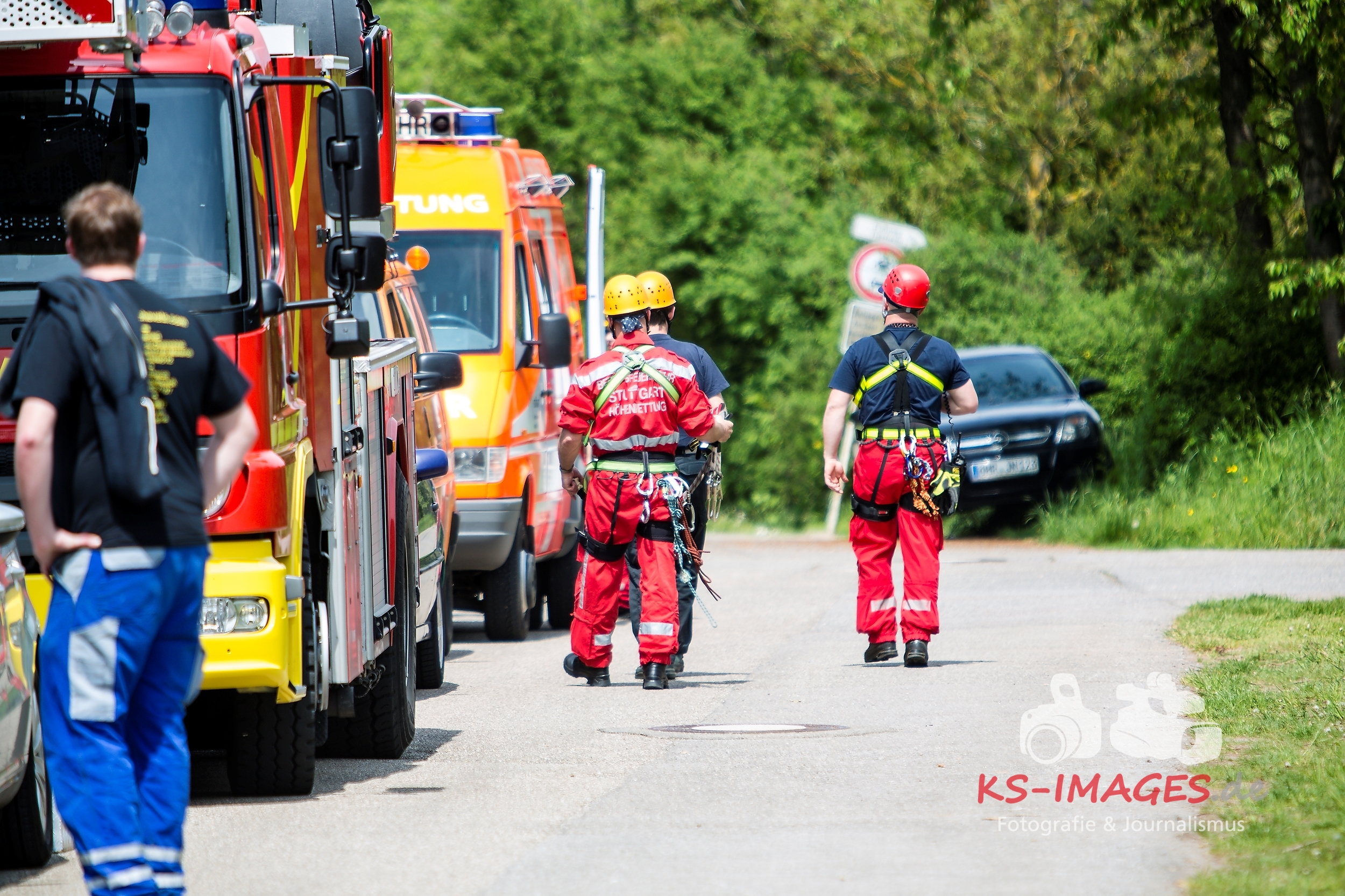 Nach erstem Erkunden der Feuerwehr Ludwigsburg wurden erste medizinische Maßnahmen durchgeführt und die verletzte Person rund 5 m auf eine Plattform herabgelassen. Die Einheit aus Stuttgart konnte die Person dann vollends mit ihren Rettungsmittel sicher auf den Boden bringen