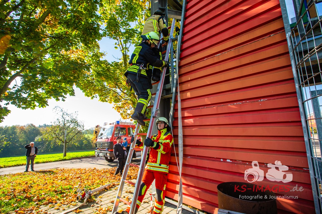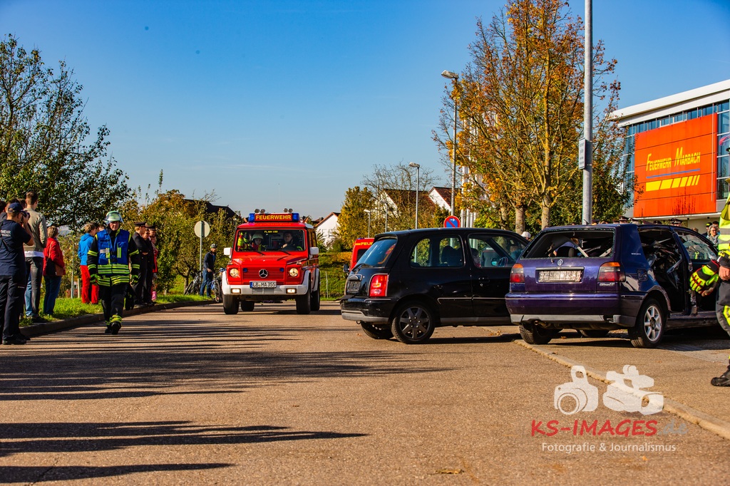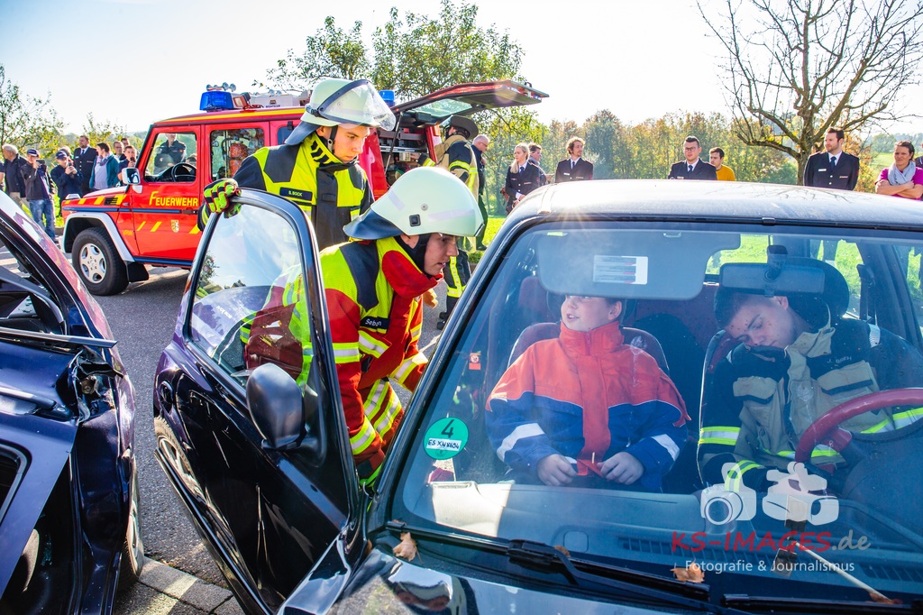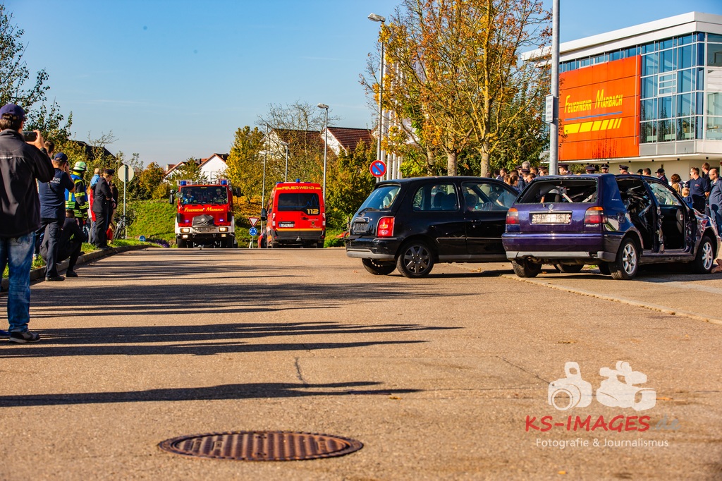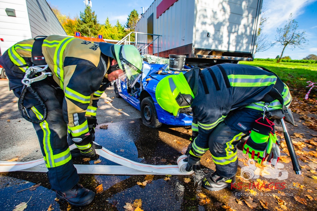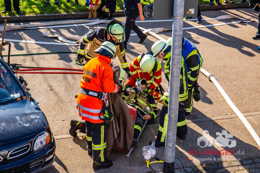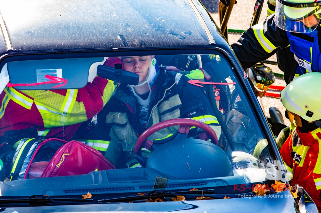 Bei der Abschlussübung gab es folgendes Szenario zu bewältigen: Eine Rauchentwicklung in einem Firmengebäude wurde von einem Passanten gemeldet. Beim Eintreffen der Feuerwehr steht die angebaute Lagerhalle in Brand. Auch das Treppenhaus im Bürotrakt ist durch eine Tür zur Lagerhalle verraucht worden, weshalb sich eine Person auf dem Balkon rettet und um Hilfe rief. Ein PKW-Fahrer wurde durch das geschehen so abgelenkt, dass er von seiner Fahrbahn abkam und in ein Auto, dass auf der Gegenfahrbahn parkte, prallte. Dabei wird er in seinem Fahrzeug eingeklemmt. Ein Passant wurde dabei überrollt und befand sich noch unter dem PKW.