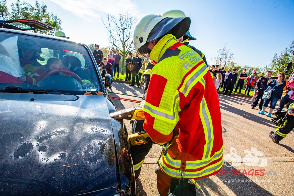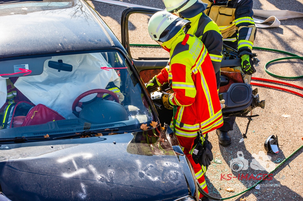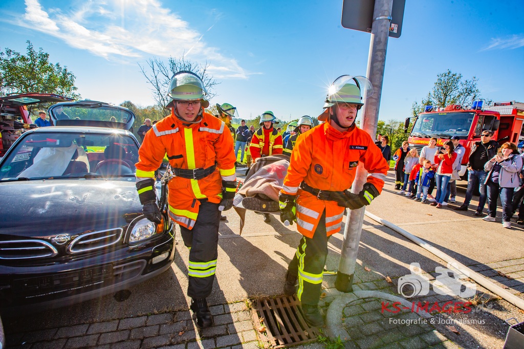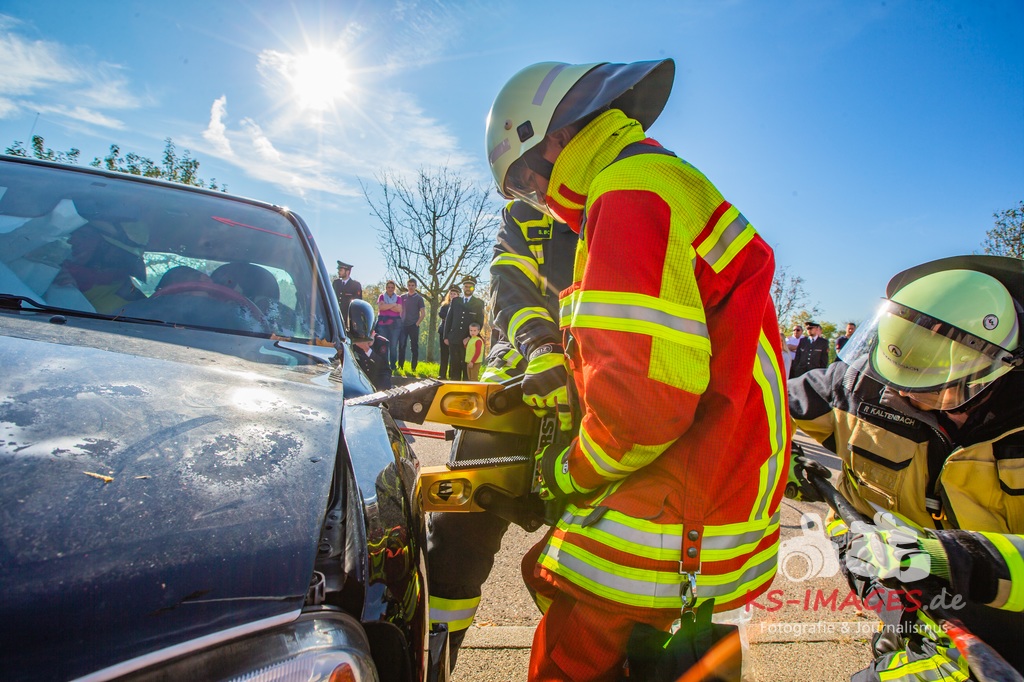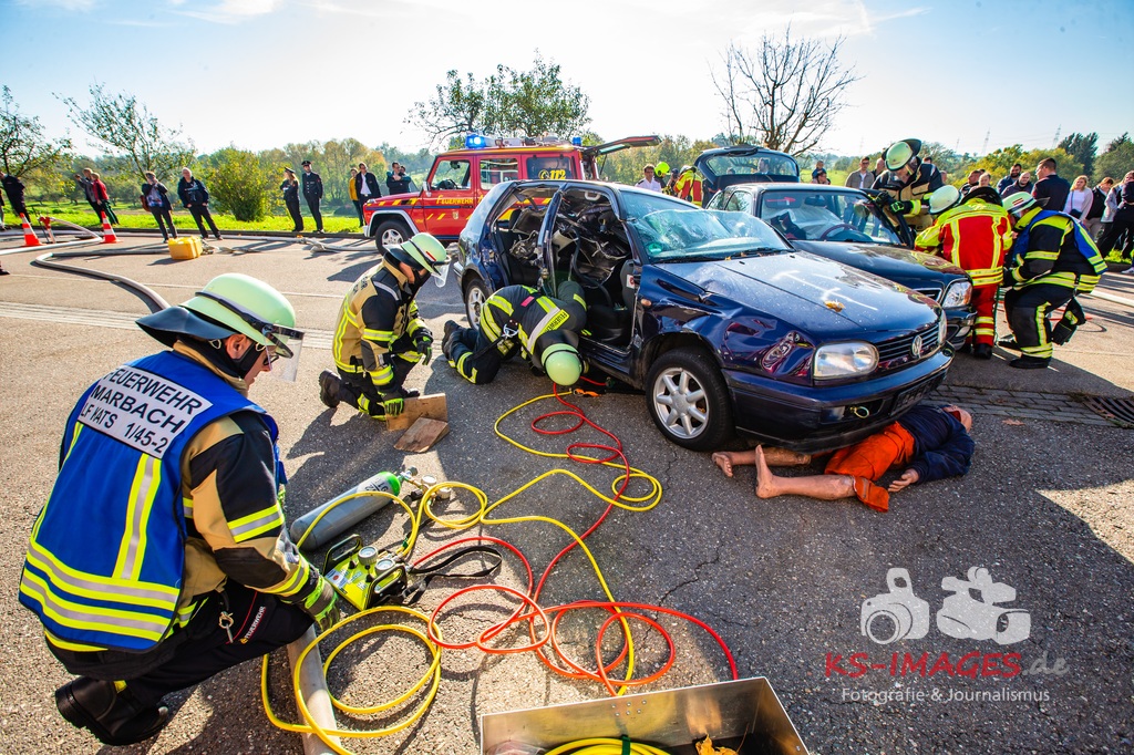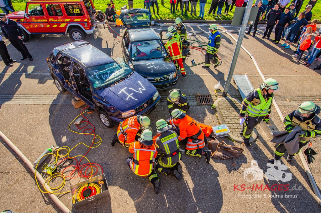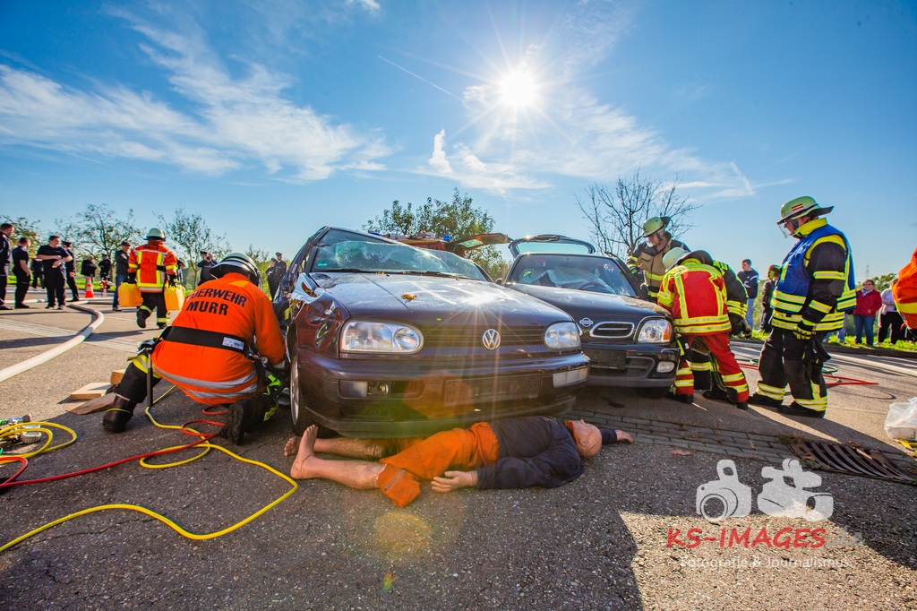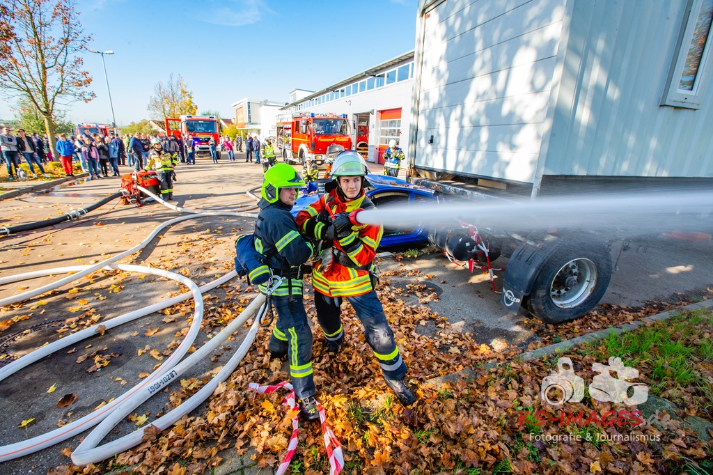 Bei der Abschlussübung gab es folgendes Szenario zu bewältigen: Eine Rauchentwicklung in einem Firmengebäude wurde von einem Passanten gemeldet. Beim Eintreffen der Feuerwehr steht die angebaute Lagerhalle in Brand. Auch das Treppenhaus im Bürotrakt ist durch eine Tür zur Lagerhalle verraucht worden, weshalb sich eine Person auf dem Balkon rettet und um Hilfe rief. Ein PKW-Fahrer wurde durch das geschehen so abgelenkt, dass er von seiner Fahrbahn abkam und in ein Auto, dass auf der Gegenfahrbahn parkte, prallte. Dabei wird er in seinem Fahrzeug eingeklemmt. Ein Passant wurde dabei überrollt und befand sich noch unter dem PKW.