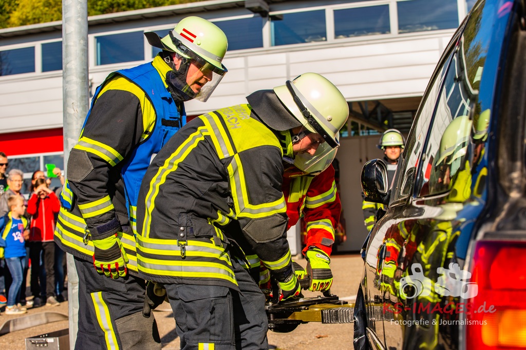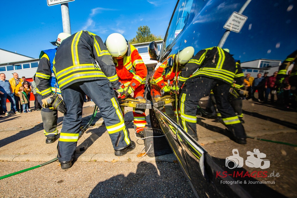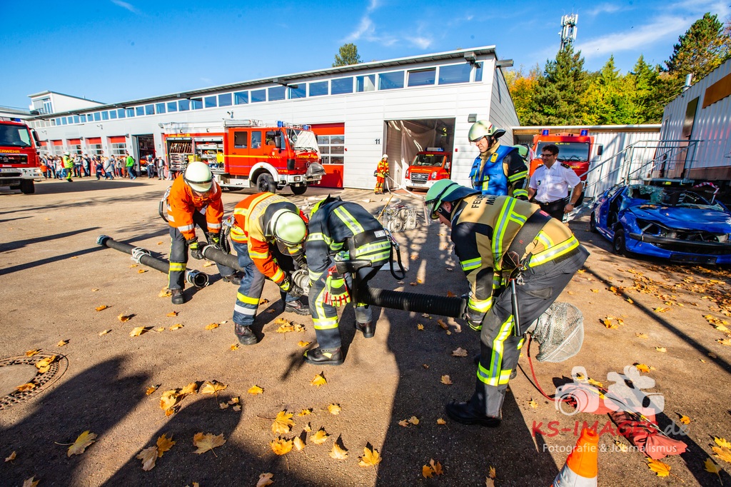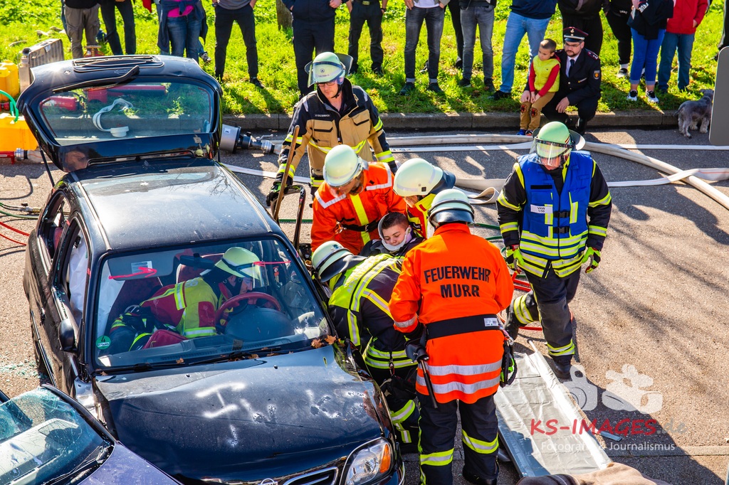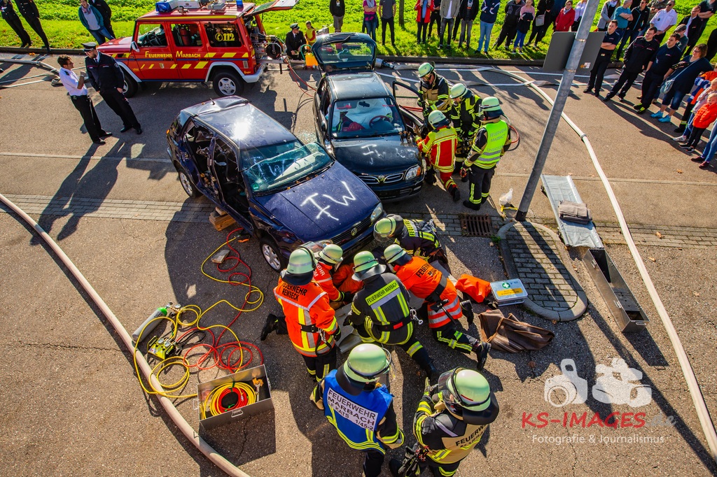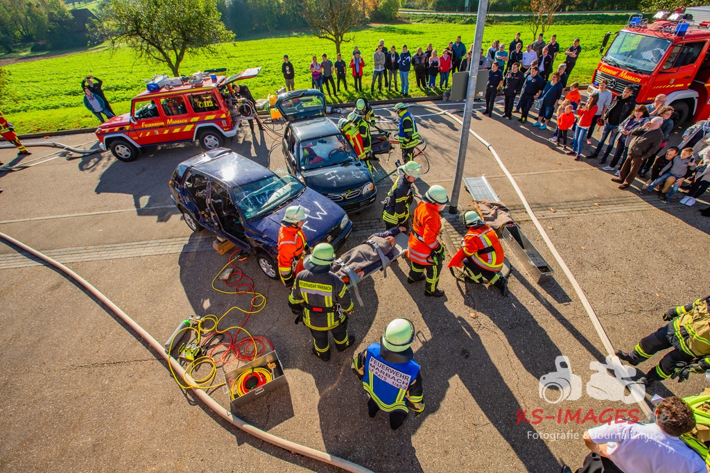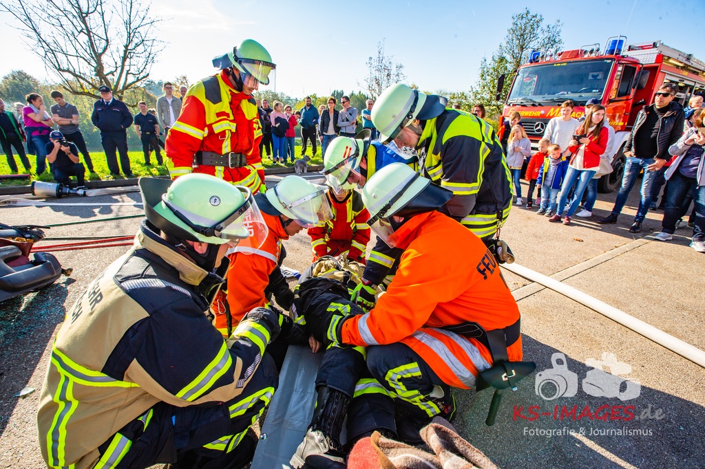 Bei der Abschlussübung gab es folgendes Szenario zu bewältigen: Eine Rauchentwicklung in einem Firmengebäude wurde von einem Passanten gemeldet. Beim Eintreffen der Feuerwehr steht die angebaute Lagerhalle in Brand. Auch das Treppenhaus im Bürotrakt ist durch eine Tür zur Lagerhalle verraucht worden, weshalb sich eine Person auf dem Balkon rettet und um Hilfe rief. Ein PKW-Fahrer wurde durch das geschehen so abgelenkt, dass er von seiner Fahrbahn abkam und in ein Auto, dass auf der Gegenfahrbahn parkte, prallte. Dabei wird er in seinem Fahrzeug eingeklemmt. Ein Passant wurde dabei überrollt und befand sich noch unter dem PKW.