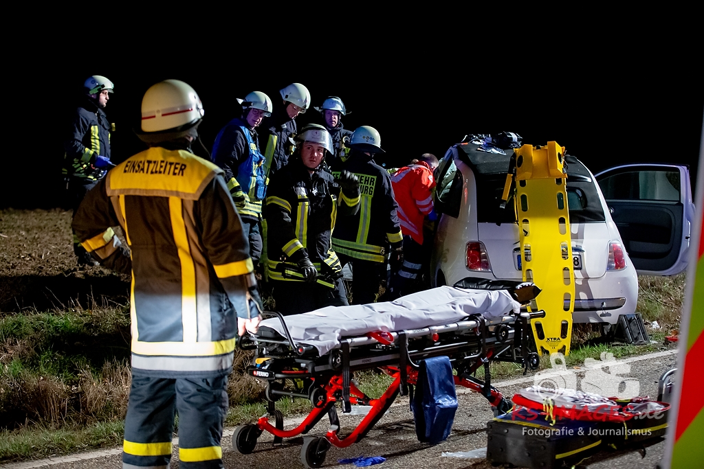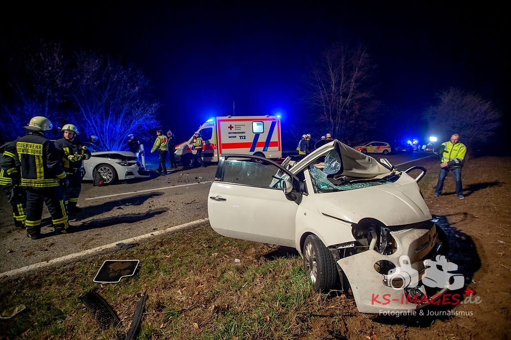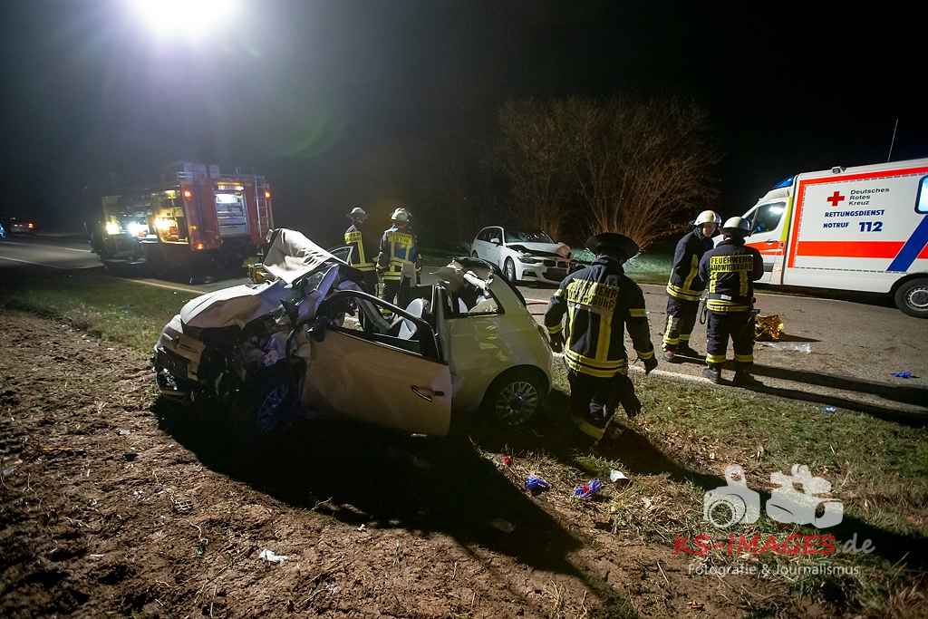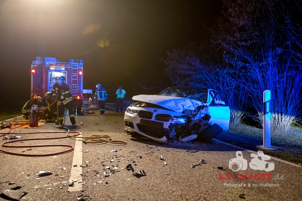 Der 49 Jahre alte Fahrer eines BMW fuhr hinter einem Mercedes, der von einem 52 Jahre alten Mann gelenkt wurde, in Richtung Benningen. Auf gerader Strecke setzte er zum Überholen an und übersah hierbei den entgegen kommenden Fiat einer 20-jährigen Frau, die mit ihrer Freundin, 19 Jahre alt, in Richtung Ludwigsburg unterwegs war. Es kam zum Frontalzusammenstoß, bei dem die beiden Insassinnen im Fiat eingeklemmt und schwer verletzt wurden. Der 49-jährige Fahrer des BMW sowie dessen 62-jähriger Beifahrer wurden leicht verletzt. Der BMW wurde durch den Aufprall abgewiesen und stieß noch gegen den Mercedes, dessen Fahrer unverletzt blieb. Die Insassinnen im Fiat mussten von der Feuerwehr aus dem Auto befreit werden und wurden durch den Rettungsdienst in nahe gelegene Krankenhäuser verbracht. Durch den Verkehrsunfall entstand Sachschaden in Höhe von etwa 46.000 Euro. Die Feuerwehren Ludwigsburg und Freiberg waren mit insgesamt 11 Fahrzeugen und 42 Wehrleuten vor Ort, der Rettungsdienst mit sechs Fahrzeugen und 13 Mitarbeitern. Zur Bergung der Fahrzeuge und Unfallaufnahme war die Strecke bis 01:40 Uhr gesperrt. Das Polizeipräsidium Ludwigsburg hatte hierzu vier Streifenwagen im Einsatz.