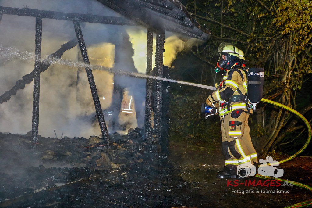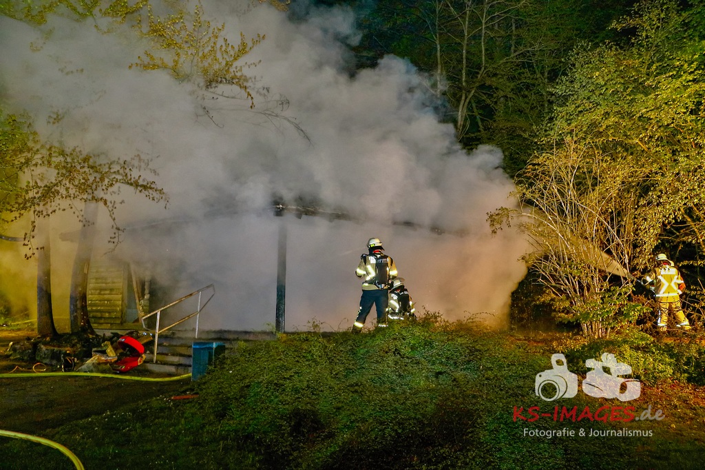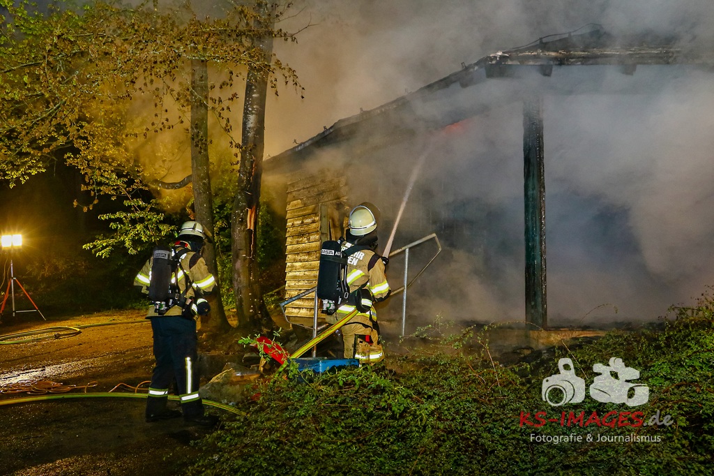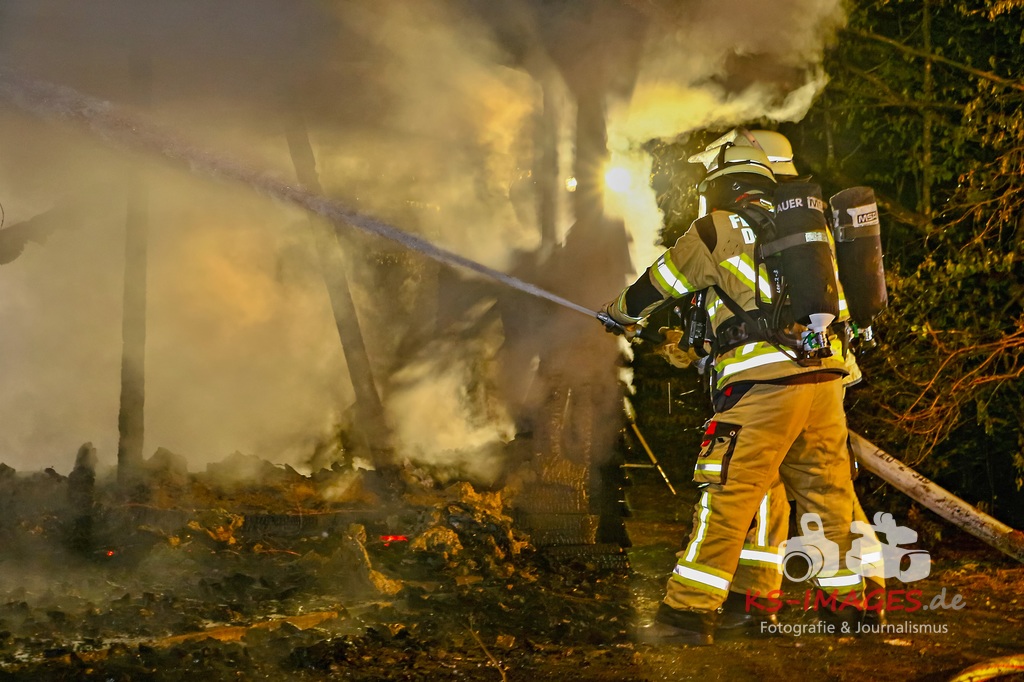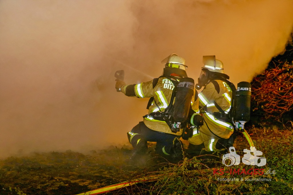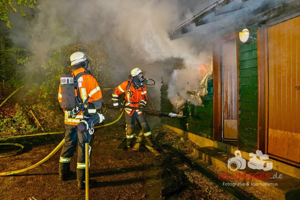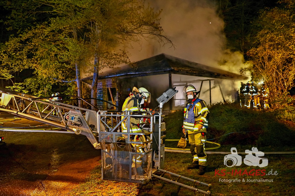 DITZINGEN: Die Freiwilligen Feuerwehren Schöckingen, Ditzingen und Hirschlanden rückte in der Nacht zum Donnerstag mit acht Fahrzeugen und 48 Wehrkräften zu einem Brand in Schöckingen aus, nachdem ein Zeuge gegen 01:00 Uhr eine starke Rauchentwicklung gemeldet hatte. Bei Eintreffen der Feuerwehr- und Polizeikräfte befand sich eine Waldhütte am südlichen Rand des Gewanns „Eulenberg“ in Vollbrand.