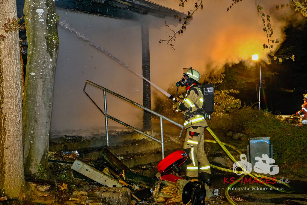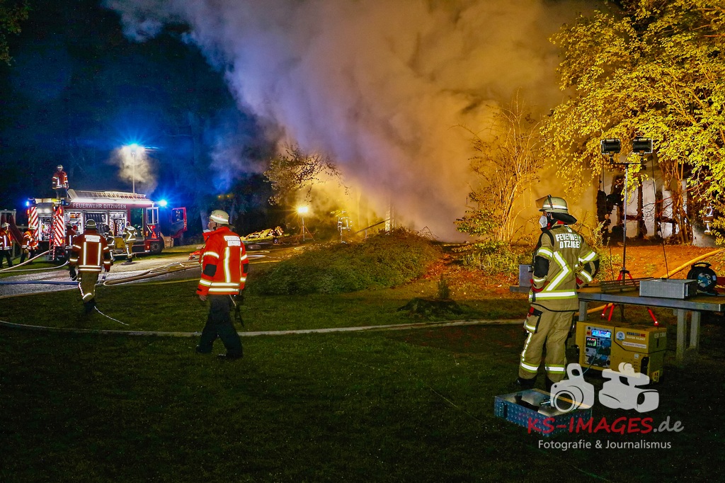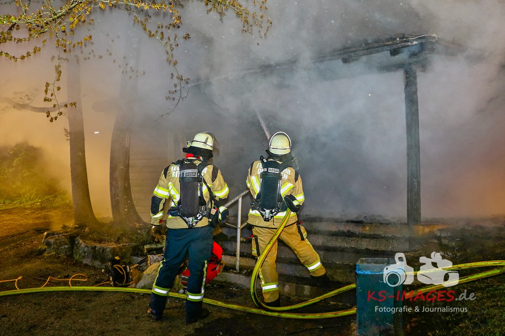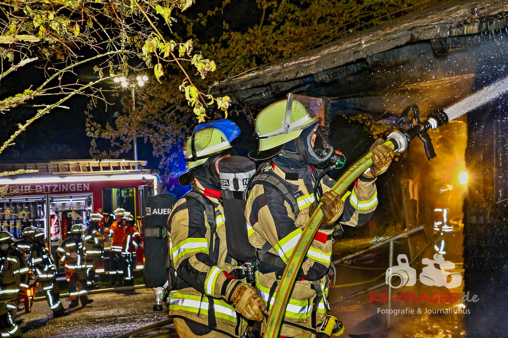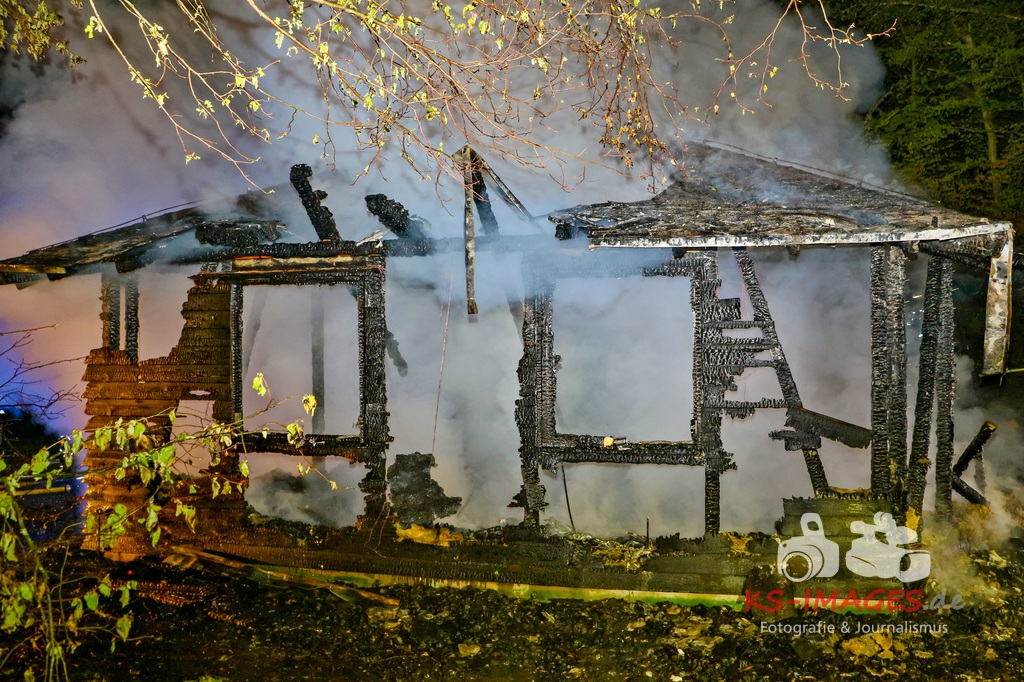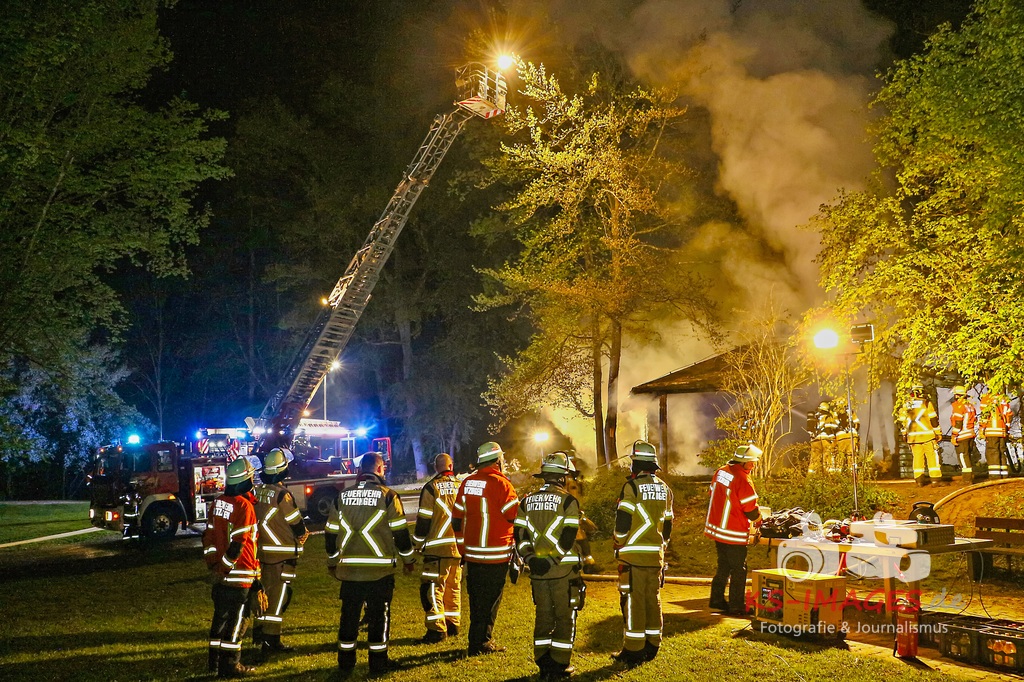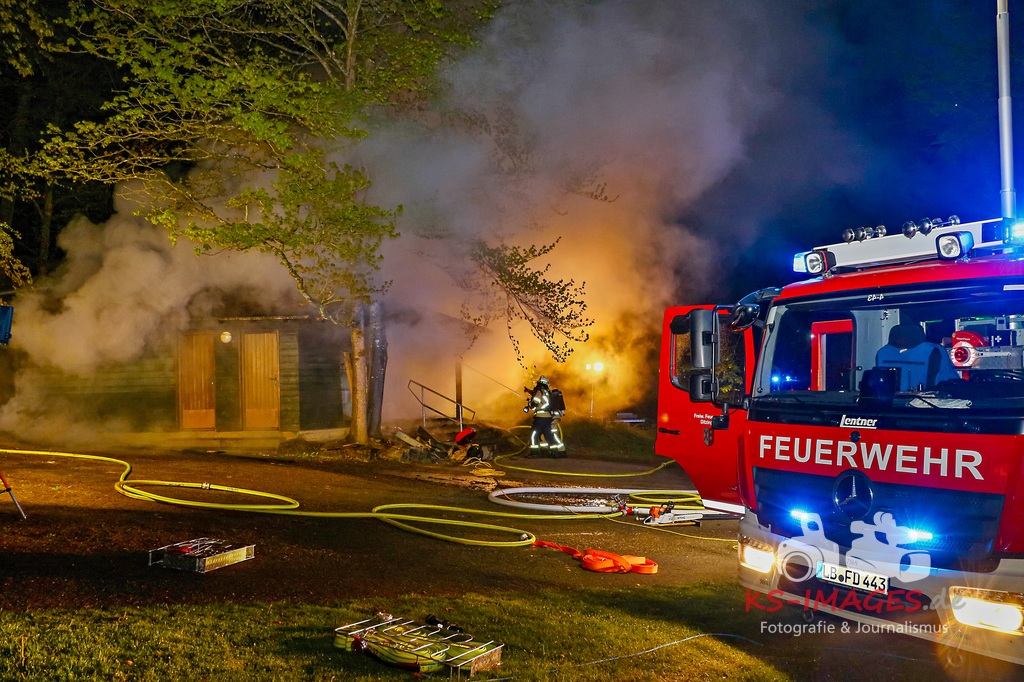Das Feuer hatte bereits auf angrenzende Laubbäume übergegriffen. Die Brandursache ist bislang unbekannt. Der Sachschaden an der Hütte, die im Eigentum der Stadt Ditzingen steht, wird auf rund 130.000 Euro geschätzt. Wie hoch der Schaden an den Bäumen ist, ist bislang nicht klar. Die Löscharbeiten der Feuerwehr dauerten bis etwa 05:00 Uhr an. Das Polizeirevier Ditzingen, Tel. 07156 4352-0, sucht Zeugen, die Hinweise geben können. Fotos: Andreas Rometsch Text: Polizeipräsidium Ludwigsburg.