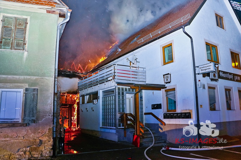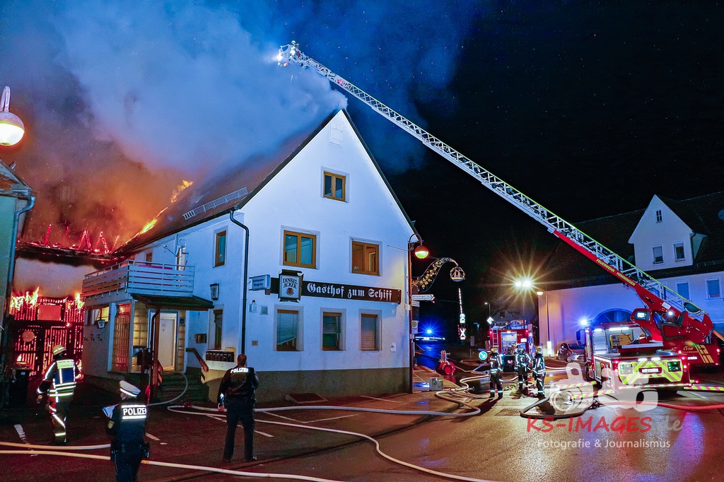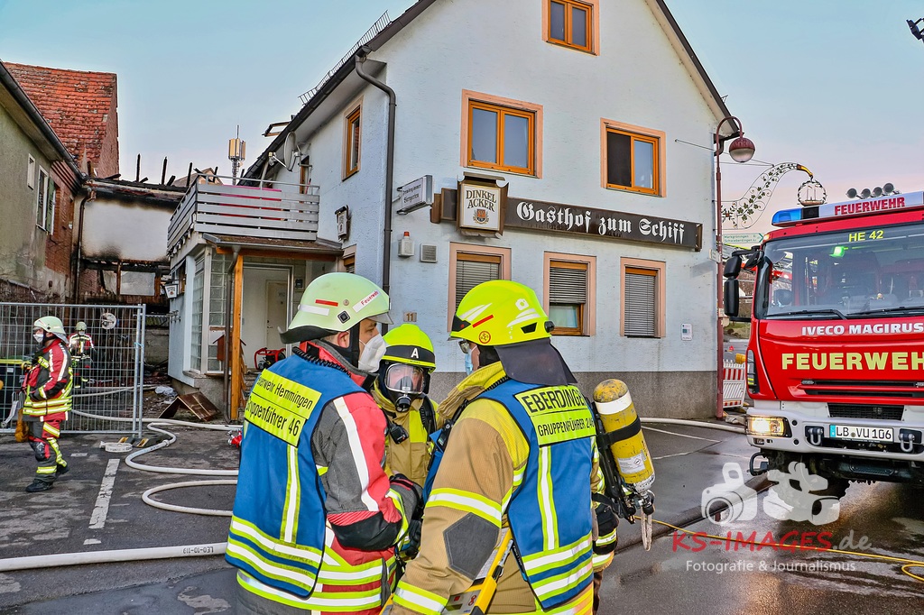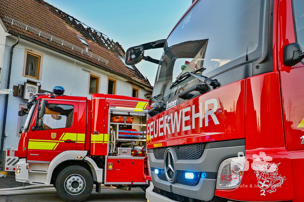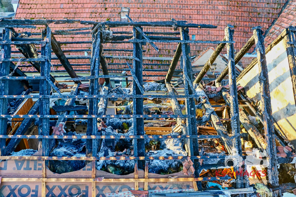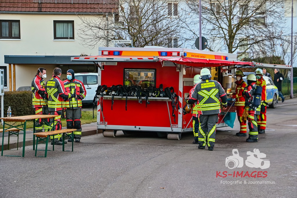 Sie blieben unverletzt. Die vier restlichen gemeldeten Personen konnten bei der Überprüfung durch die Feuerwehr nicht angetroffen werden. Das Feuer griff schnell auf ein angrenzendes Nachbarhaus über, aus welchem zwei 73- und 75-jährige Bewohner, ebenfalls unverletzt, gerettet werden konnten. Sie kommen vorübergehend bei Bekannten unter. Neben zahlreichen Rettungskräften war auch Bürgermeister Schäfer vor Ort, der sich um die Unterbringung der restlichen Personen kümmerte. Die Löscharbeiten sind aktuell noch im Gange, weshalb die Hochdorfer Straße noch gesperrt ist. Der Bauhof richtet zurzeit eine örtliche Umleitung ein. Die Polizei hat die Ermittlungen zur Brandursache übernommen. Der Sachschaden an den beiden betroffenen Objekten wird auf etwa 500.000 Euro geschätzt. Beide Gebäude sind aktuell nicht bewohnbar.