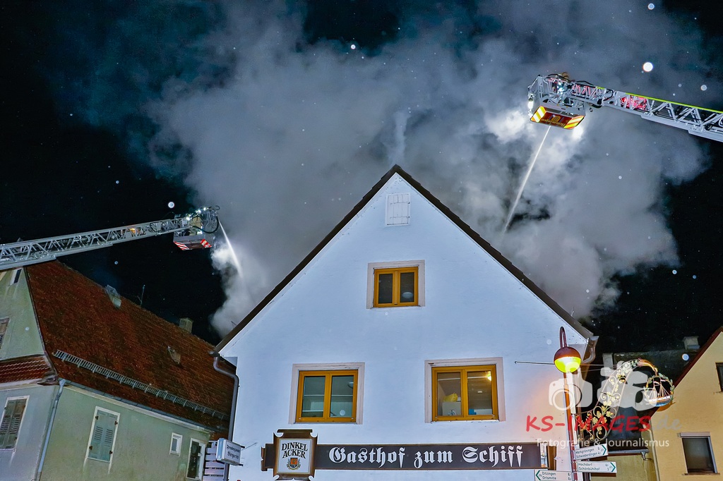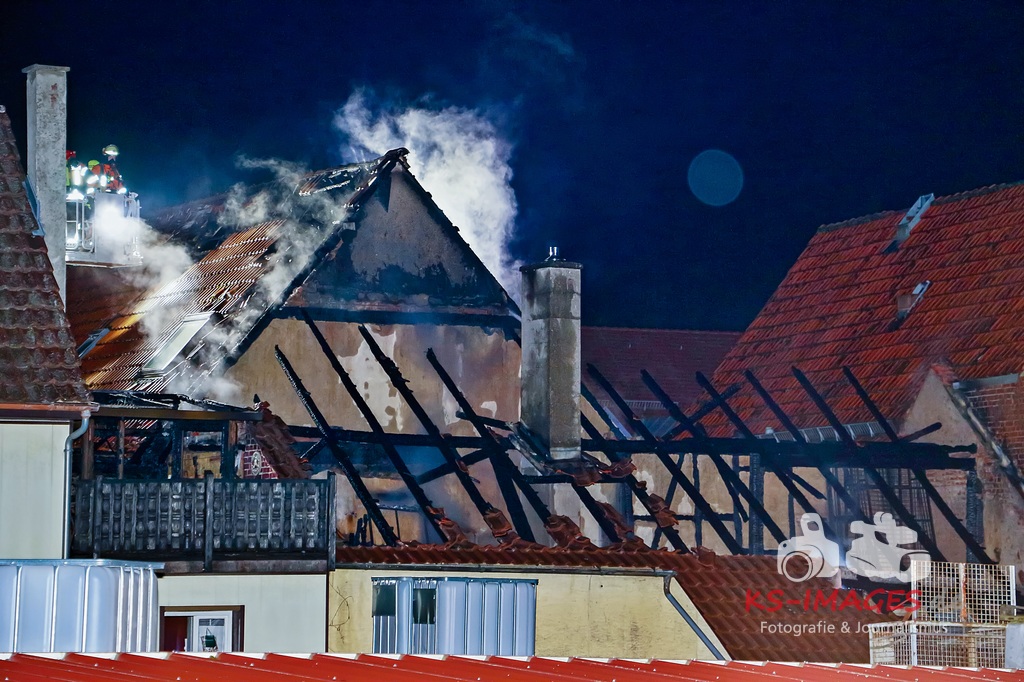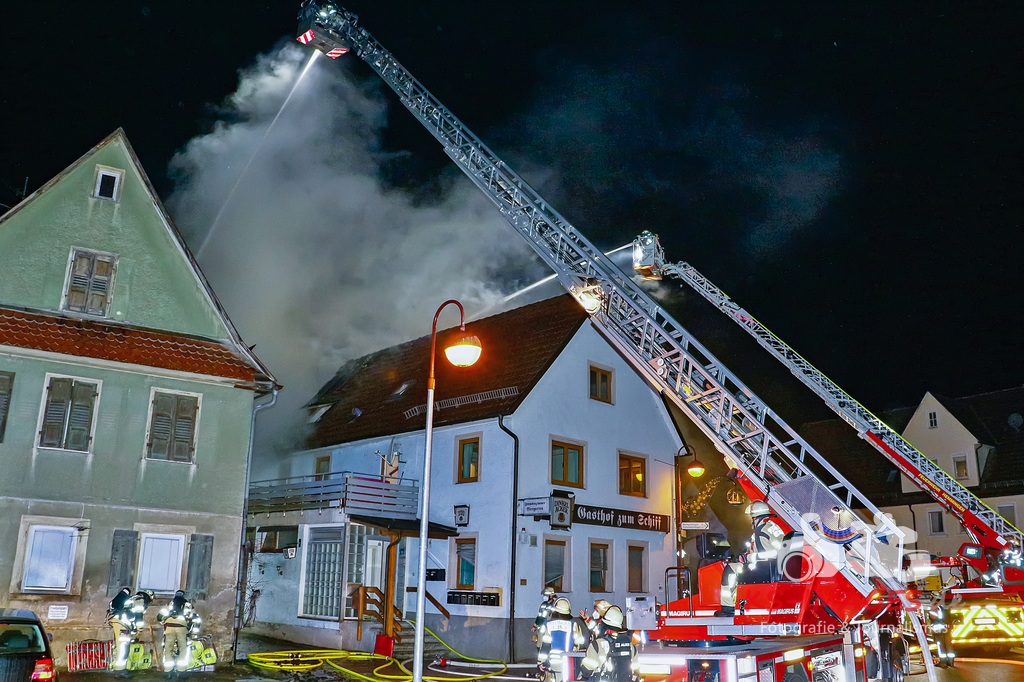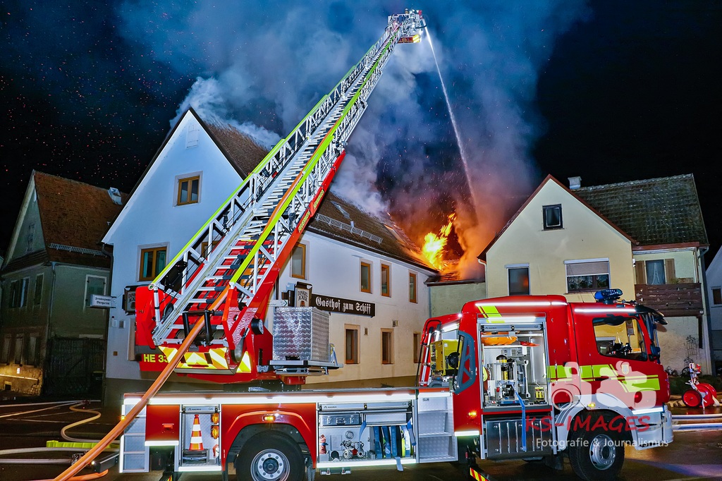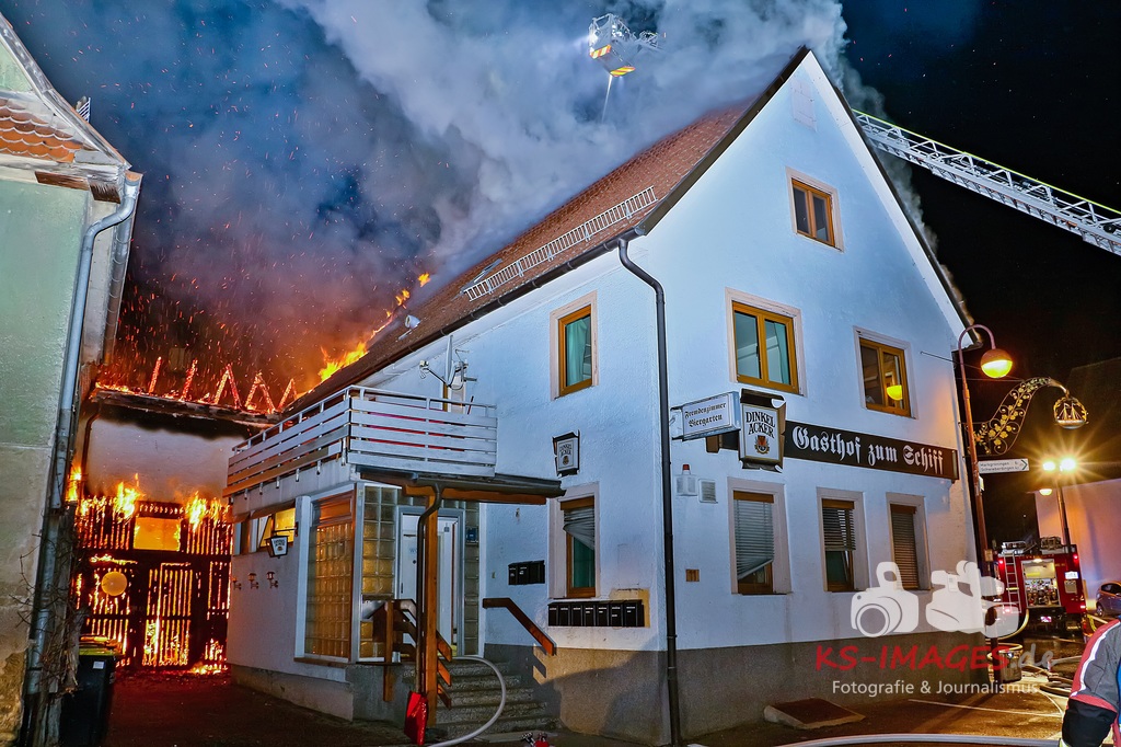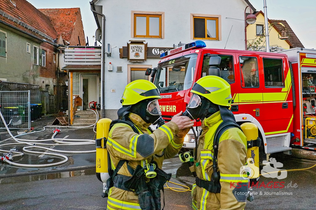 Sie blieben unverletzt. Die vier restlichen gemeldeten Personen konnten bei der Überprüfung durch die Feuerwehr nicht angetroffen werden. Das Feuer griff schnell auf ein angrenzendes Nachbarhaus über, aus welchem zwei 73- und 75-jährige Bewohner, ebenfalls unverletzt, gerettet werden konnten. Sie kommen vorübergehend bei Bekannten unter. Neben zahlreichen Rettungskräften war auch Bürgermeister Schäfer vor Ort, der sich um die Unterbringung der restlichen Personen kümmerte. Die Löscharbeiten sind aktuell noch im Gange, weshalb die Hochdorfer Straße noch gesperrt ist. Der Bauhof richtet zurzeit eine örtliche Umleitung ein. Die Polizei hat die Ermittlungen zur Brandursache übernommen. Der Sachschaden an den beiden betroffenen Objekten wird auf etwa 500.000 Euro geschätzt. Beide Gebäude sind aktuell nicht bewohnbar.