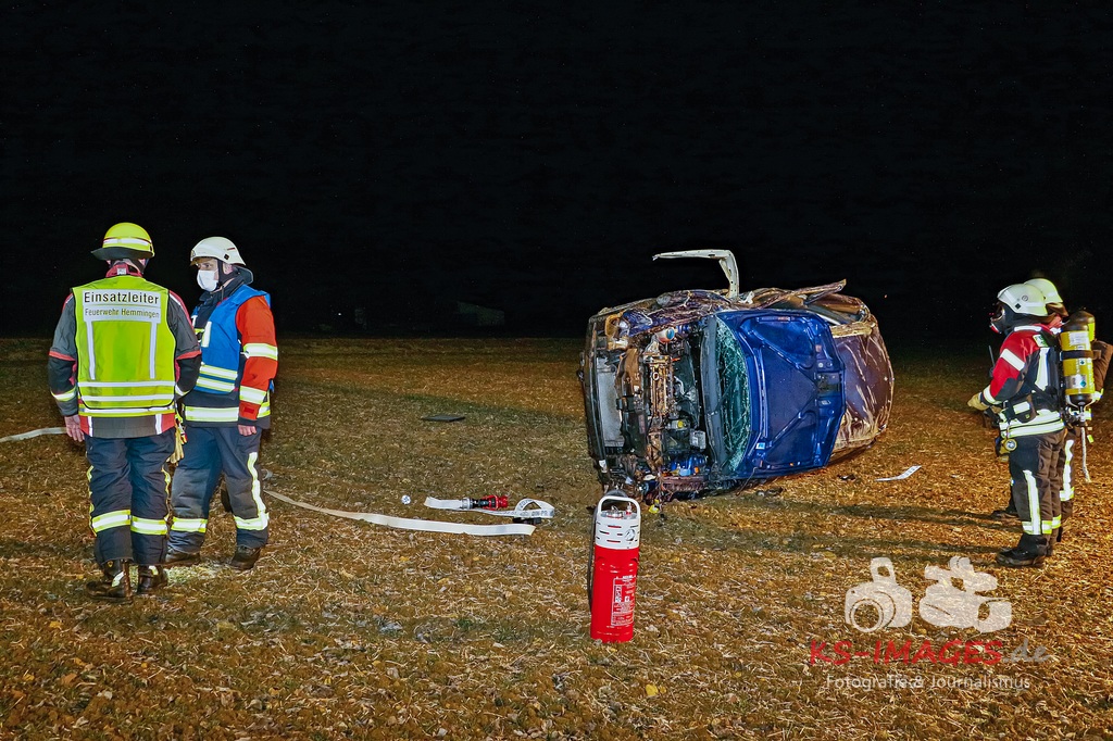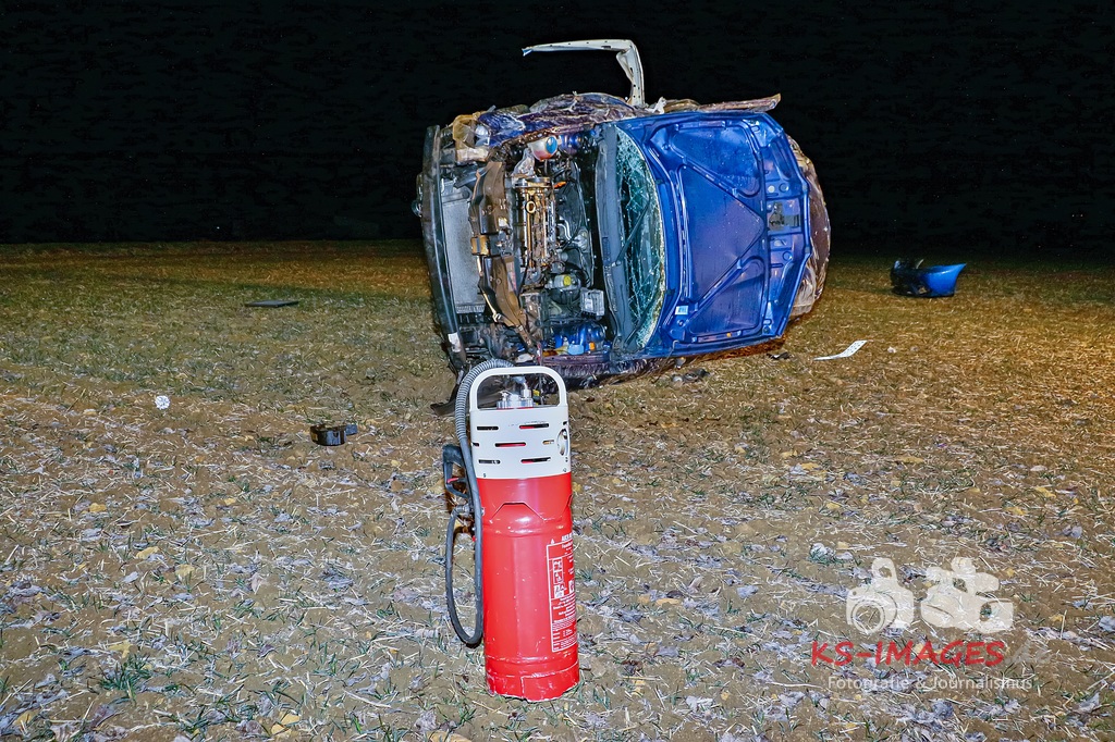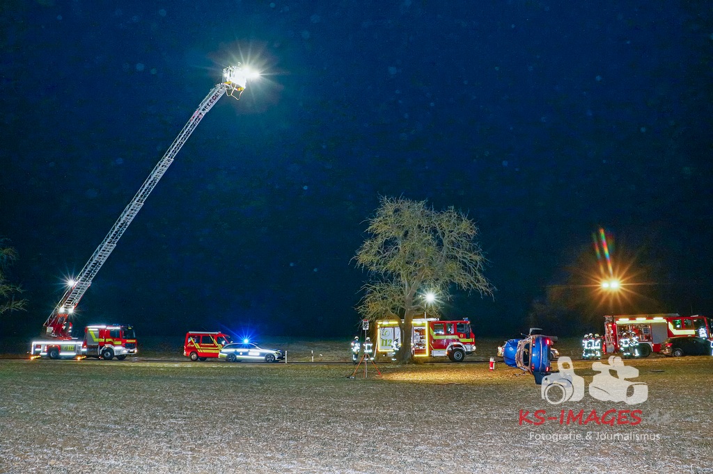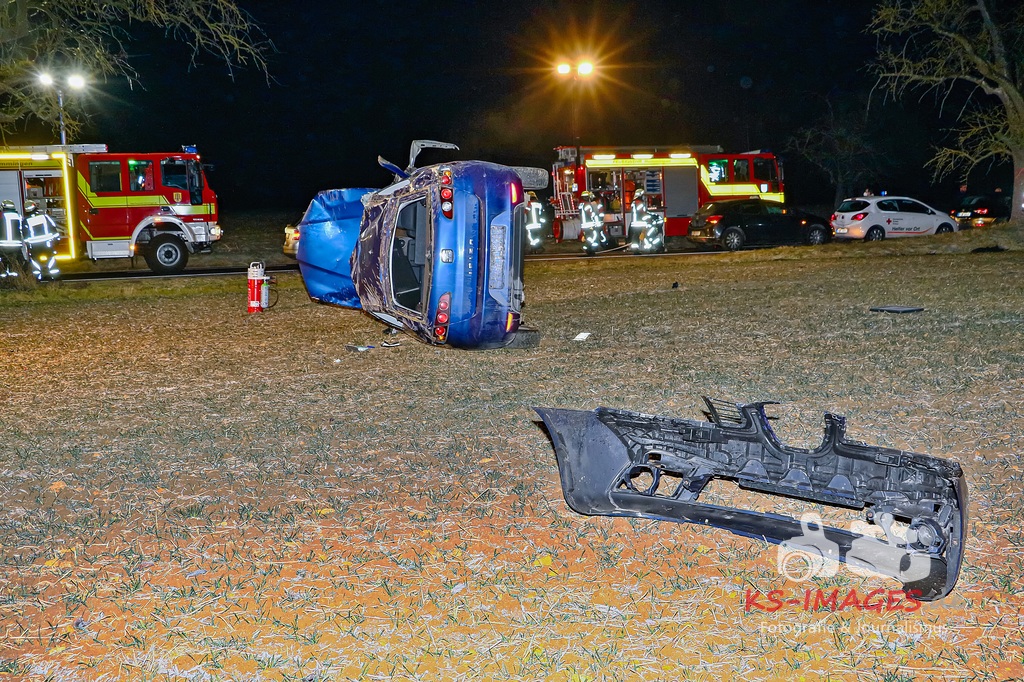 Ein unbeteiligter Verkehrsteilnehmer entdeckte gegen 19.55 Uhr Fahrzeugteile auf der Fahrbahn und alarmierte die Polizei. Die Einsatzkräfte bestehend aus Polizei, Freiwilliger Feuerwehr Hemmingen und Rettungsdienst stellten den PKW schließlich etwa 100 Meter weit im Acker liegend fest. Ein Polizeihubschrauber war zu Absuche der Unfallstelle ebenfalls eingesetzt. Der 38 Jahre alte Fahrer verstarb trotz sofort durch den Notarzt eingeleiteter Reanimationsmaßnahmen noch am Unfallort. Der entstandene Sachschaden dürfte sich auf etwa 4.000 Euro belaufen. Der nicht mehr fahrbereite Seat musste abgeschleppt werden. Die Feuerwehr befand sich mit vier Fahrzeugen und 20 Einsatzkräften vor Ort. Die Straßenmeisterei Ludwigsburg war ebenfalls im Einsatz. Die L 1140 war während der Unfallaufnahme und den Berge- und Aufräumarbeiten bis gegen 22.20 Uhr voll gesperrt. FOTOS: Andreas Rometsch Text: Staatsanwaltschaft Stuttgart und Polizeipräsidium Ludwigsburg.
