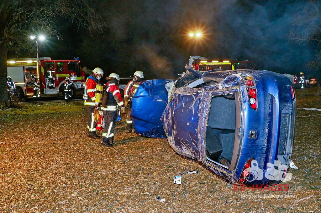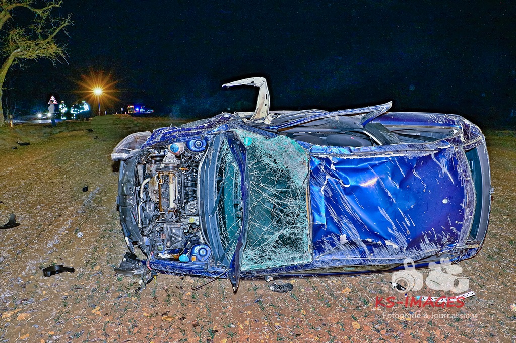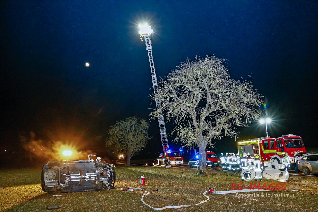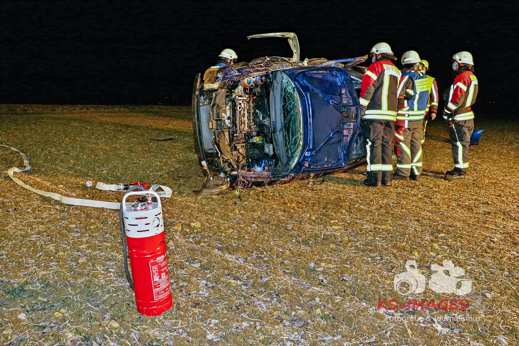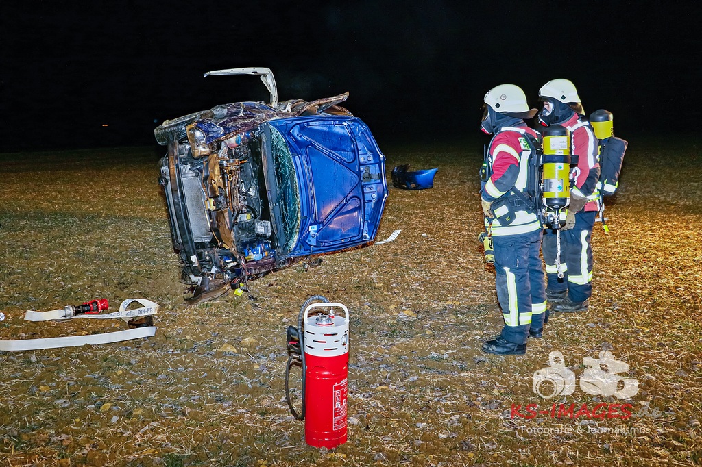 Ein unbeteiligter Verkehrsteilnehmer entdeckte gegen 19.55 Uhr Fahrzeugteile auf der Fahrbahn und alarmierte die Polizei. Die Einsatzkräfte bestehend aus Polizei, Freiwilliger Feuerwehr Hemmingen und Rettungsdienst stellten den PKW schließlich etwa 100 Meter weit im Acker liegend fest. Ein Polizeihubschrauber war zu Absuche der Unfallstelle ebenfalls eingesetzt. Der 38 Jahre alte Fahrer verstarb trotz sofort durch den Notarzt eingeleiteter Reanimationsmaßnahmen noch am Unfallort. Der entstandene Sachschaden dürfte sich auf etwa 4.000 Euro belaufen. Der nicht mehr fahrbereite Seat musste abgeschleppt werden. Die Feuerwehr befand sich mit vier Fahrzeugen und 20 Einsatzkräften vor Ort. Die Straßenmeisterei Ludwigsburg war ebenfalls im Einsatz. Die L 1140 war während der Unfallaufnahme und den Berge- und Aufräumarbeiten bis gegen 22.20 Uhr voll gesperrt. FOTOS: Andreas Rometsch Text: Staatsanwaltschaft Stuttgart und Polizeipräsidium Ludwigsburg.