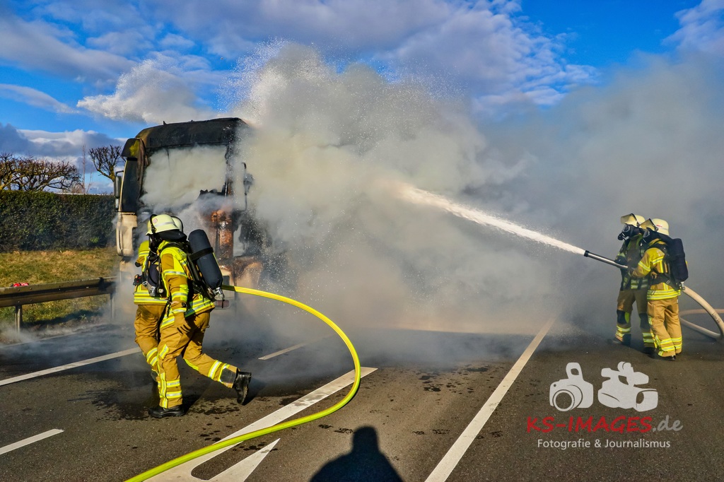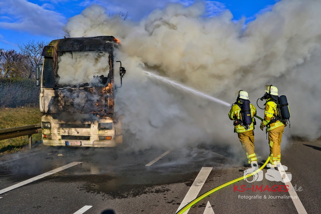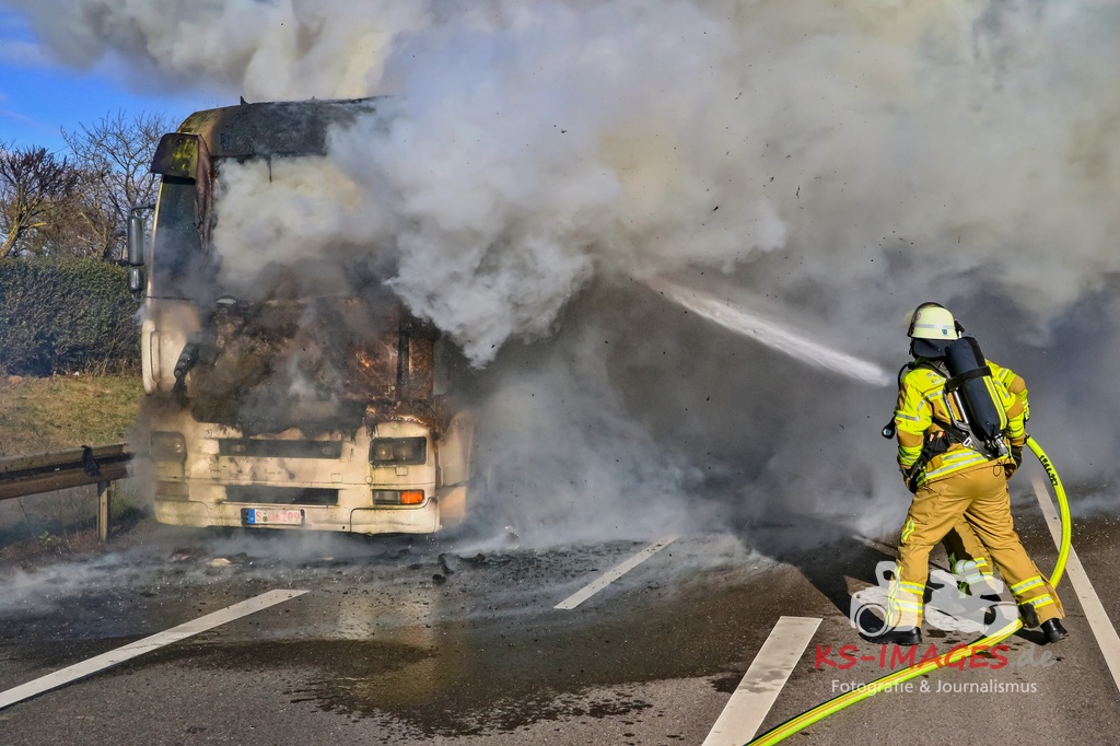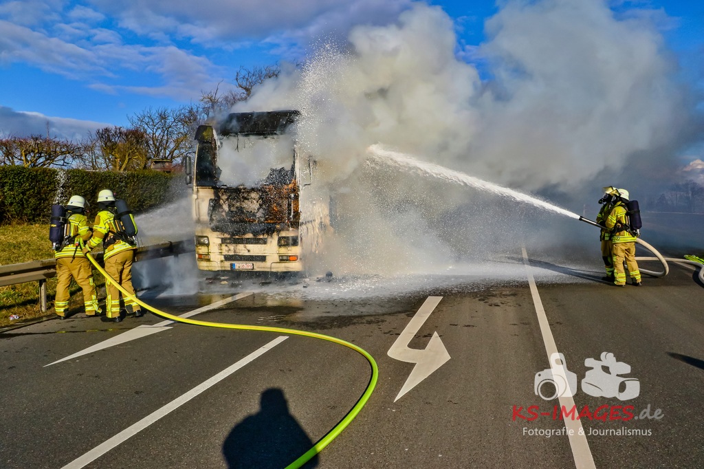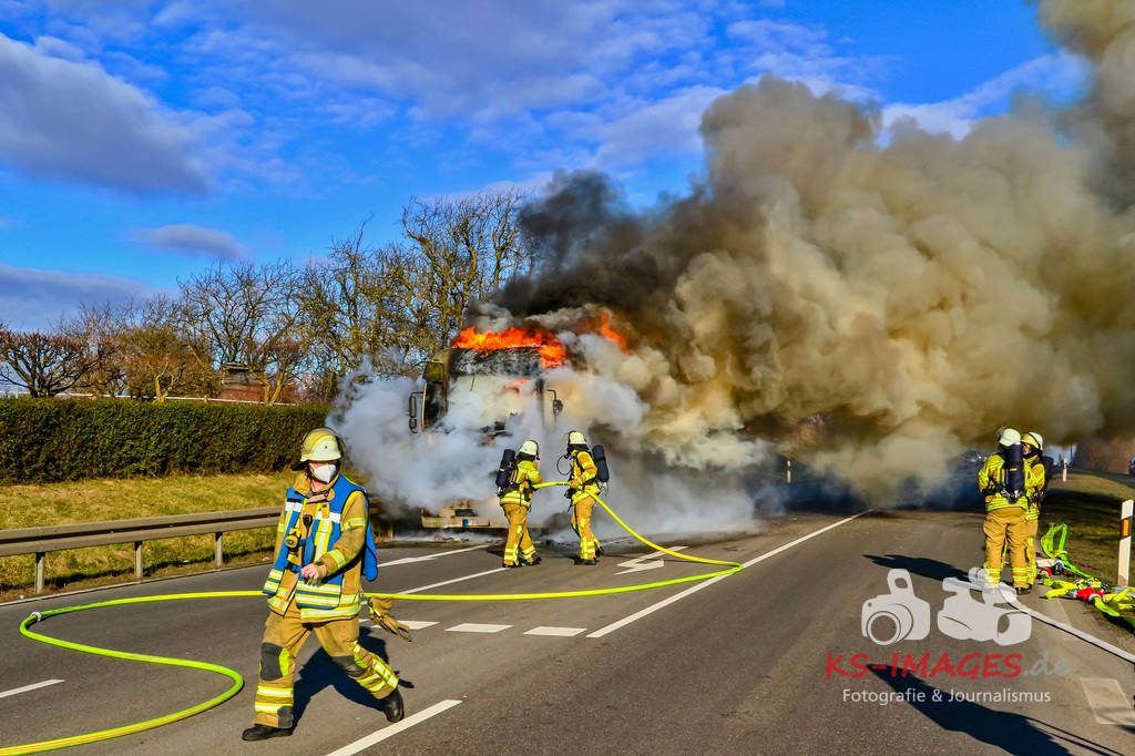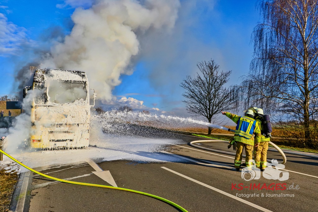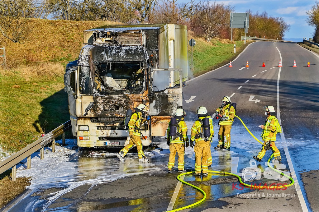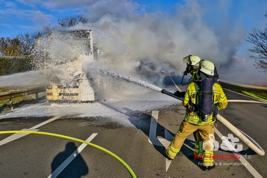 REMSECK / ALDINGEN: Am Samstagnachmittag gegen 14:30 Uhr kam es auf der Landesstraße 1140 zwischen Möglingen und Schwieberdingen zu einem Lkw-Brand. Der 57-jährige Lkw-Lenker fuhr von Ludwigsburg in Richtung Schwieberdingen als plötzlich der Motor des Lkws ausfiel. Als der Fahrer sein Fahrzeug stoppte und ausstieg, konnte er bereits Flammen aus dem Motorraum feststellen.