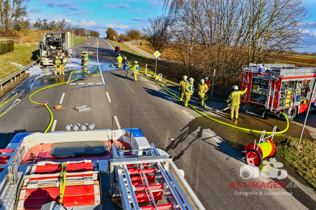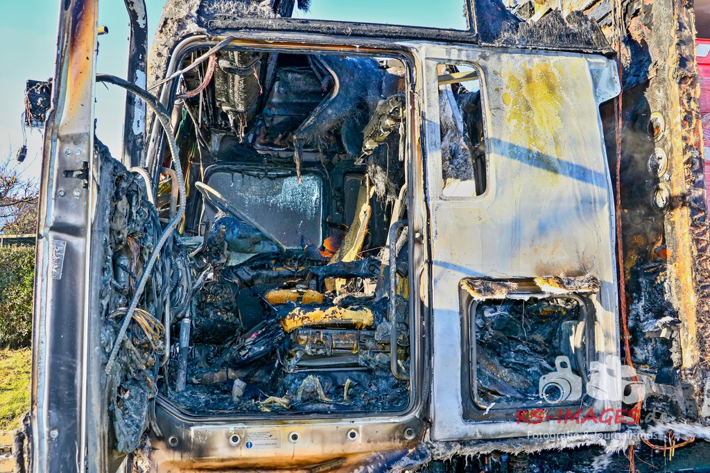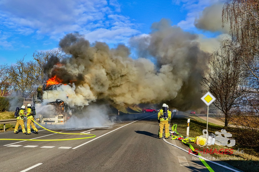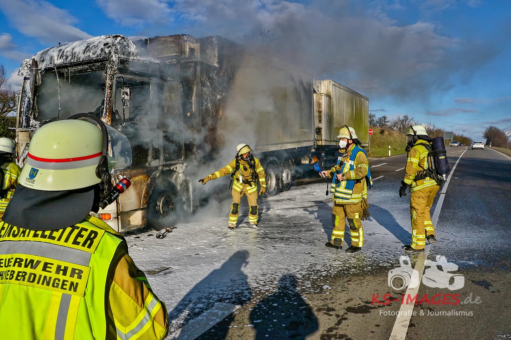 Die Feuerwehr Schwieberdingen konnte den Brand nach kurzer Zeit löschen. Der 57-jährige Fahrer blieb unverletzt. Das Führerhaus des Lkws brannte komplett aus. An den geladenen Plastiktransportboxen und dem Anhänger entstand kein Sachschaden. Der Kofferaufbau wurde durch die Flammen äußerlich beschädigt. Der hierdurch entstandene Gesamtschaden beläuft sich auf circa 75.000 Euro. Ein Teilstück der Landesstraße 1140 zwischen Möglingen und Schwieberdingen war für die Lösch- und Bergungsarbeiten am Fahrzeug für etwa zwei Stunden gesperrt. Aktuell ist die Fahrbahn in Richtung Ludwigsburg wieder befahrbar. Die Fahrtrichtung Schwieberdingen wird von der Straßenmeisterei Ludwigsburg für Reinigungsarbeiten auf der Fahrbahn weiterhin gesperrt. Fotos: Andreas Rometsch Text: Polizeipräsidium Ludwigsburg.