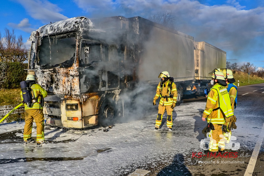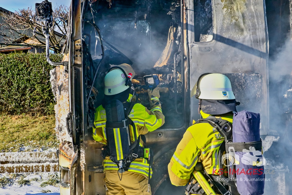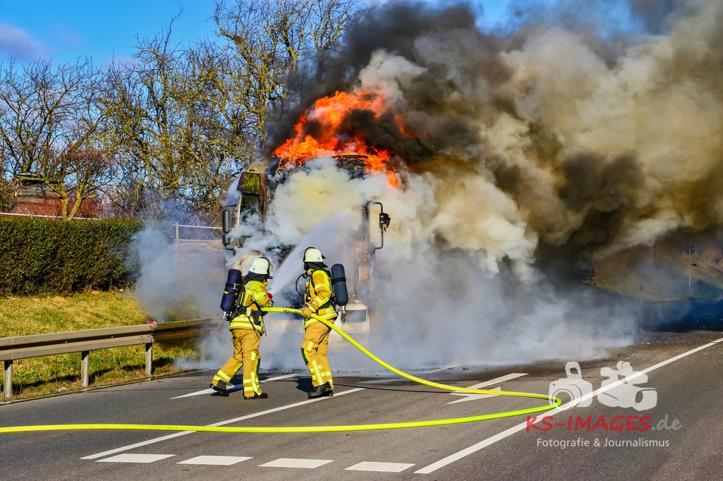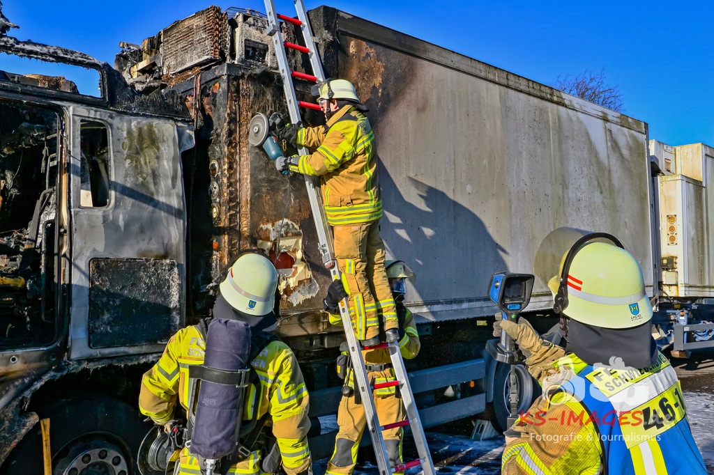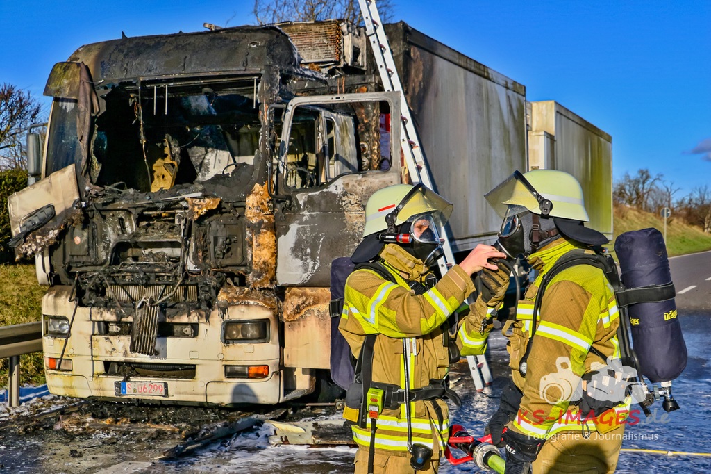 Die Feuerwehr Schwieberdingen konnte den Brand nach kurzer Zeit löschen. Der 57-jährige Fahrer blieb unverletzt. Das Führerhaus des Lkws brannte komplett aus. An den geladenen Plastiktransportboxen und dem Anhänger entstand kein Sachschaden. Der Kofferaufbau wurde durch die Flammen äußerlich beschädigt. Der hierdurch entstandene Gesamtschaden beläuft sich auf circa 75.000 Euro. Ein Teilstück der Landesstraße 1140 zwischen Möglingen und Schwieberdingen war für die Lösch- und Bergungsarbeiten am Fahrzeug für etwa zwei Stunden gesperrt. Aktuell ist die Fahrbahn in Richtung Ludwigsburg wieder befahrbar. Die Fahrtrichtung Schwieberdingen wird von der Straßenmeisterei Ludwigsburg für Reinigungsarbeiten auf der Fahrbahn weiterhin gesperrt. Fotos: Andreas Rometsch Text: Polizeipräsidium Ludwigsburg.