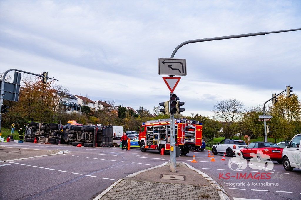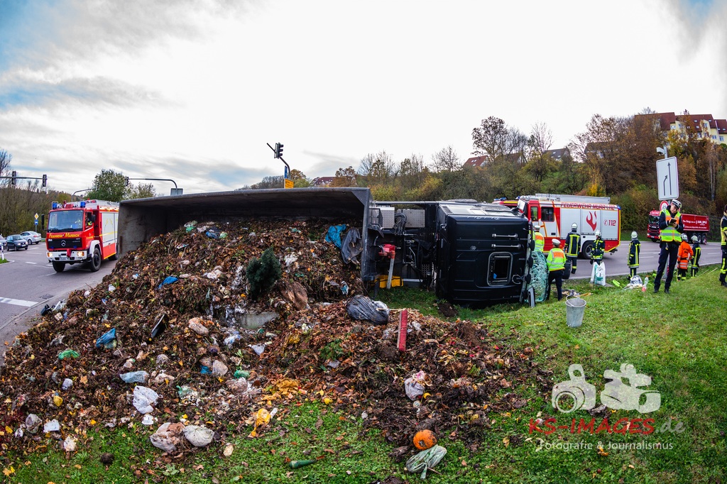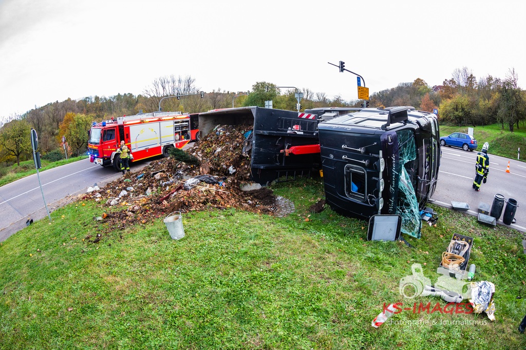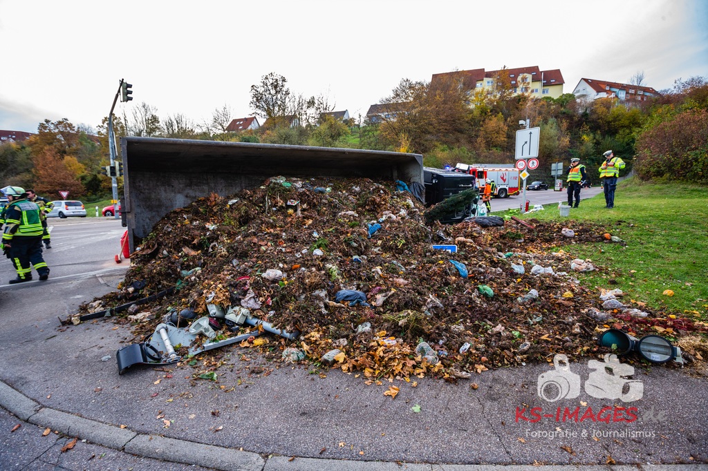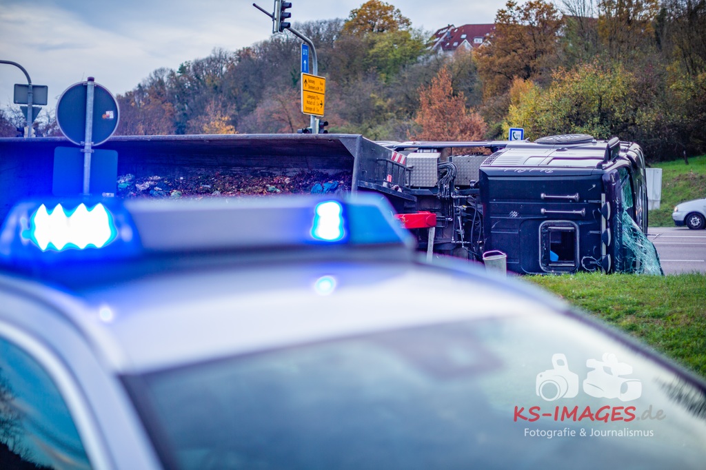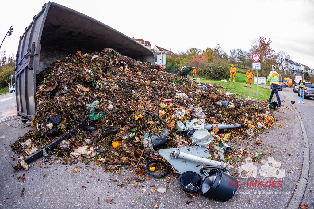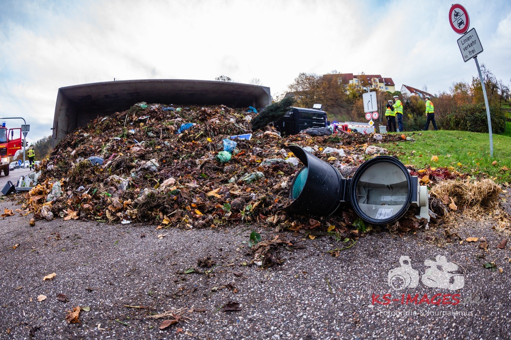 MURR: Beim Einfahren von der L 1100 in die L 1125 in Richtung Murr ist am Donnerstag gegen 15:00 Uhr ein mit Biomüll beladener Lkw samt Anhänger mit einem Gesamtgewicht von über 40 Tonnen umgekippt. Dabei wurde auch die dortige Ampelanlage stark beschädigt. Der 35-jährige Fahrer des Lkw zog sich mutmaßlich leichtere Verletzungen zu und wurde vom Rettungsdienst ins Krankenhaus gebracht. Die Fahrerin eines nachfolgenden Pkw verletzte sich leicht an Glasscherben.