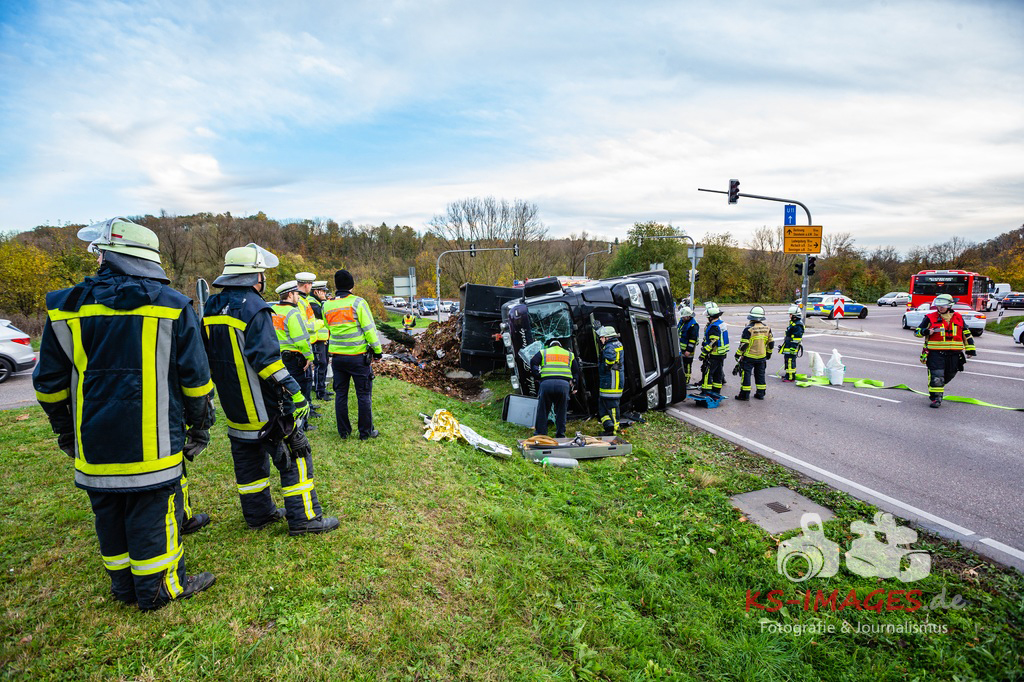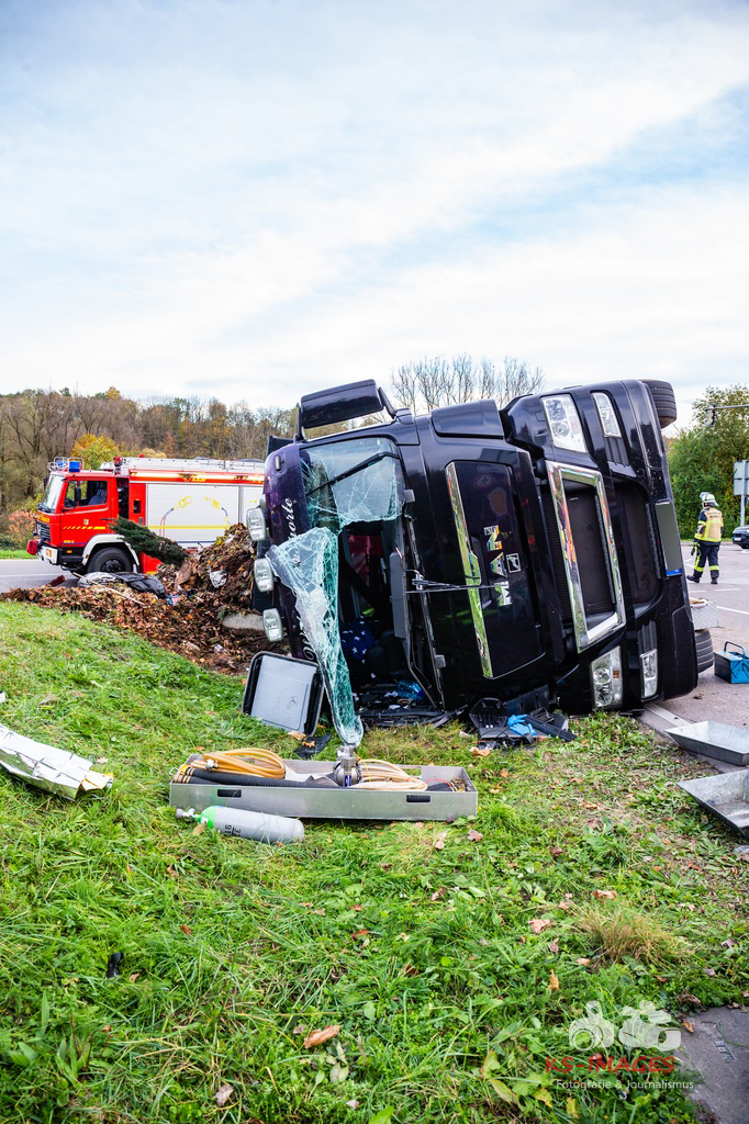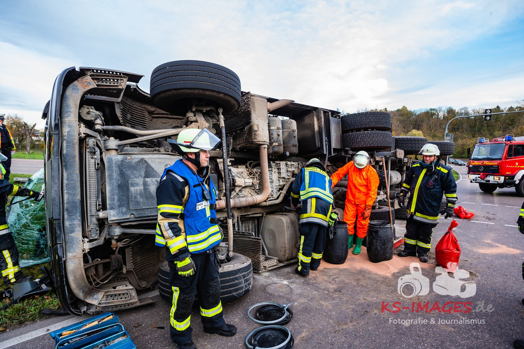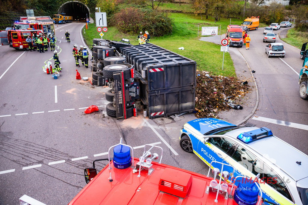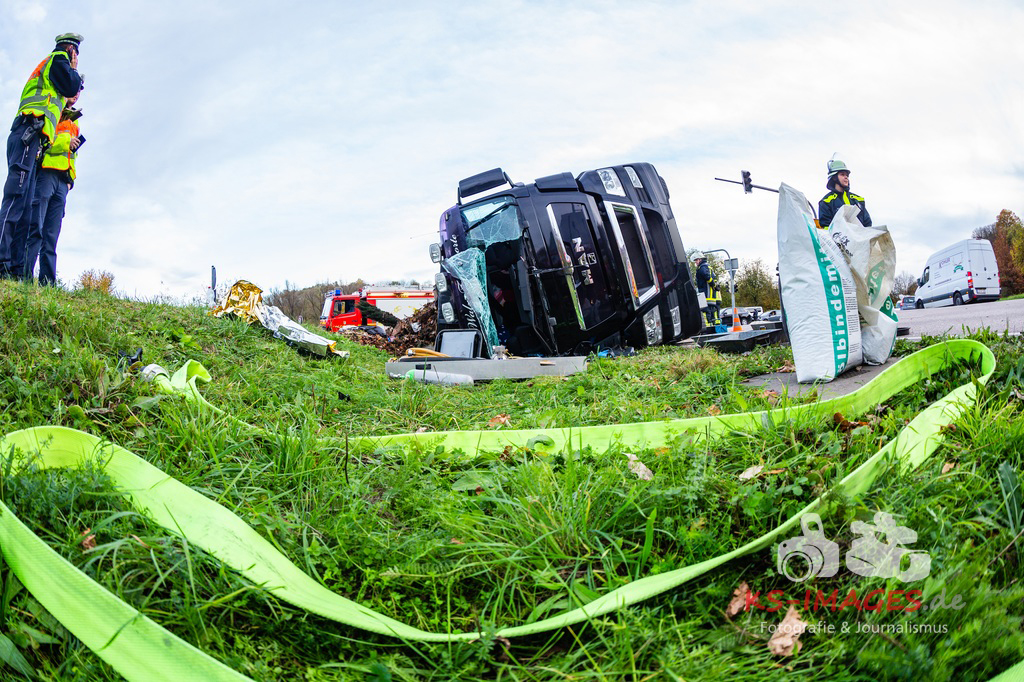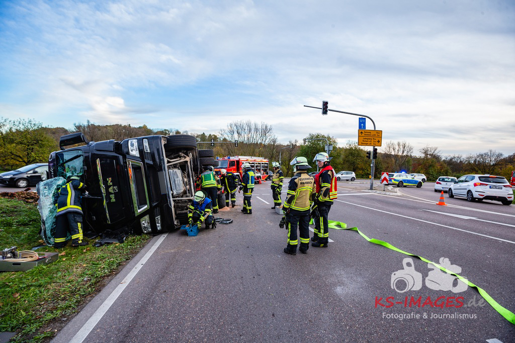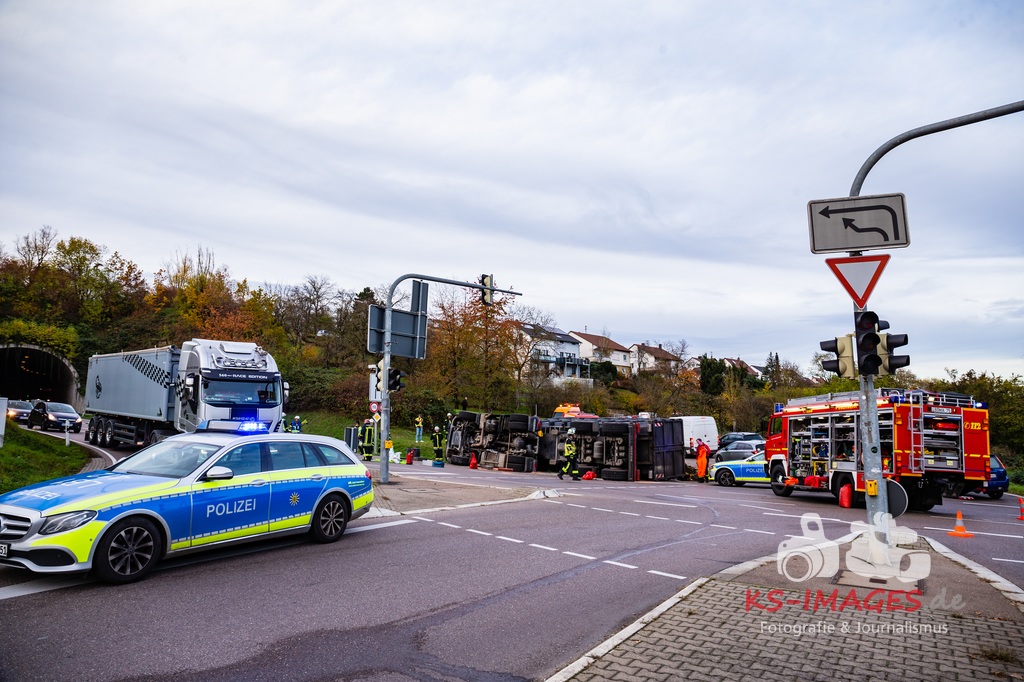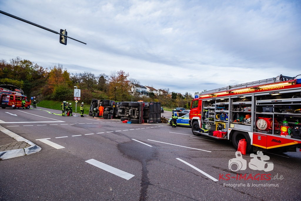 MURR: Beim Einfahren von der L 1100 in die L 1125 in Richtung Murr ist am Donnerstag gegen 15:00 Uhr ein mit Biomüll beladener Lkw samt Anhänger mit einem Gesamtgewicht von über 40 Tonnen umgekippt. Dabei wurde auch die dortige Ampelanlage stark beschädigt. Der 35-jährige Fahrer des Lkw zog sich mutmaßlich leichtere Verletzungen zu und wurde vom Rettungsdienst ins Krankenhaus gebracht. Die Fahrerin eines nachfolgenden Pkw verletzte sich leicht an Glasscherben.