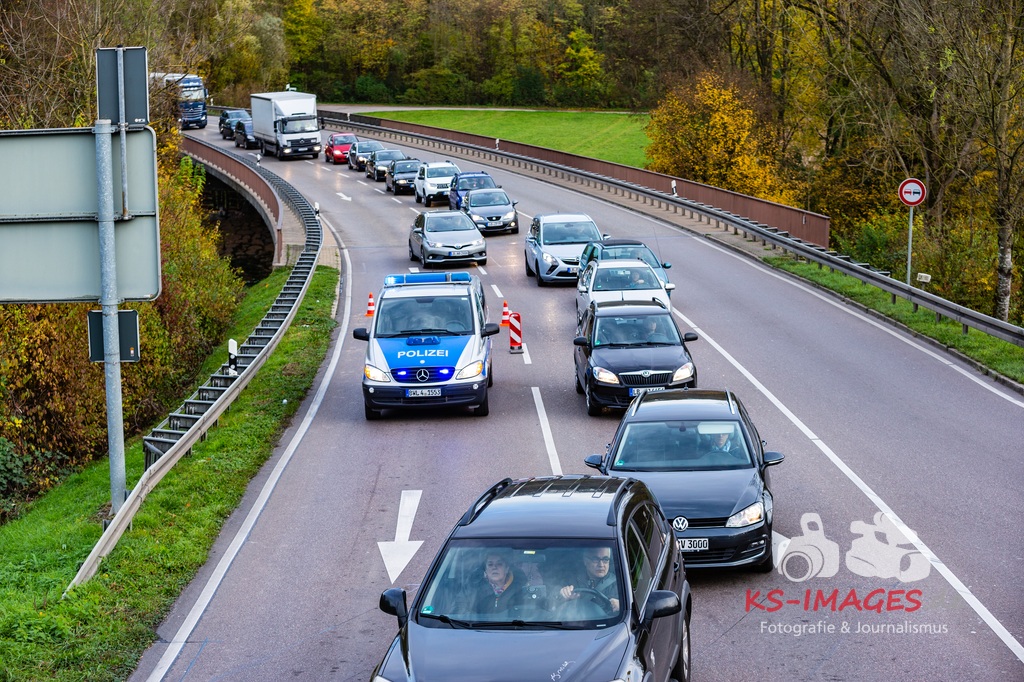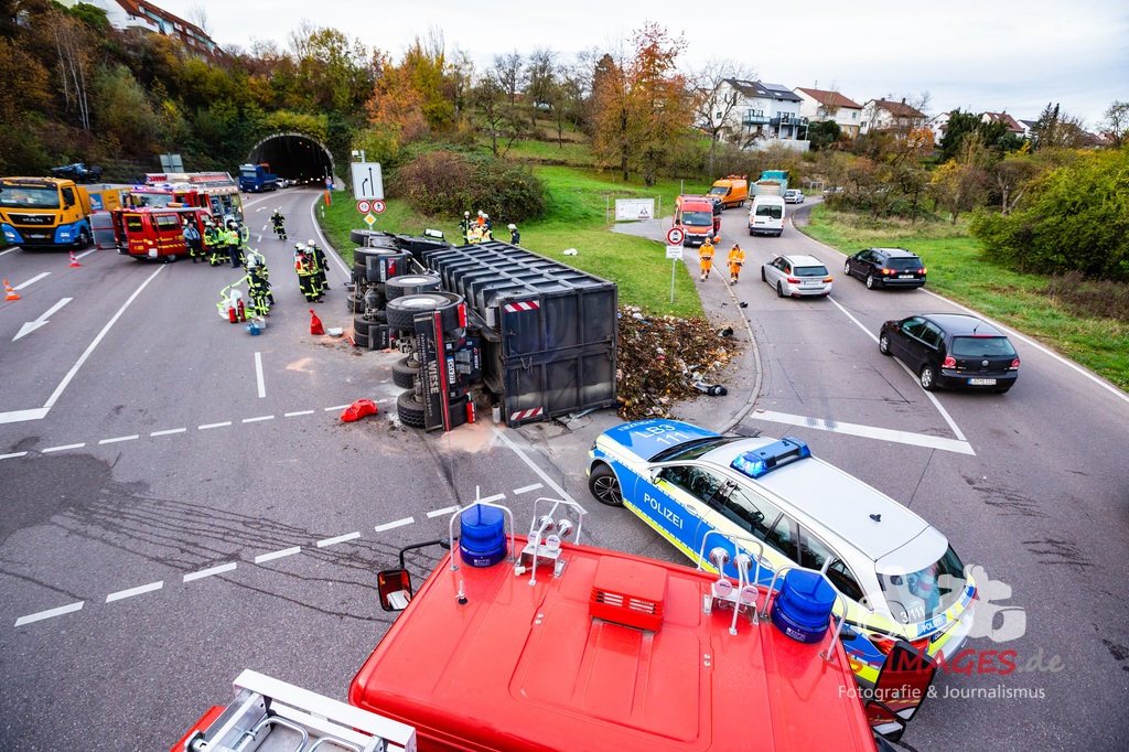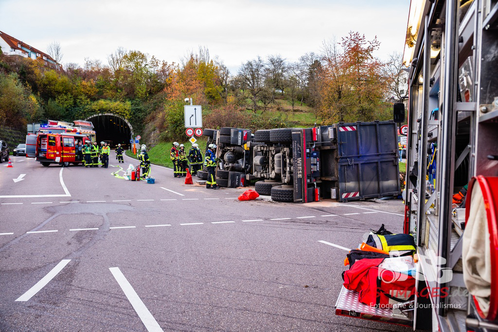 Vor der Bergung des Lkw-Gespanns muss die zum Teil auf der Fahrbahn verteilte Ladung mit einem Radlader abgetragen werden. Diese Arbeiten werden gerade durchgeführt. Die Durchfahrt durch den Bergkeltertunnel von und zur A 81 ist möglich, allerdingen kommt es derzeit zu erheblichen Behinderungen.