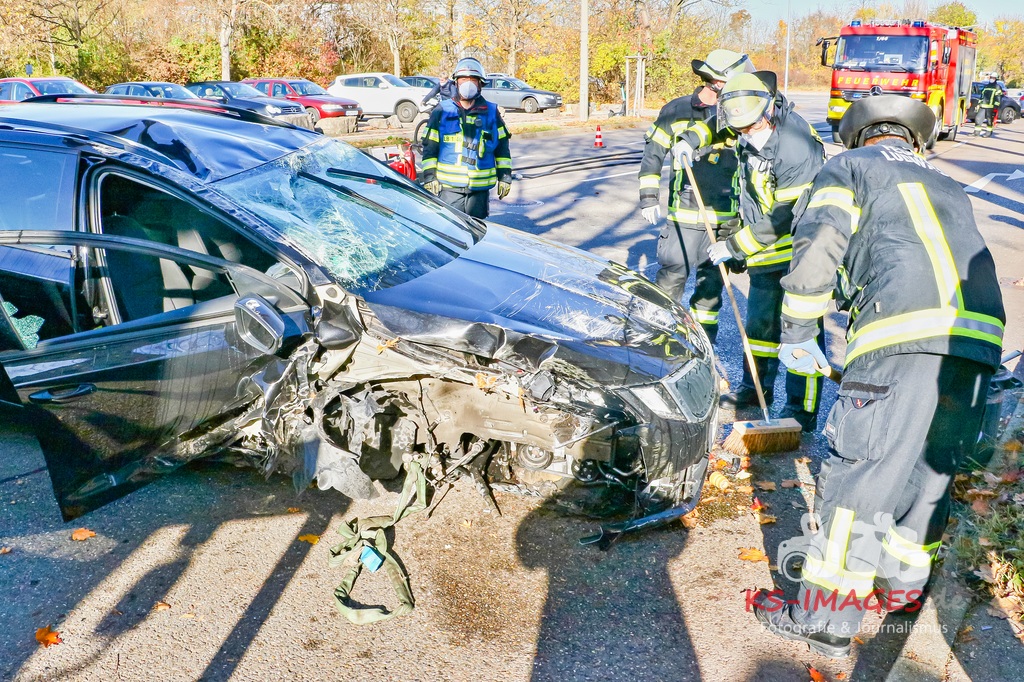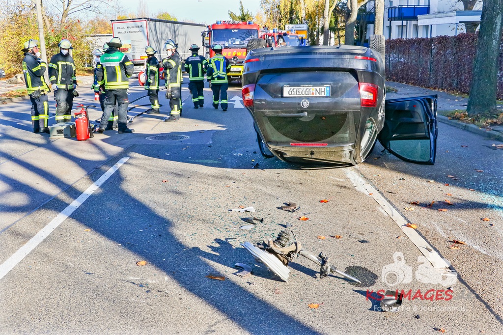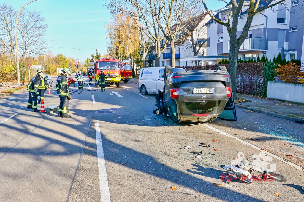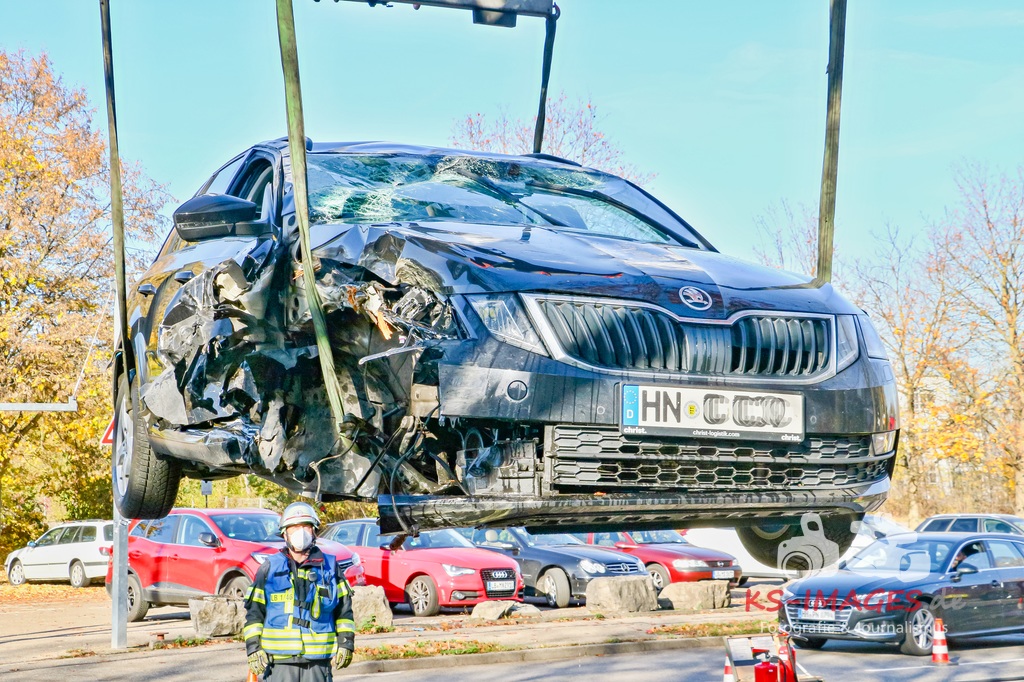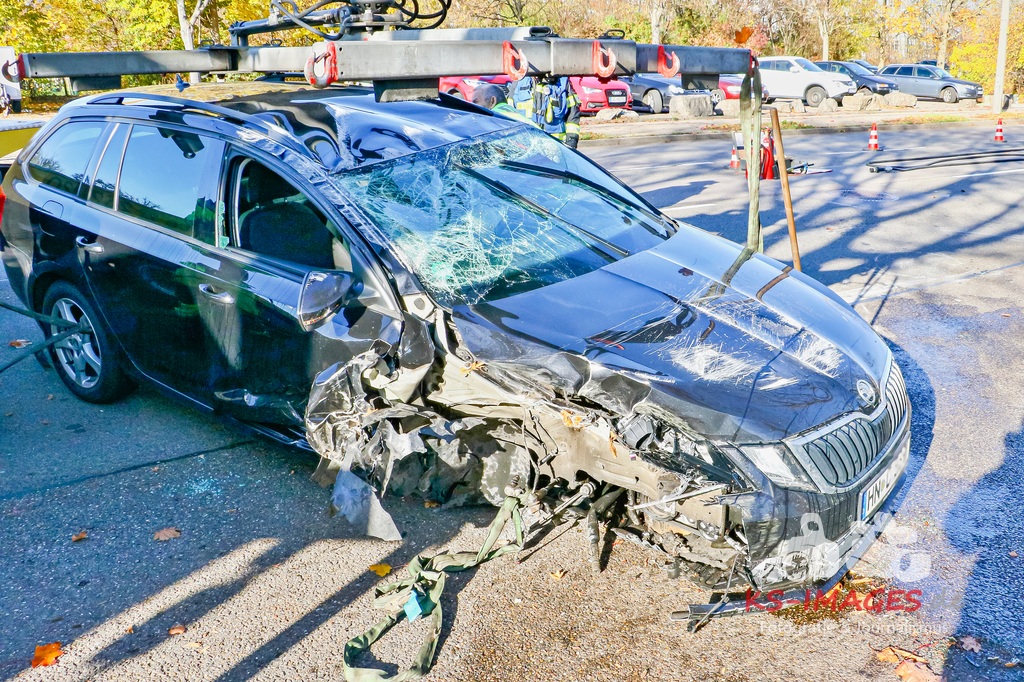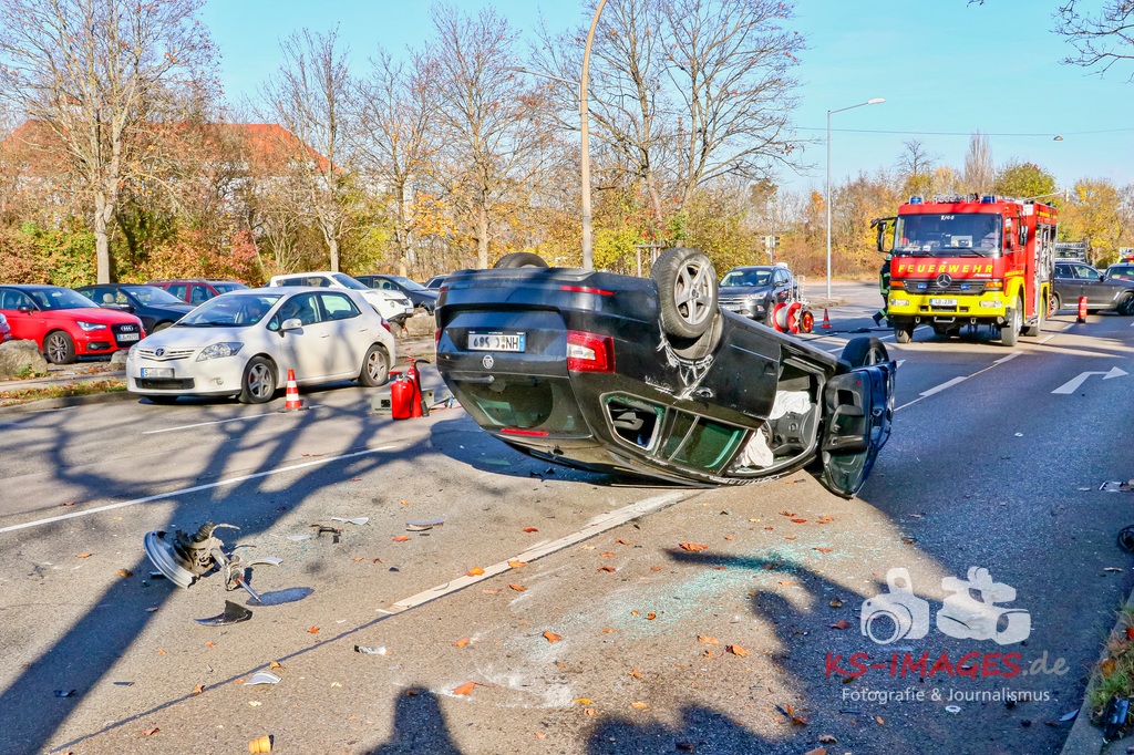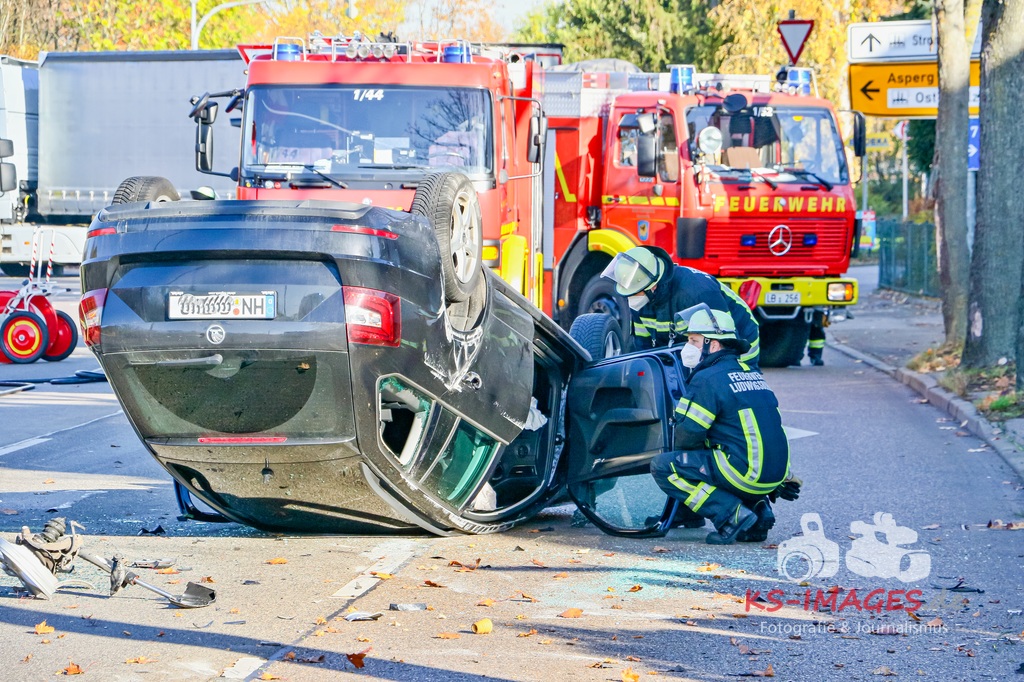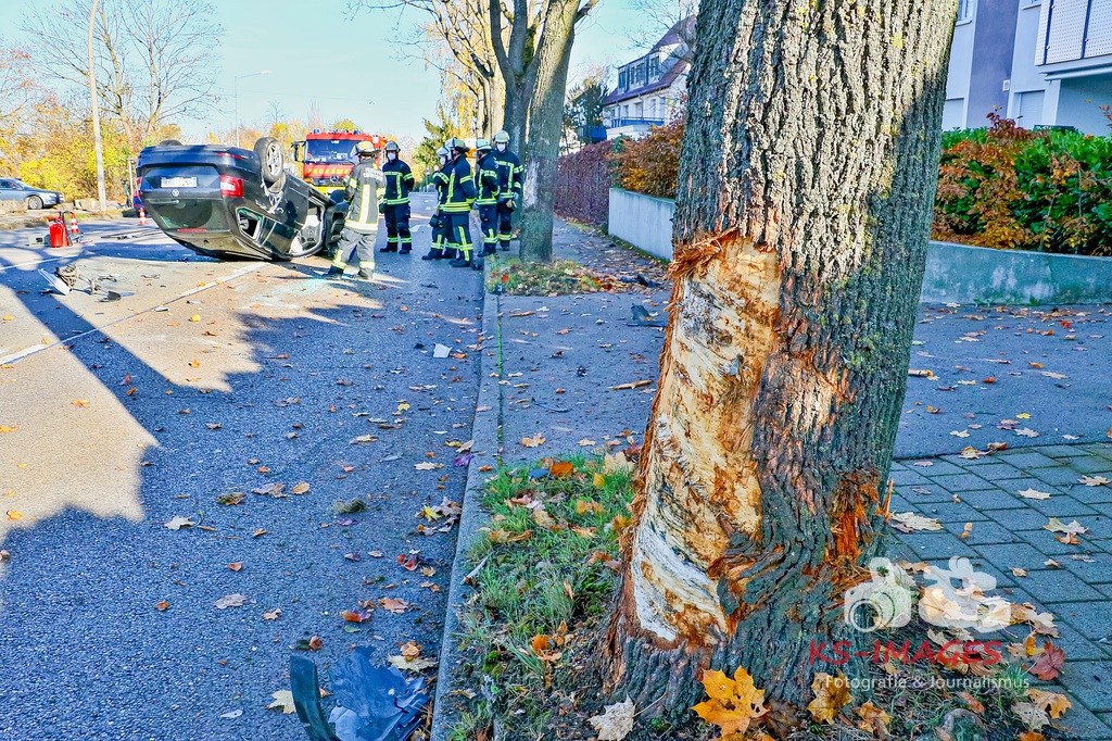 Fotostrecke: Gegen den Baum geprallt und überschlagen Skoda-Fahrer verletzt ins Krankenhaus. Ludwigsburg Schlieffenstrasse 09.11.2021
