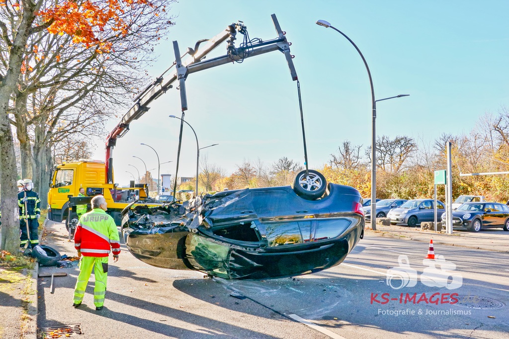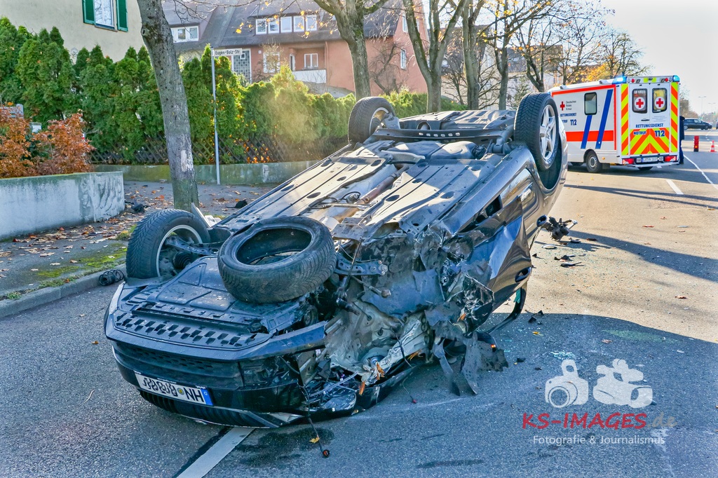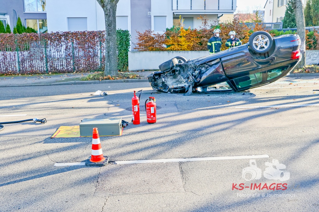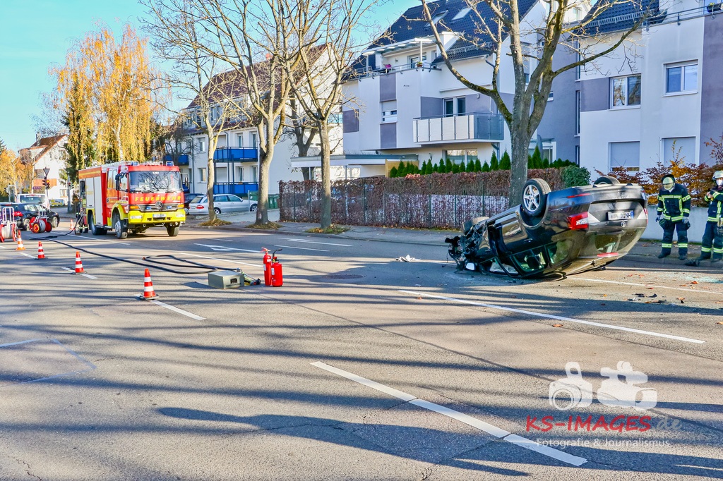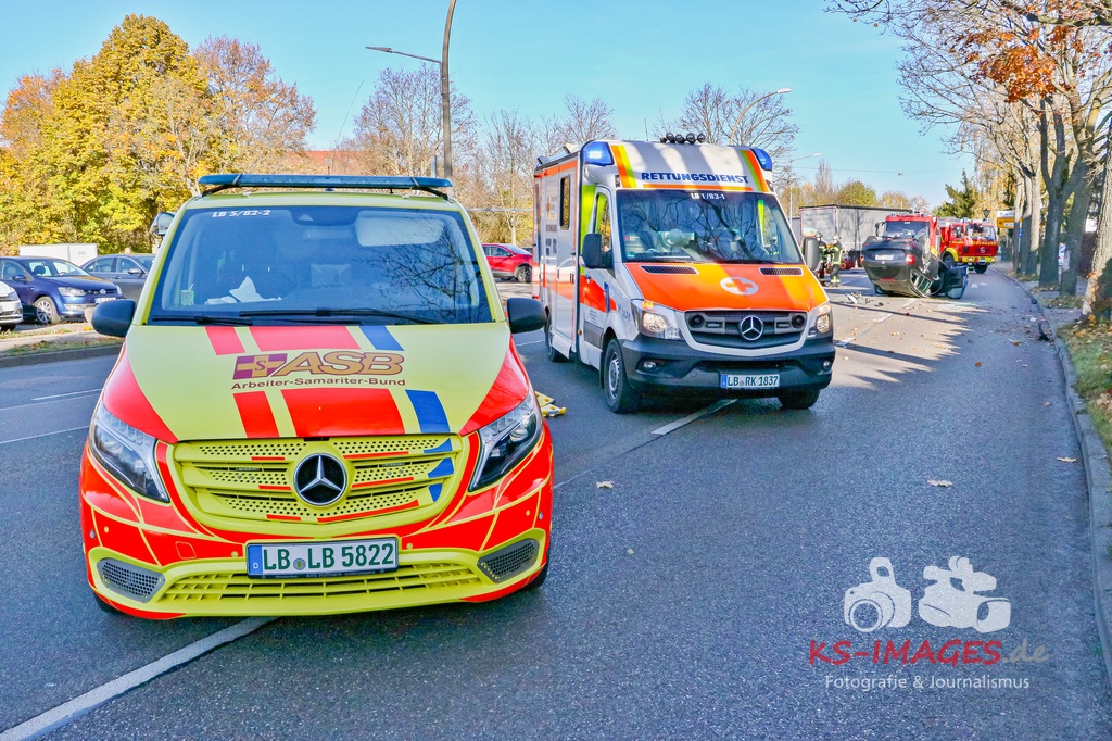 In Höhe Eugen-Bolz-Strasse kam er aus noch ungeklärter Ursache von der Fahrbahn ab, prallte gegen einen Baum. Das Fahrzeug überschlug sich, kam in Dachlage zum Stehen. Feuerwehr, Rettungsdienst und Notarzt eilten zur Unfallstelle. Der Fahrer kam verletzt in das Krankenhaus, die Feuerwehr Ludwigsburg sicherte die Einsatzstelle zur Patientenversorgung sowie Bergungsarbeiten ab, ausgelaufene Betriebsstoffe mussten aufgefangen werden. (Fotos: Andreas Rometsch)