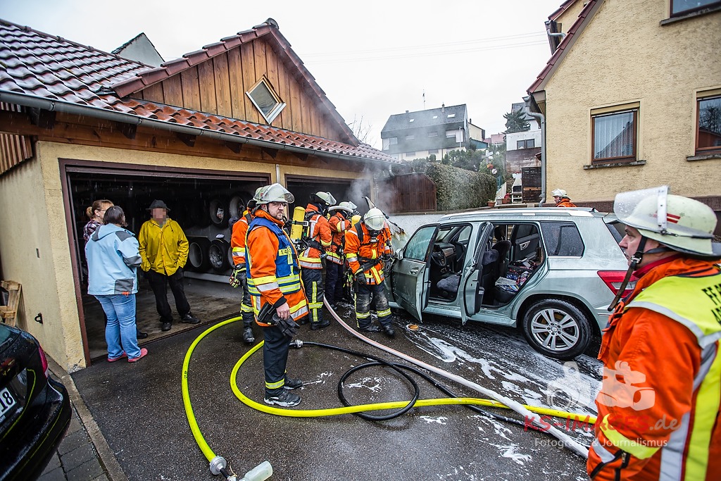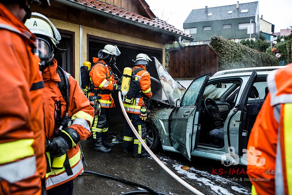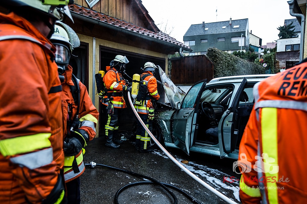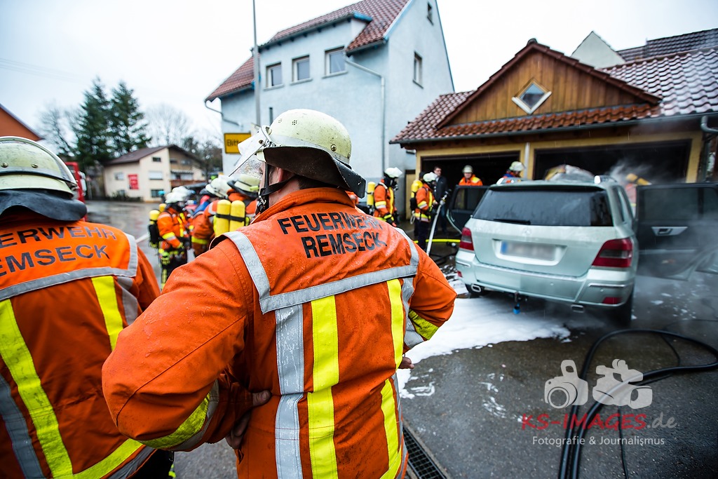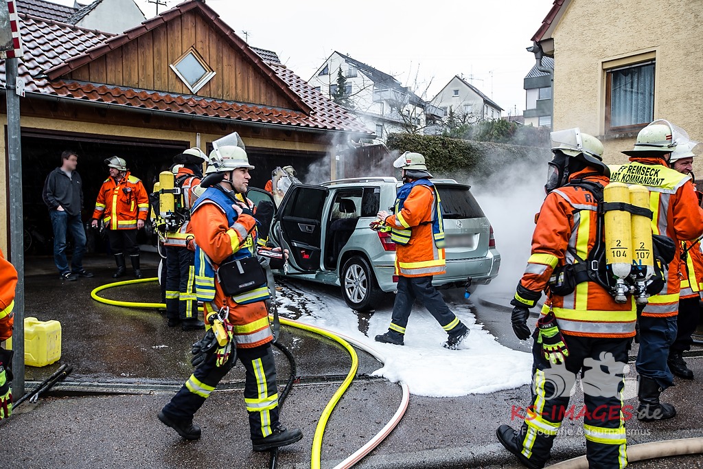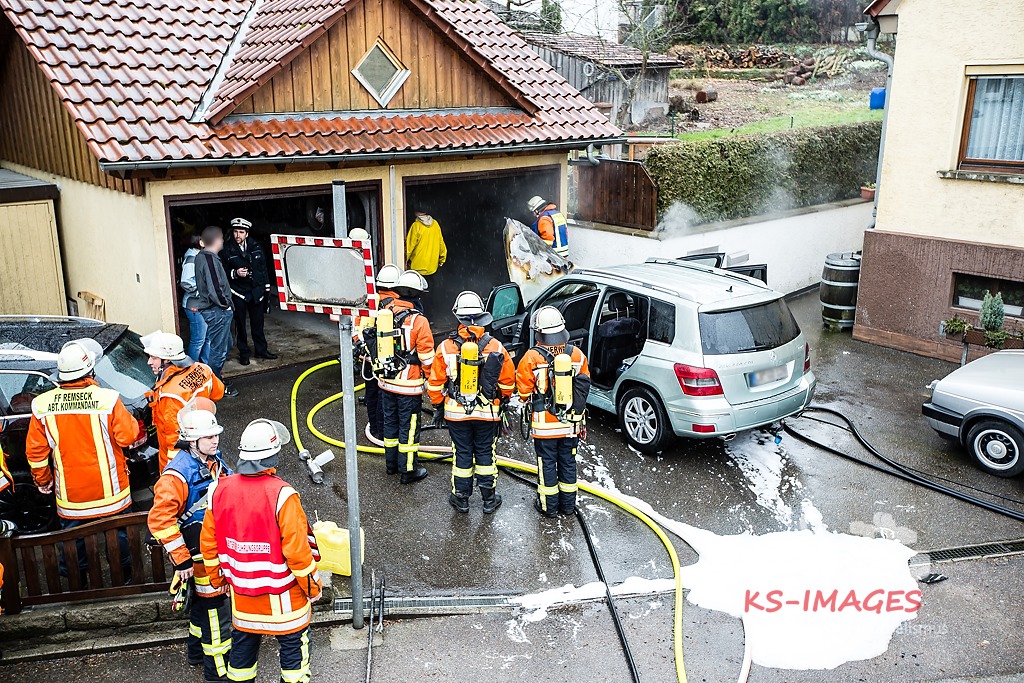 REMSECK: Vermutlich aufgrund eines technischen Defekts entzündete sich am Dienstag gegen 09.45 Uhr ein Mercedes Geländewagen, der in einer Garage in der Hochberger Straße stand, selbst. Die Freiwillige Feuerwehr Remseck rückte daraufhin mit 28 Einsatzkräften und vier Fahrzeugen zum Brandort aus und löschte die Flammen. Am Garagengebäude, an das keine Wohneinheiten angrenzen, entstand glücklicherweise kein Schaden. Allerdings beläuft sich der Sachschaden am PKW auf etwa 25.000 Euro.