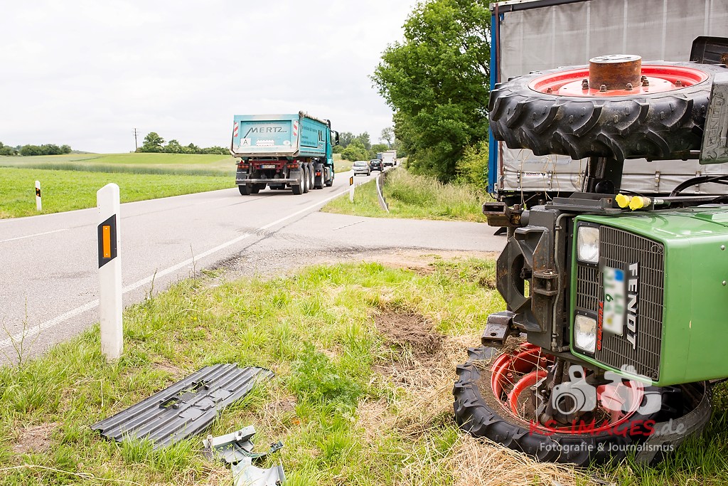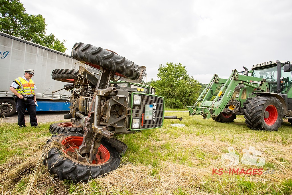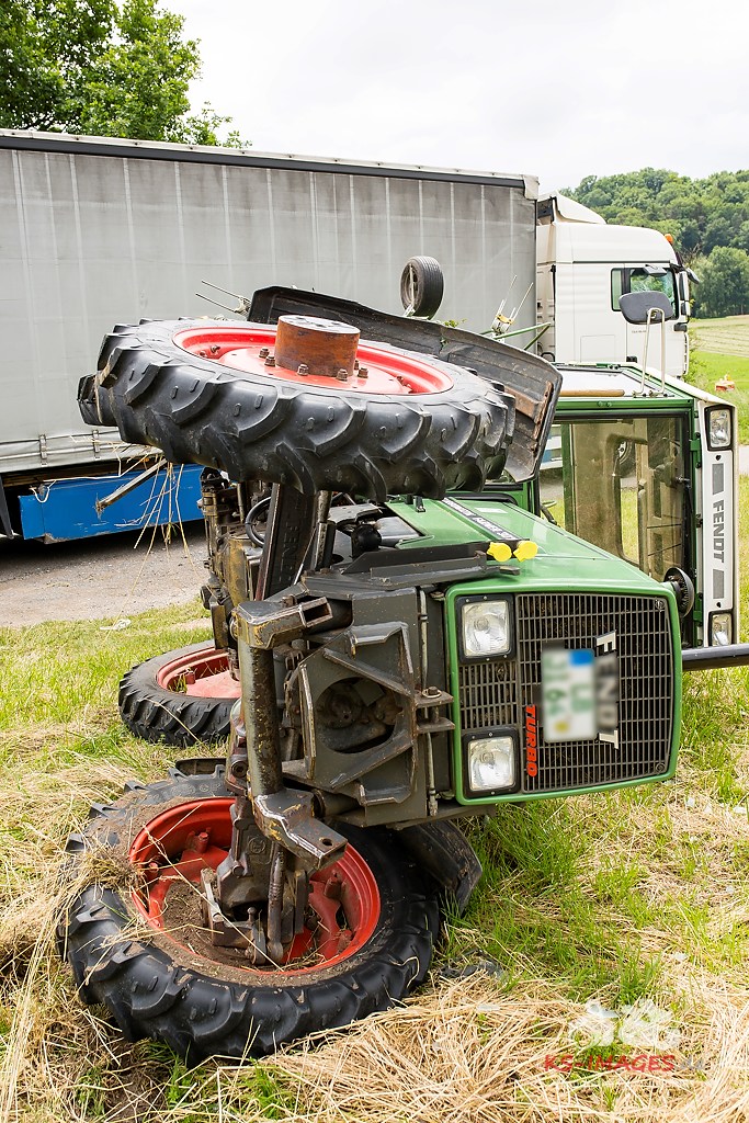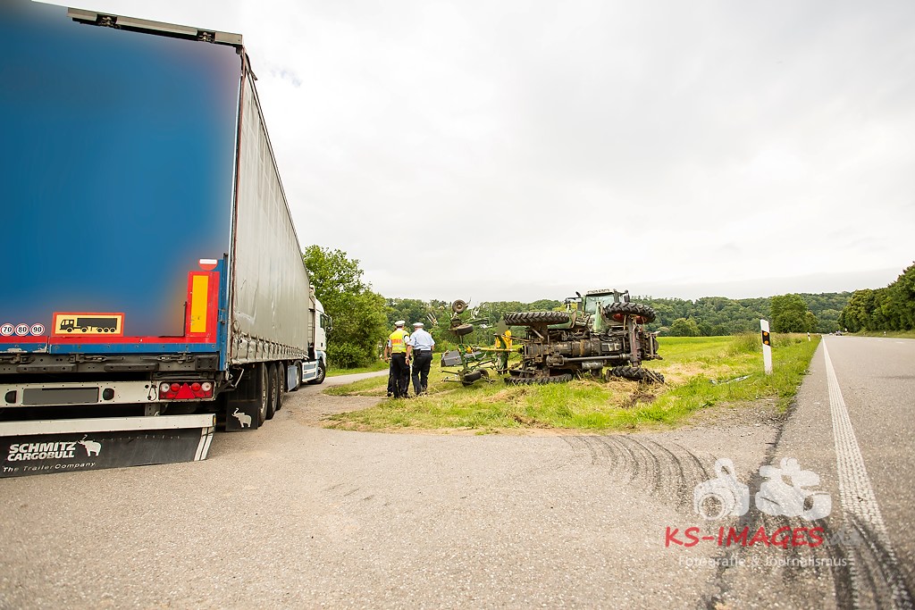 Ludwigsburg: Am 01.06.2015 gegen 11.30 Uhr kam es auf der Bundesstraße 10 im Bereich Vaihingen/Enz zu einem Verkehrsunfall zwischen einem Traktor mit Anhänger und einer Sattelzugmaschine. Der 51-jährige Fahrer der Sattelzugmaschine wollte den vor ihm fahrenden Traktor eines 18-Jährigen überholen, als er in Richtung Pforzheim unterwegs war. Der 18-Jährige wollte während des Überholvorgangs seinerseits nach links auf einen Feldweg abbiegen und stieß mit dem Überholer zusammen. Durch den Aufprall kippte der Traktor nach rechts auf die Seite, wobei sich der 18-Jährige schwer verletzte und vom Rettungsdienst in ein Krankenhaus gebracht wurde. Der Fahrer der Sattelzugmaschine blieb unverletzt. Der umgekippte Traktor wurde mit einem weiteren Traktor wieder auf die Räder gestellt. Der Gesamtschaden liegt bei etwa 15.000 Euro.