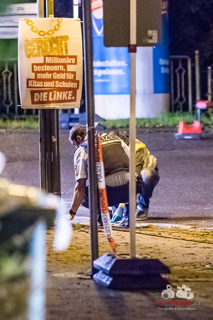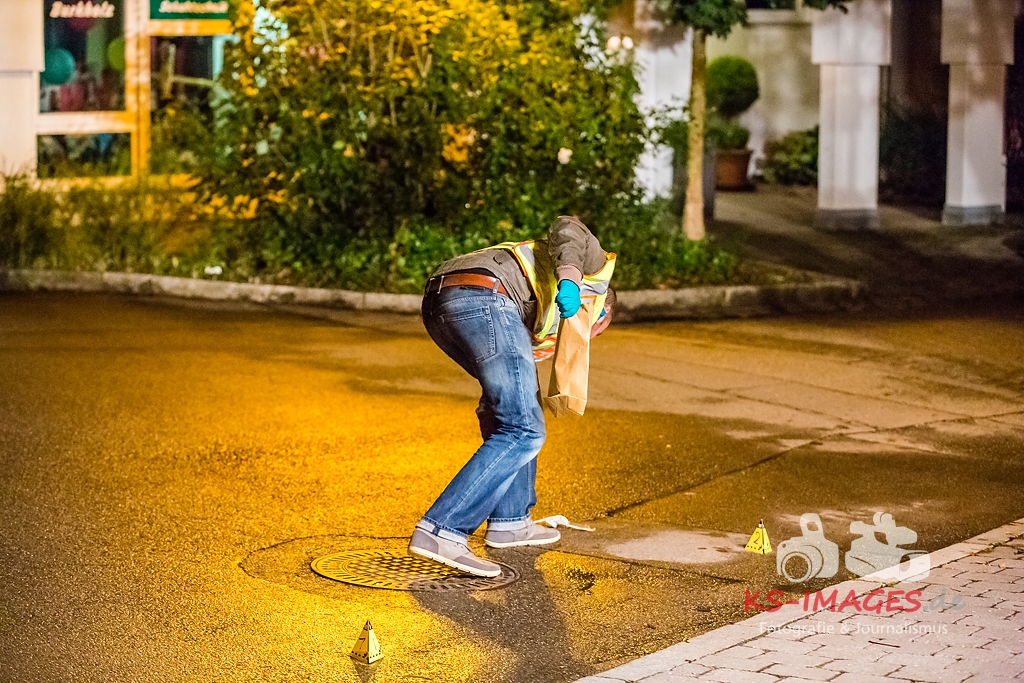 Streit im Straßenverkehr eskalieren das Schüsse fallen - Pizzabote angeschossen - Tatort gesichert mit Einsatzkräften in Anti Terror Schutzanzügen