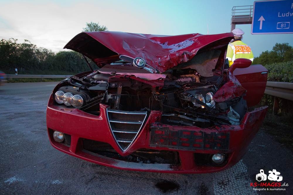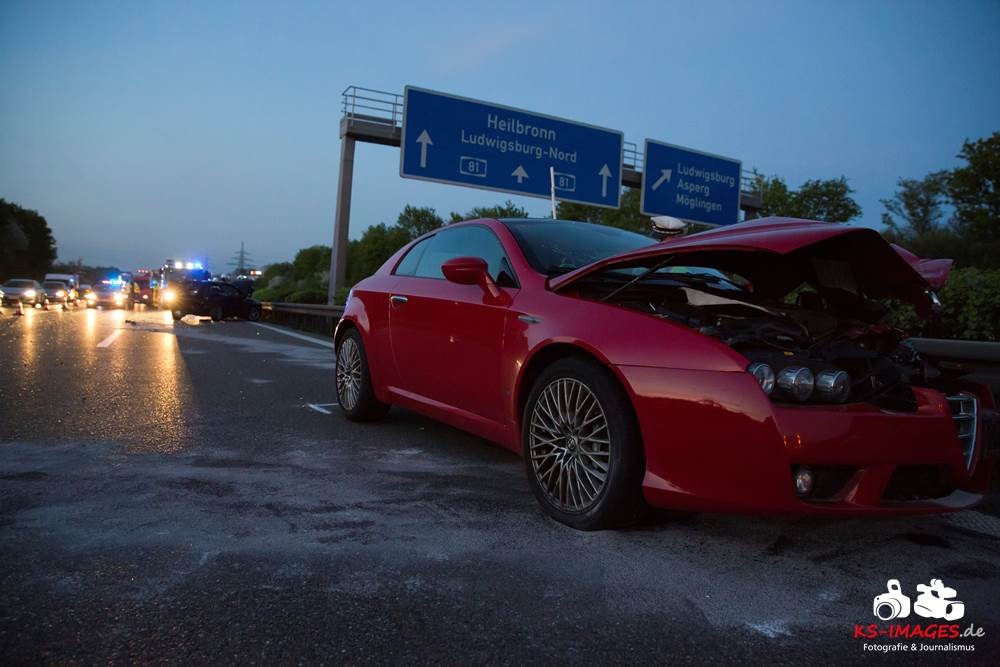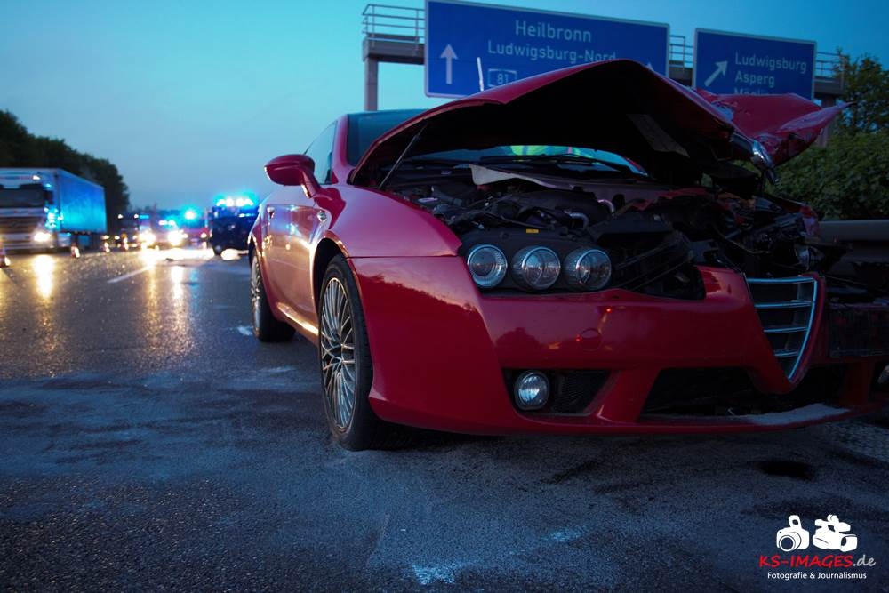 BAB 81 – Gemarkung Möglingen: Verkehrsunfall mit leicht verletzter Person führt zu Stau: Ein Stau mit bis zu sieben Kilometern Länge war am Donnerstag die Folge eines Verkehrsunfalls, der sich gegen 19:15 Uhr zwischen den Anschlussstellen Ludwigsburg-Nord und Stuttgart-Zuffenhausen ereignete. Ein 28-Jähriger blieb mit seinem Alfa Romeo aufgrund eines technischen Defekts auf dem linken Fahrstreifen stehen. Ein 65-jähriger Lenker eines Lancia erkannte den abgesicherten Wagen vermutlich zu spät und fuhr auf den Alfa Romeo auf. Der 65-Jährige wurde leicht verletzt und musste mit dem Rettungsdienst in ein Krankenhaus gebracht werden. An beiden Fahrzeugen entstand Totalschaden in Höhe von insgesamt etwa 20.000 Euro. Sie waren nicht mehr fahrbereit und mussten abgeschleppt werden. Vor Ort waren die Feuerwehren Möglingen, Ludwigsburg und Asperg mit zehn Fahrzeugen und 44 Wehrleuten sowie der Rettungsdienst und die Autobahnmeisterei Ludwigsburg im Einsatz.