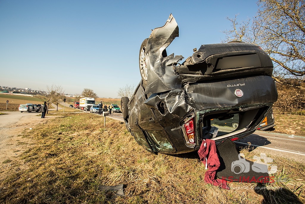 Eine schwer und eine leicht verletzte Personen sowie ein Sachschaden von etwa 26.000 Euro sind die Bilanz eines Unfalls, der sich am Montag gegen 07.50 Uhr auf der Kreisstraße 1671 zwischen Tamm und Markgröningen ereignete. Ein 47-jähriger Jaguar-Fahrer und eine 22 Jahre alte Fiat-Lenkerin fuhren auf dieser Strecke zunächst hinter einander her. Als der 47-Jährige seinen PKW verkehrsbedingt anhielt, bremste die junge Frau ebenfalls ab. Mutmaßlich aus Unachtsamkeit bemerkte ein 32 Jahre alter Sprinter-Fahrer zu spät, dass die Fahrzeuge vor ihm zum Stehen gekommen waren und kollidierte mit dem PKW der jungen Frau. Dieser schleuderte in der Folge nach links auf die Gegenfahrbahn und stieß dort mit dem Renault eines 26-Jährigen zusammen. Durch die Wucht dieses Aufpralls überschlug sich der Fiat und blieb schlussendlich auf dem Dach liegen. Gleichzeitig prallte der Sprinter auch noch gegen den Jaguar des 47-Jährigen und kam dann nach rechts von Fahrbahn ab. Die junge Fiat-Fahrerin erlitt schwere Verletzungen und musste, wie auch der 26 Jahre alte leicht verletzte Renault-Fahrer, mit dem Rettungsdienst in ein Krankenhaus eingeliefert werden. Der Sprinter, der Fiat und der Renault waren nicht mehr fahrbereit und wurden abgeschleppt. Während der Unfallaufnahme war die Strecke zwischen Tamm und Markgröningen bis etwa gegen 10.20 Uhr gesperrt.