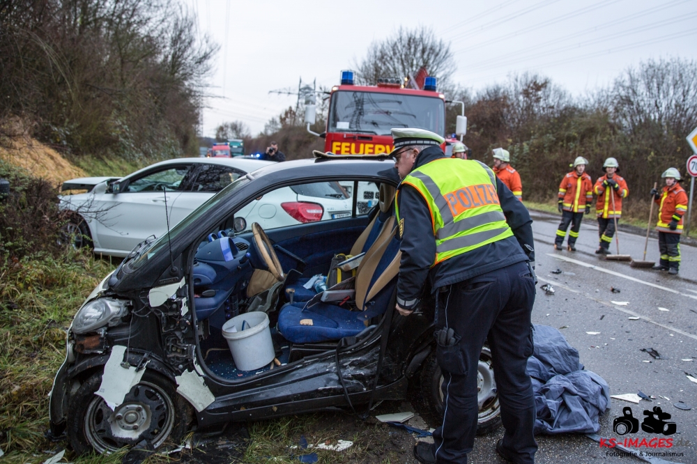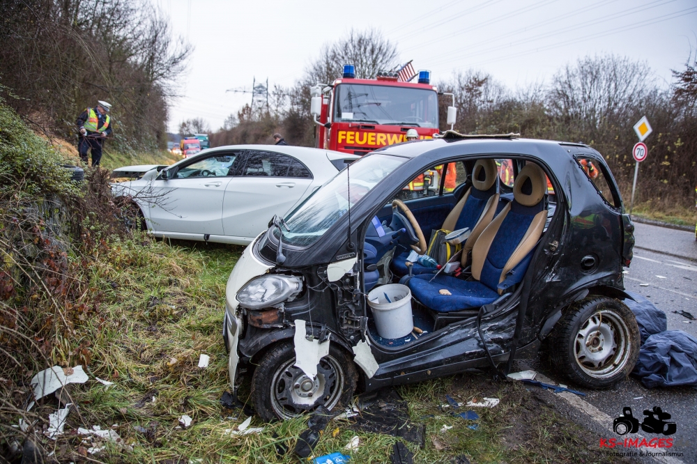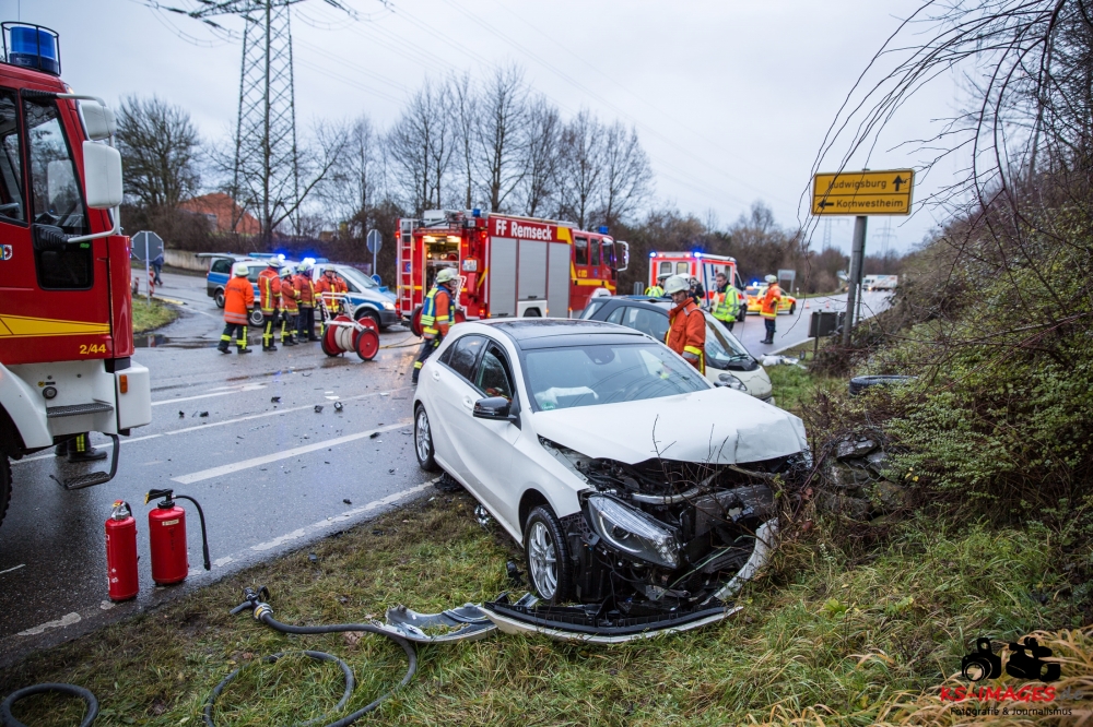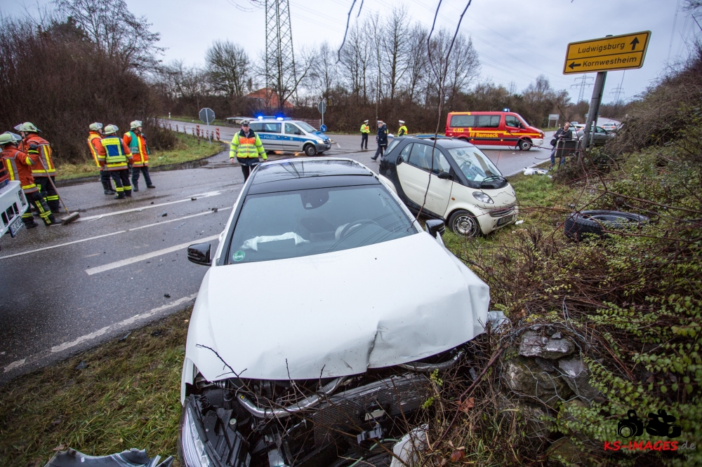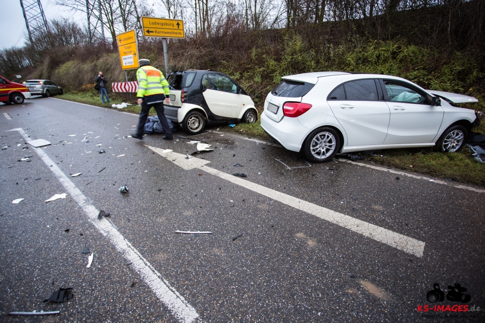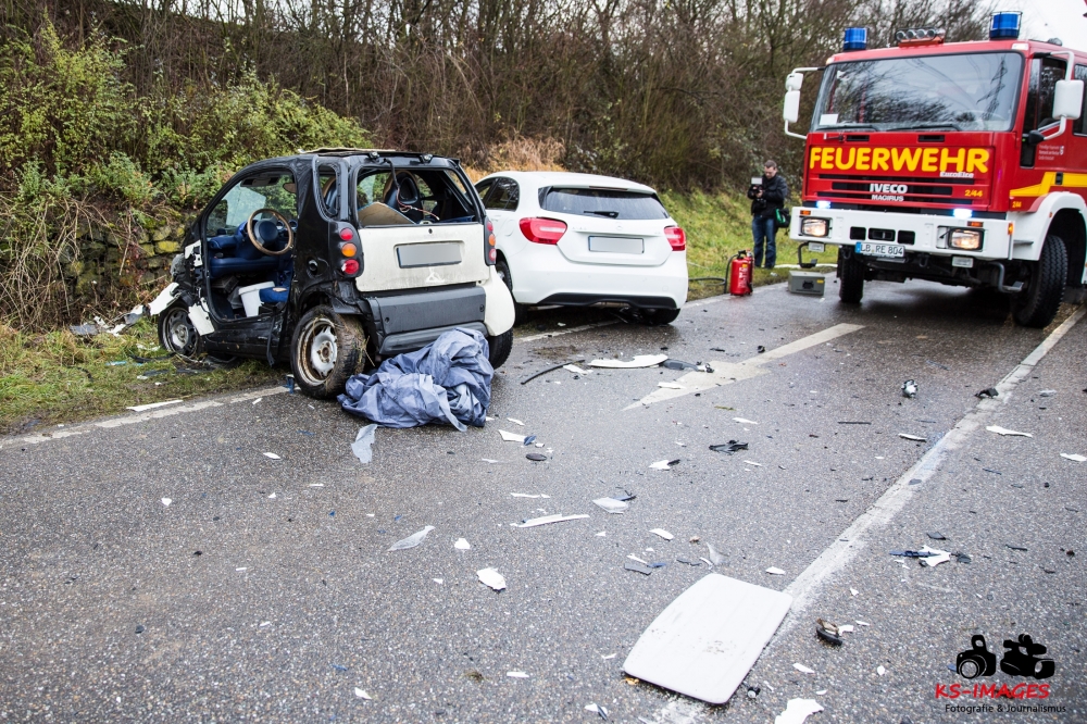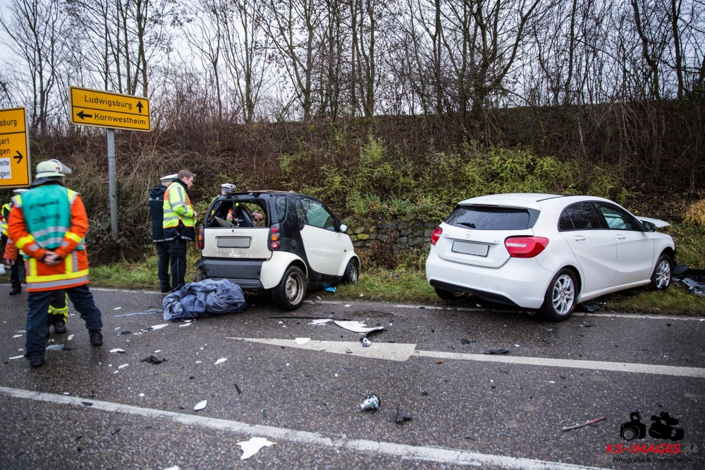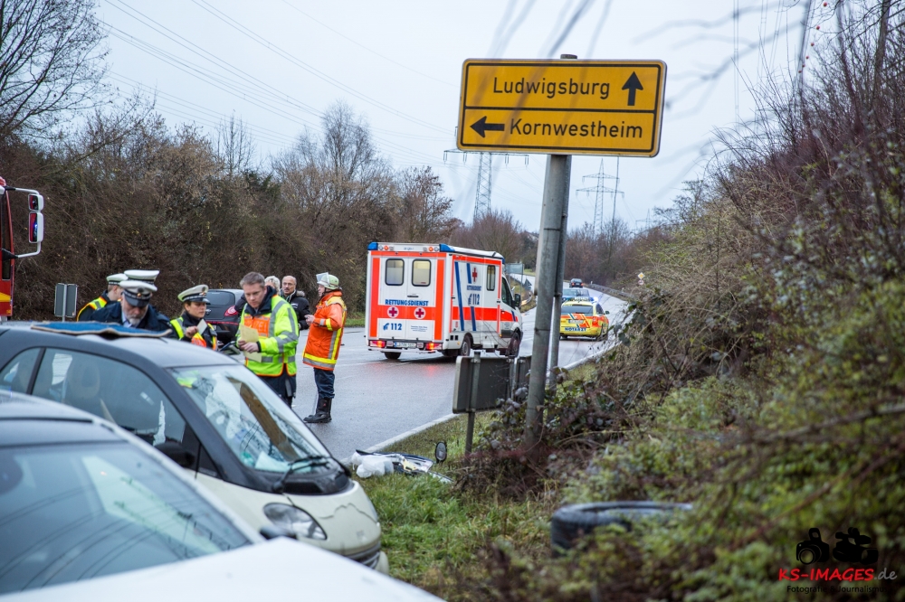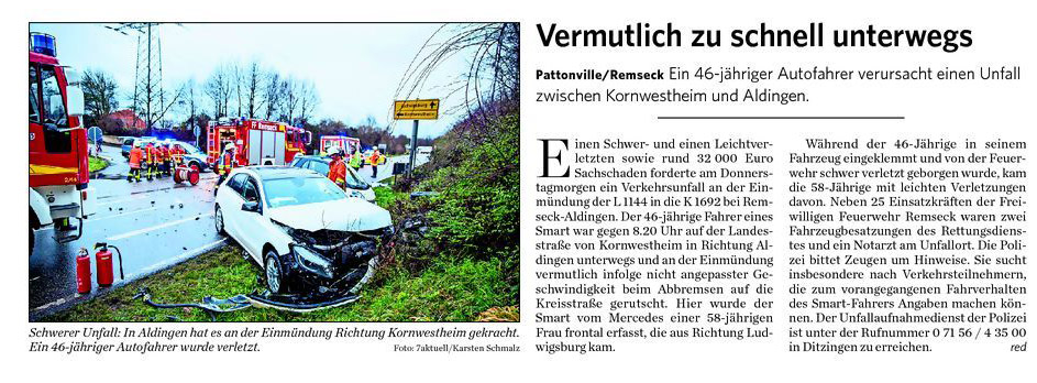 die K 1692 bei Remseck-Aldingen. Der 46-jährige Fahrer eines Smart war gegen 08:20 Uhr auf der Landesstraße von Kornwestheim in Richtung Aldingen unterwegs und an der Einmündung vermutlich infolge nicht angepasster Geschwindigkeit beim Abbremsen auf die Kreisstraße gerutscht. Hier wurde der Smart vom Mercedes einer 58-jährigen Frau frontal erfasst, die aus Richtung Ludwigsburg kommend herangefahren war. Während der 46-Jährige in seinem Fahrzeug eingeklemmt und von der Feuerwehr schwer verletzt geborgen wurde, kam die 58-Jährige mit leichten Verletzungen davon. Neben 25 Einsatzkräften der Freiwilligen Feuerwehr Remseck waren zwei Fahrzeugbesatzungen des Rettungsdienstes und ein Notarzt am Unfallort. Zeugen des Verkehrsunfalls und insbesondere Verkehrsteilnehmer, die Angaben zum vorangegangenen Fahrverhalten des Smart-Fahrers machen können, werden gebeten, sich mit dem Unfallaufnahmedienst der Verkehrspolizei, Tel. 07156/4350-0, in Verbindung zu setzen. (Quelle: Polizeipräsidium Ludwigsburg)