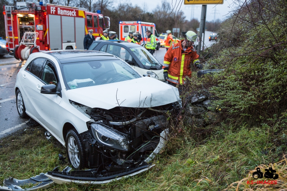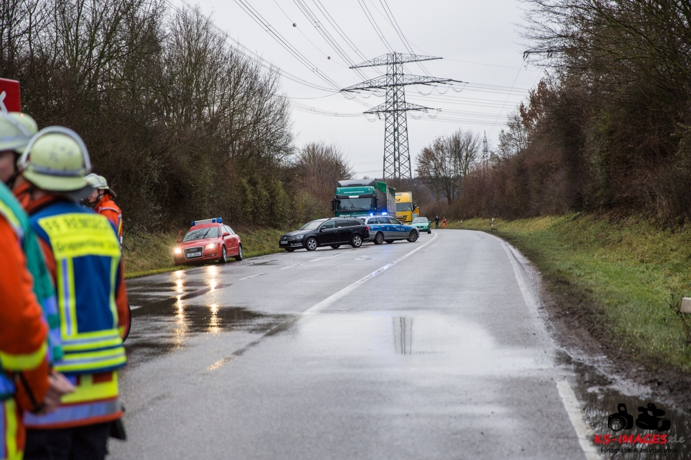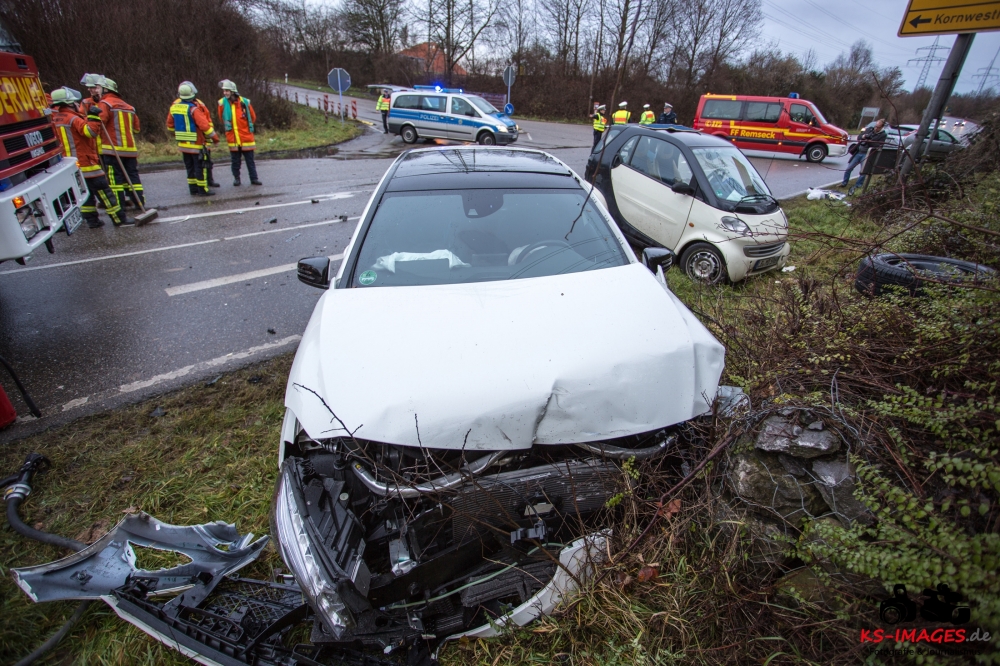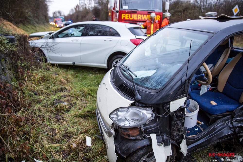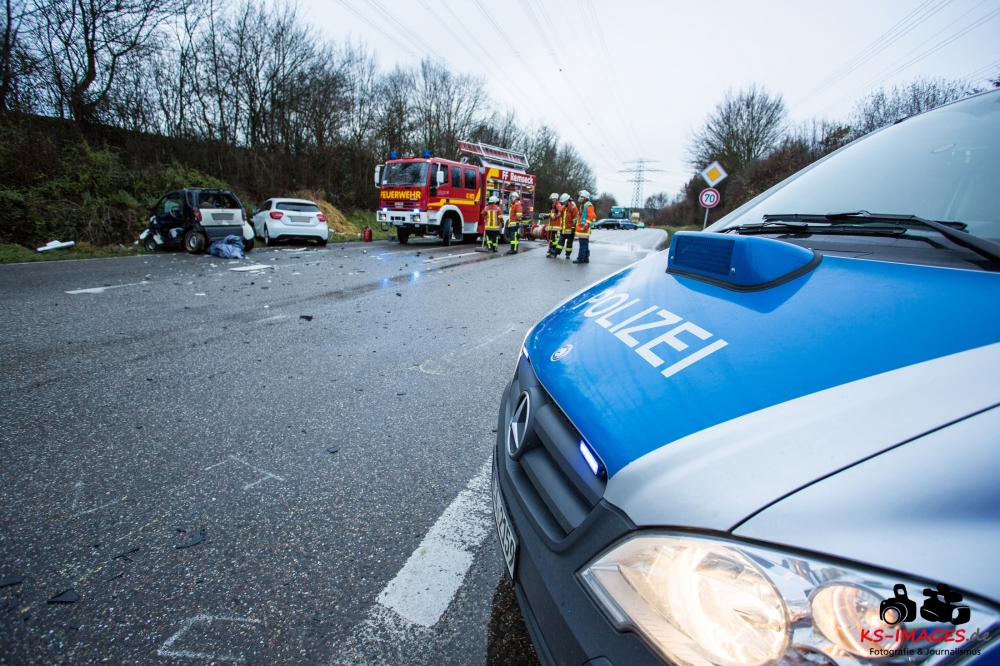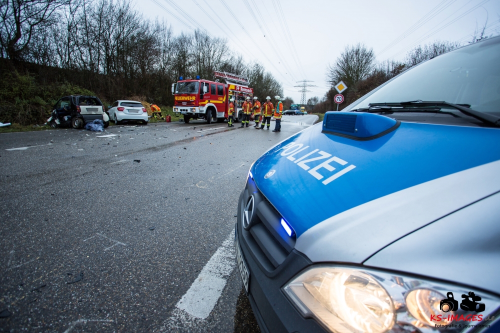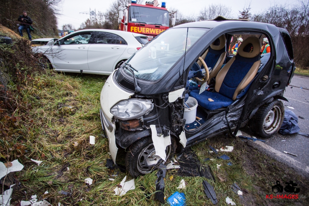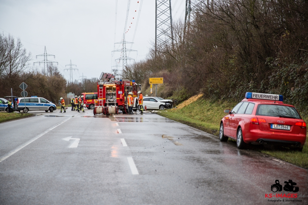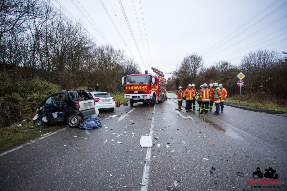die K 1692 bei Remseck-Aldingen. Der 46-jährige Fahrer eines Smart war gegen 08:20 Uhr auf der Landesstraße von Kornwestheim in Richtung Aldingen unterwegs und an der Einmündung vermutlich infolge nicht angepasster Geschwindigkeit beim Abbremsen auf die Kreisstraße gerutscht. Hier wurde der Smart vom Mercedes einer 58-jährigen Frau frontal erfasst, die aus Richtung Ludwigsburg kommend herangefahren war. Während der 46-Jährige in seinem Fahrzeug eingeklemmt und von der Feuerwehr schwer verletzt geborgen wurde, kam die 58-Jährige mit leichten Verletzungen davon. Neben 25 Einsatzkräften der Freiwilligen Feuerwehr Remseck waren zwei Fahrzeugbesatzungen des Rettungsdienstes und ein Notarzt am Unfallort. Zeugen des Verkehrsunfalls und insbesondere Verkehrsteilnehmer, die Angaben zum vorangegangenen Fahrverhalten des Smart-Fahrers machen können, werden gebeten, sich mit dem Unfallaufnahmedienst der Verkehrspolizei, Tel. 07156/4350-0, in Verbindung zu setzen. (Quelle: Polizeipräsidium Ludwigsburg)