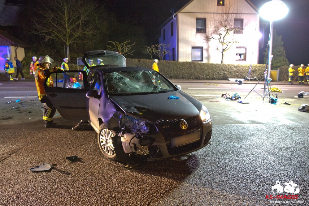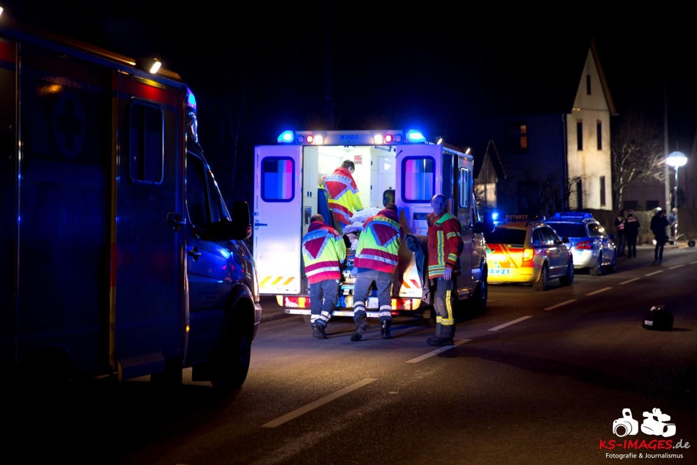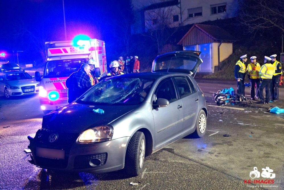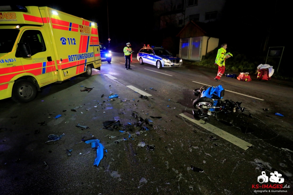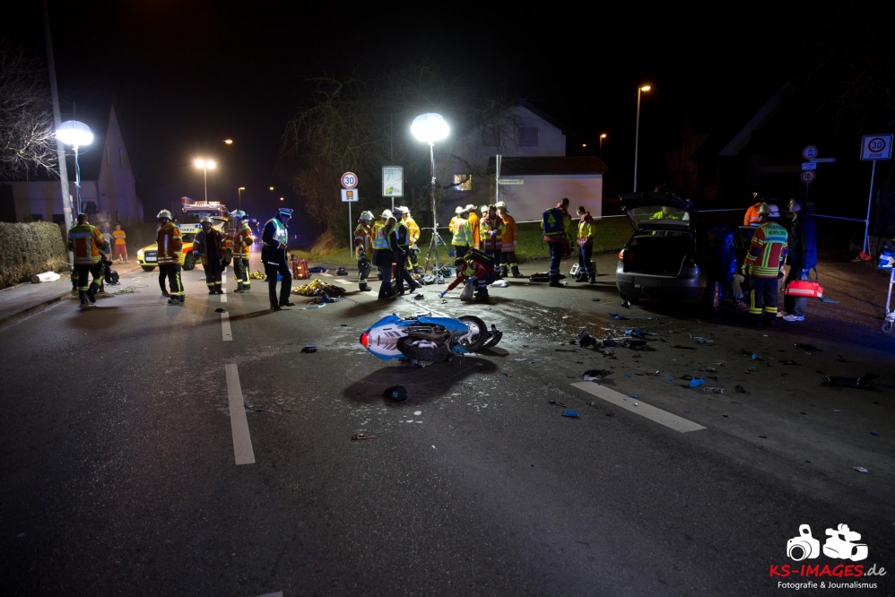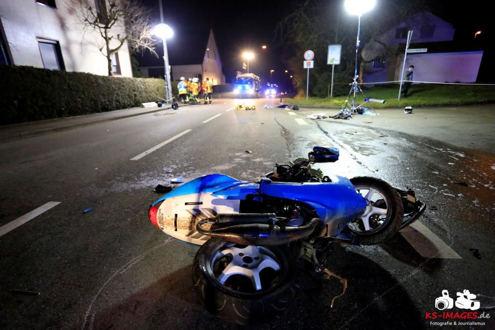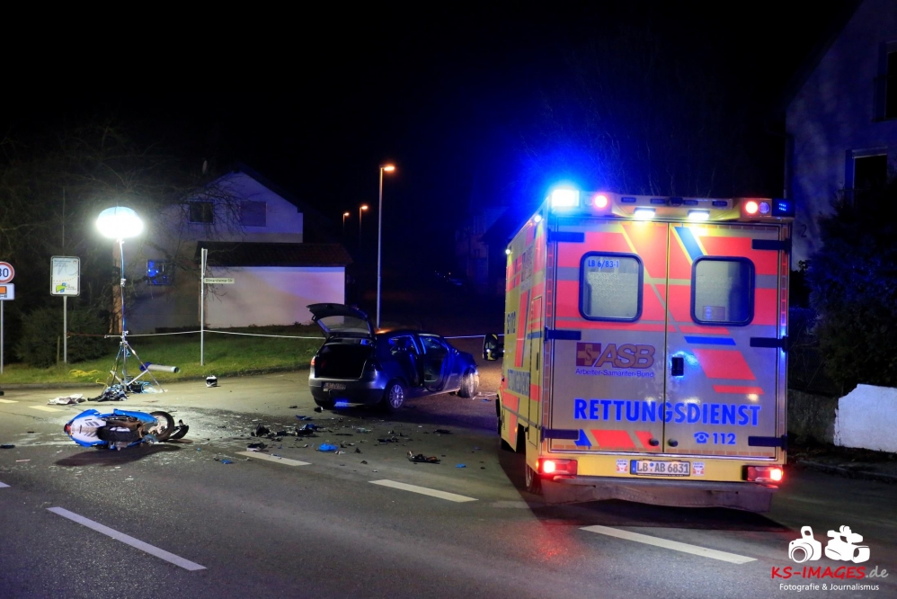 Mit schweren Verletzungen mussten am Mittwochabend zwei 17-Jährige nach einem Verkehrsunfall an der Einmündung Großbottwarer Straße/Ottmarsheimer Straße ins Unfall mit Rollerbeteiligung 2 Jugendliche in LebensgefahrKrankenhaus gebracht werden. Der Sozius schwebt derzeit noch in Lebensgefahr und wird intensivmedizinisch versorgt. Ein 55-jähriger Autofahrer war gegen 18:50 Uhr auf der Großbottwarer Straße in Richtung Ortsausgang unterwegs und übersah beim Linksabbiegen in die Ottmarsheimer Straße den entgegenkommenden Roller der beiden Jugendlichen. Den polizeilichen Ermittlungen zufolge hatten die Jugendlichen Schutzhelme getragen. Die beiden Fahrzeuge waren nach der Kollision nicht mehr fahrbereit und wurden von der Polizei sichergestellt. Für die Dauer der Unfallaufnahme und der Bergungsarbeiten musste die Großbottwarer Straße in beiden Richtungen bis gegen 22:00 Uhr gesperrt werden. An der Unfallstelle waren fünf Fahrzeuge des Rettungsdienstes mit zwei Notärzten, vier Streifenbesatzungen der Polizei und 19 Einsatzkräfte der Freiwilligen Feuerwehr Mundelsheim im Einsatz. Die Feuerwehr übernahm die Ausleuchtung des Unfallortes und die Reinigung der Fahrbahn.